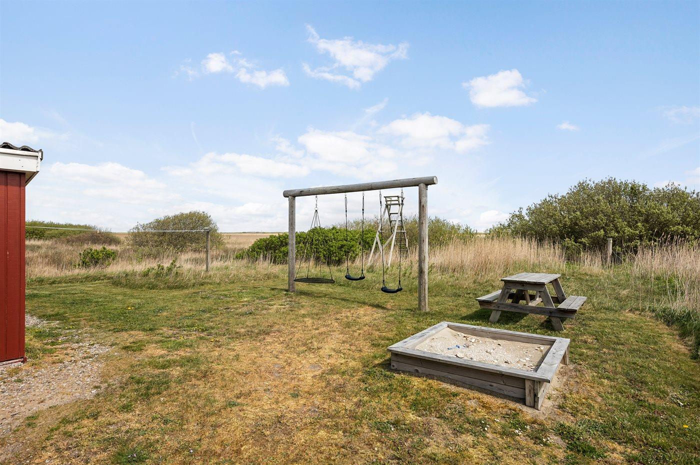 Ferieboligen er beliggende på en 1200 m² stor naturgrund. Der er 700 m til havet. Nærmeste forretning er beliggende i en afstand af 1500 m. Til ferieboligen hører 80 m² terrasseareal. Desuden er der 15 m² overdækket terrasse. Der er redskabsrum. Gynge. Sandkasse. Parkering ved ferieboligen.