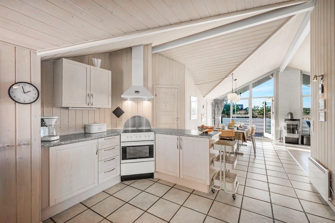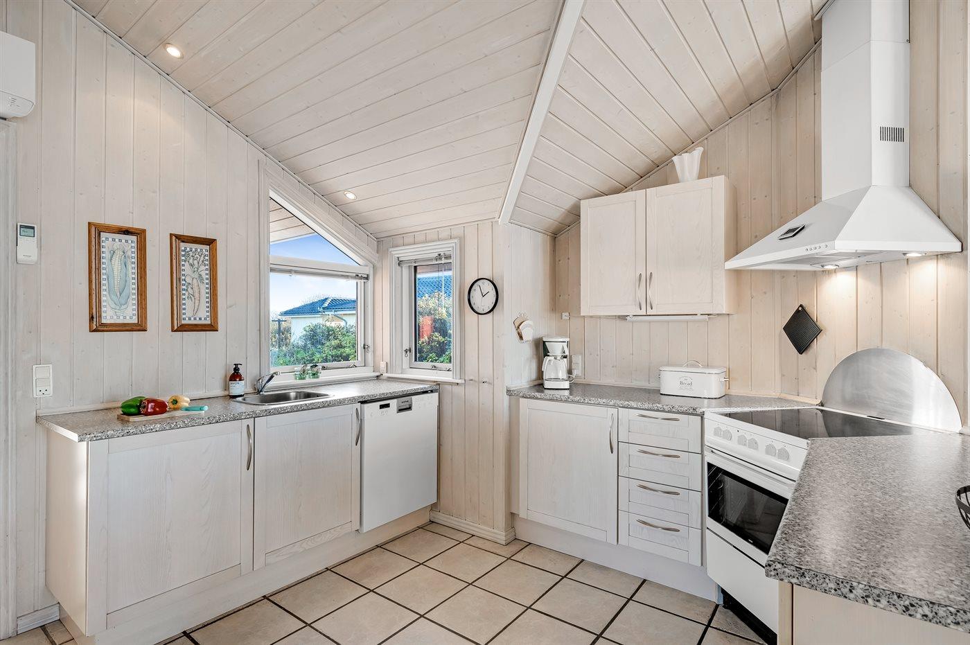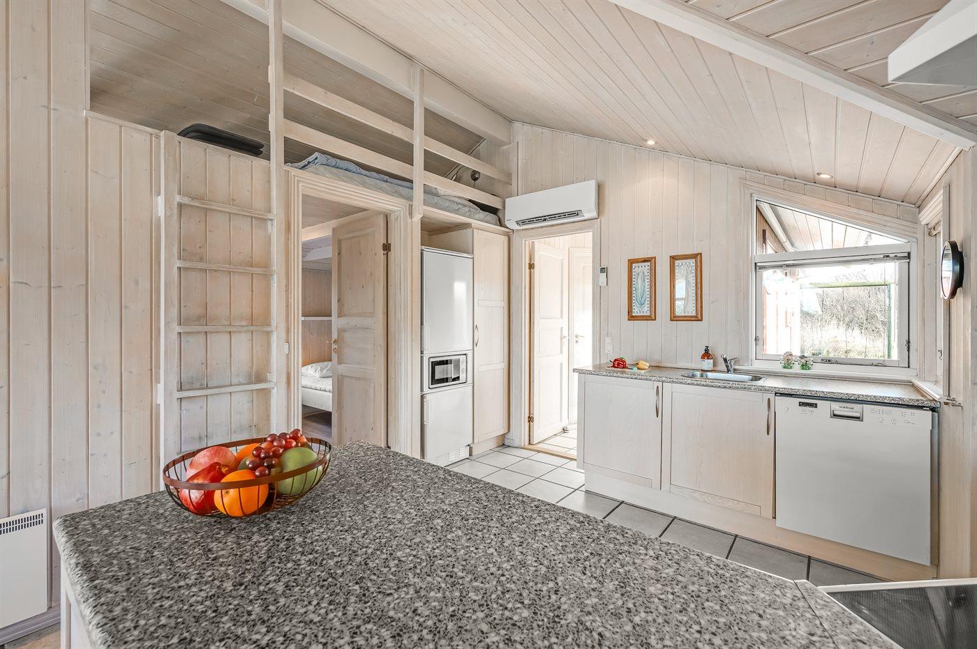 Køkkenet er udstyret med 1 køleskab. Der er 4 keramiske kogeplader, varmluftovn, mikrobølgeovn samt opvaskemaskine.
