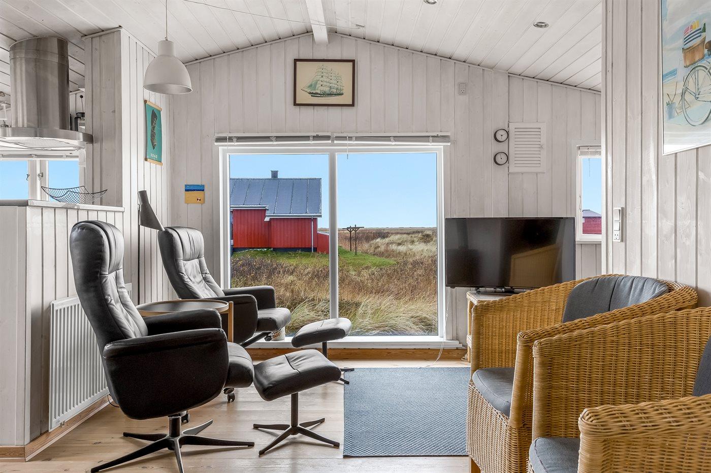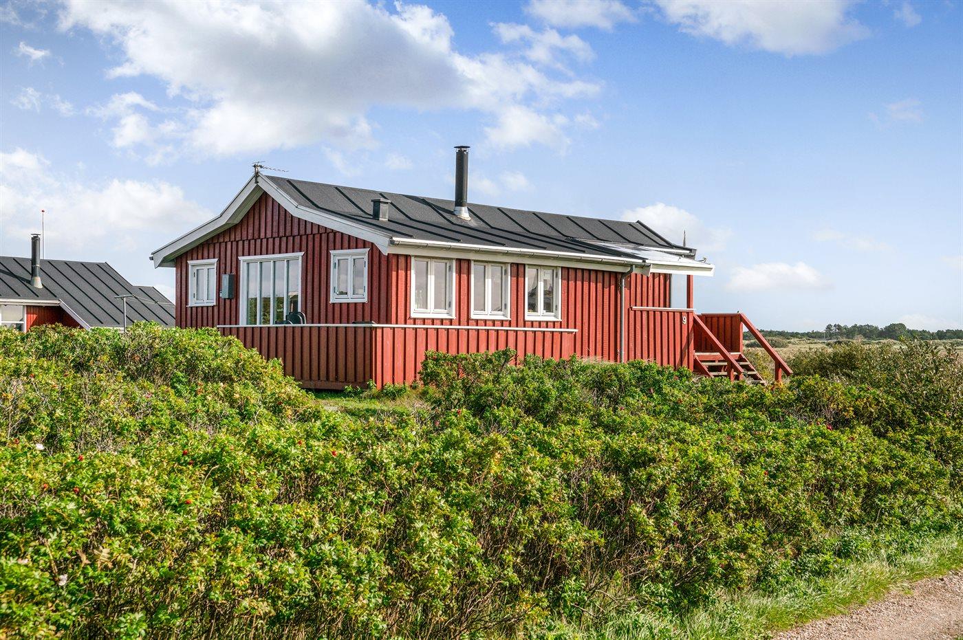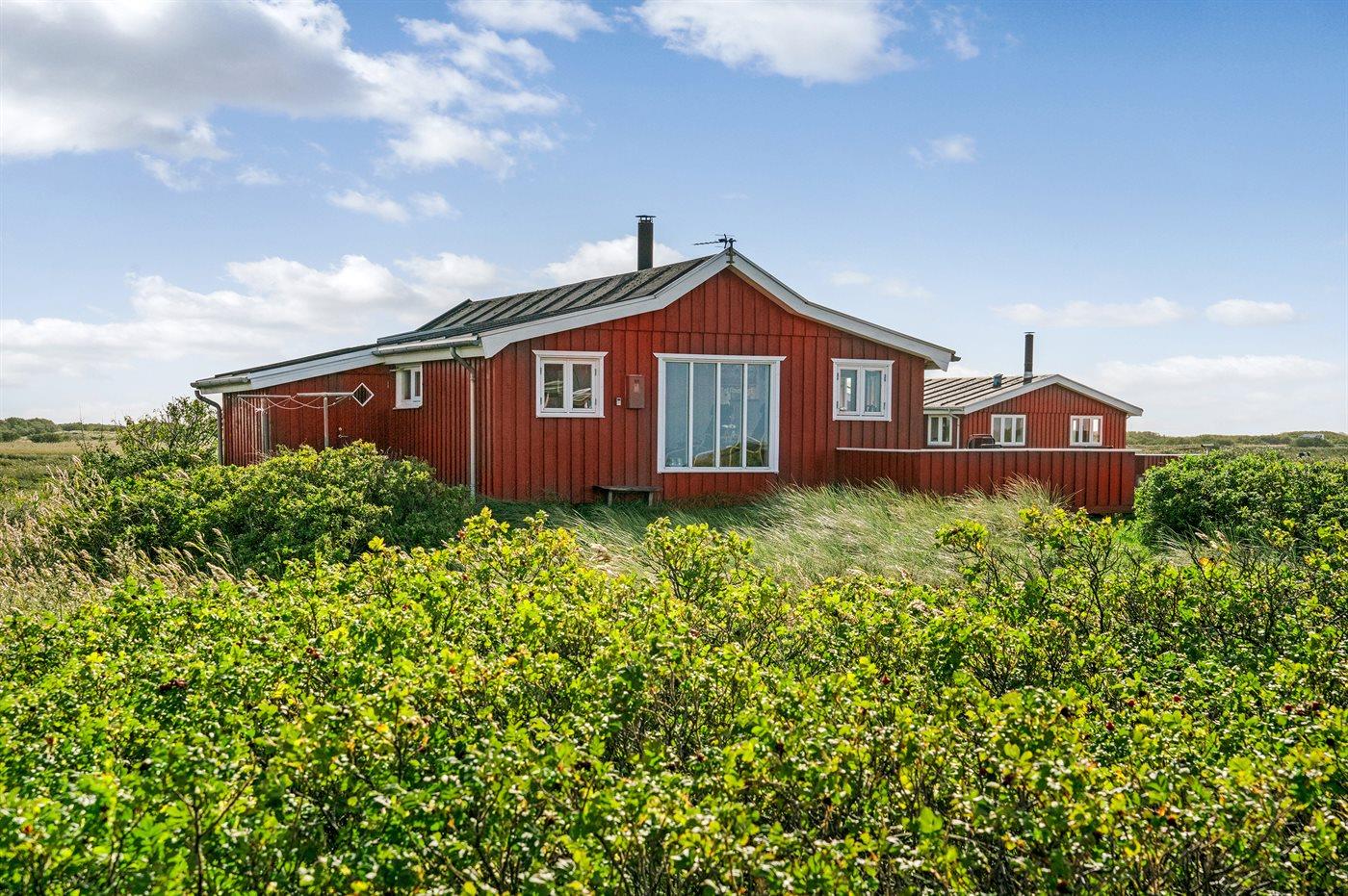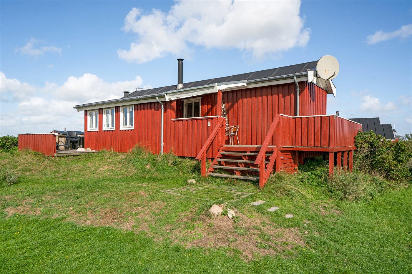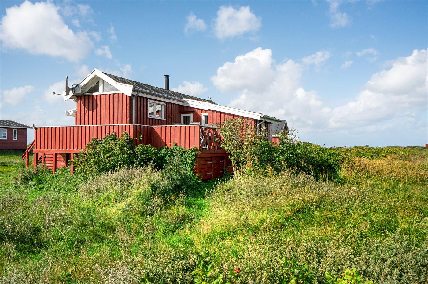 Dette sommerhus i træ med havudsigt, bygget i 1950 og moderniseret i 2003, ligger på en naturgrund kun 350 m fra Vesterhavet. Til huset hører åbent terrasseareal med havemøbler og gode læmuligheder samt en skøn udsigt over Vesterhavet. Indvendigt er væggene i stuen beklædt med træ. Badeværelse med gulvvarme, 2-pers. spa, bruser, vaskemaskine og tørretumbler. Det dejlige og nyrenoverede køkken er kombineret med den lyse opholdsstue, som er udstyret med bl.a. brændeovn, stereoanlæg med CD-afspiller, stort fladskærms-TV med parabolantenne og DVD-afspiller. Husets sovepladser fordeler sig på 1 værelse med dobbeltseng samt dobbelt sovesofa i opholdsstuen. Der er installeret energibesparende varmepumpe og stik til opladning af elbil (CEE stik).