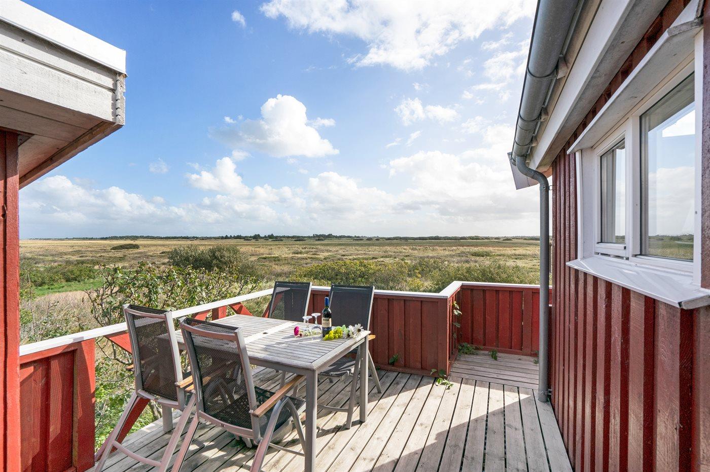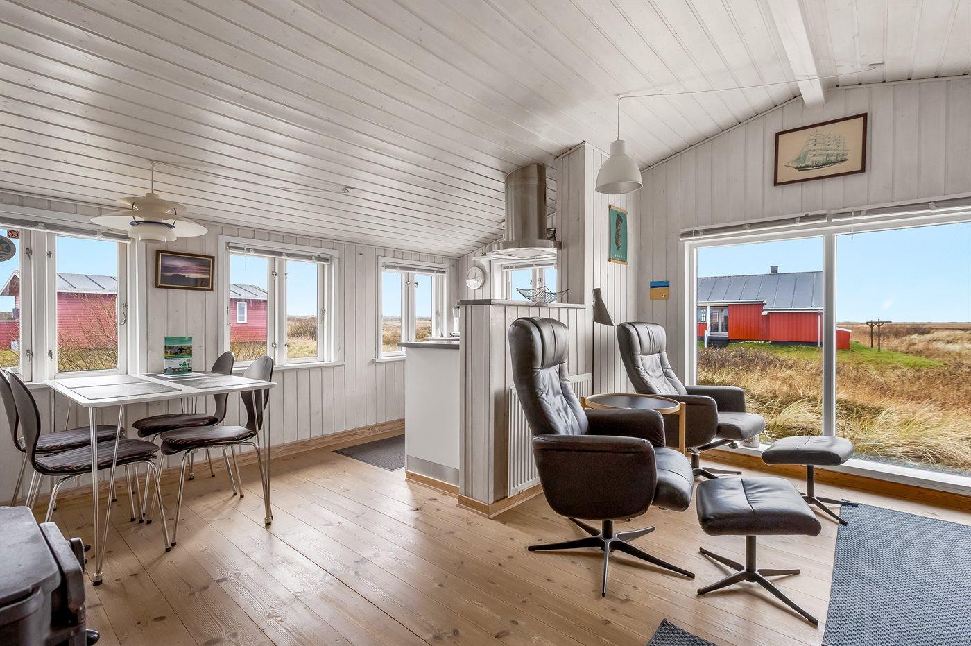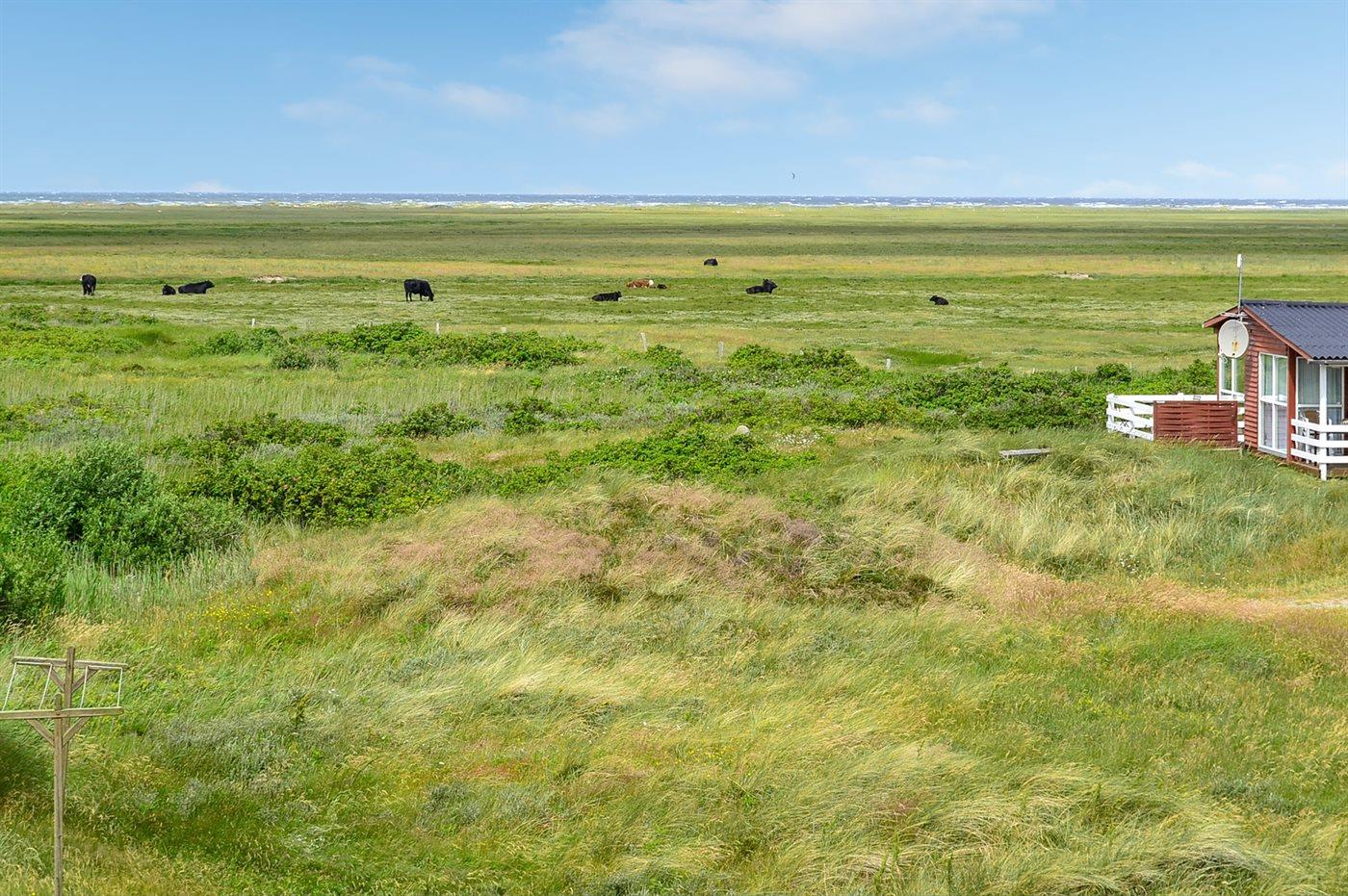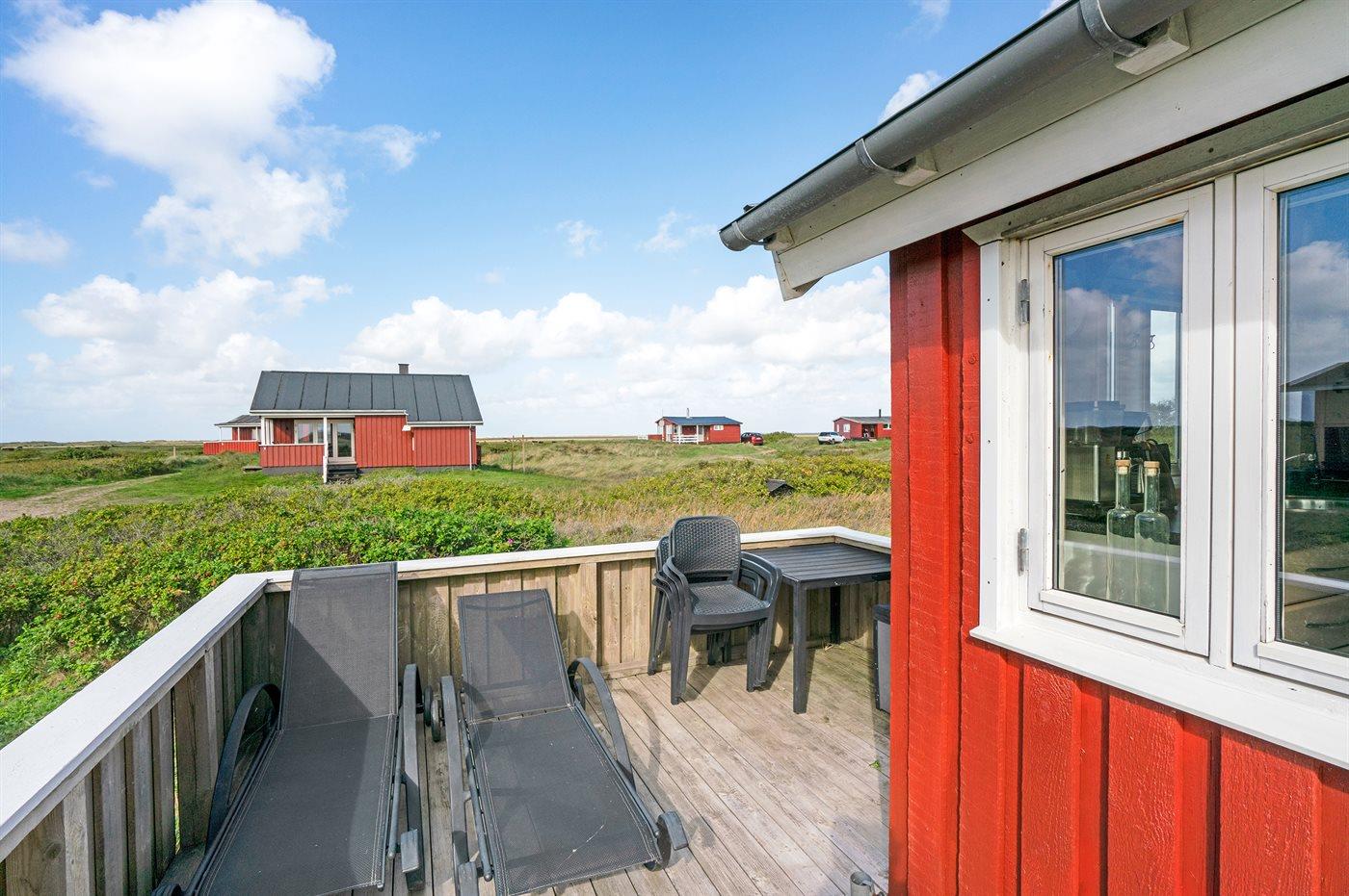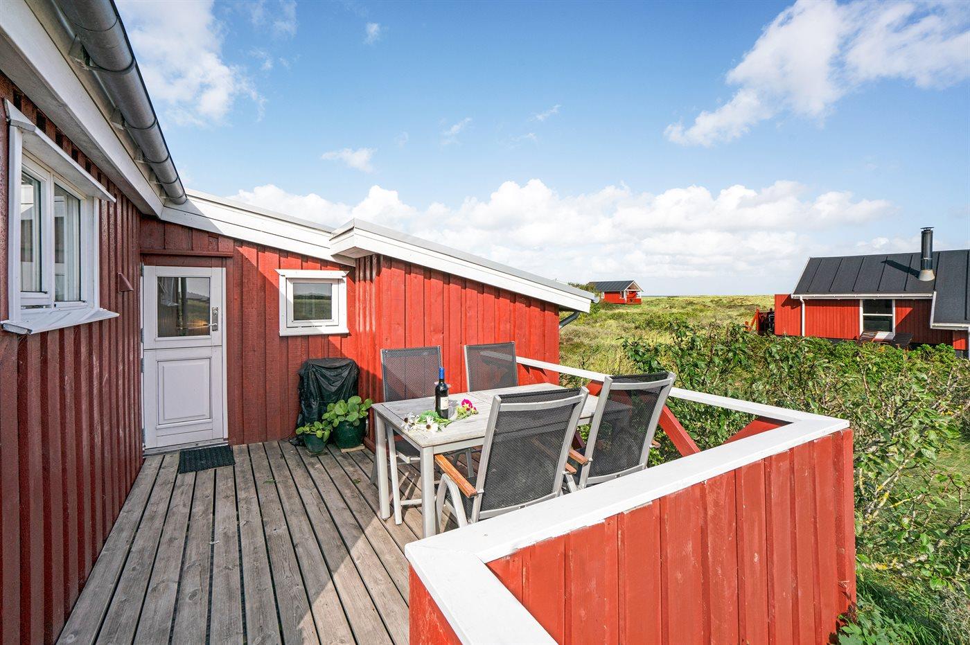 Dette sommerhus i træ med havudsigt, bygget i 1950 og moderniseret i 2003, ligger på en naturgrund kun 350 m fra Vesterhavet. Til huset hører åbent terrasseareal med havemøbler og gode læmuligheder samt en skøn udsigt over Vesterhavet. Indvendigt er væggene i stuen beklædt med træ. Badeværelse med gulvvarme, 2-pers. spa, bruser, vaskemaskine og tørretumbler. Det dejlige og nyrenoverede køkken er kombineret med den lyse opholdsstue, som er udstyret med bl.a. brændeovn, stereoanlæg med CD-afspiller, stort fladskærms-TV med parabolantenne og DVD-afspiller. Husets sovepladser fordeler sig på 1 værelse med dobbeltseng samt dobbelt sovesofa i opholdsstuen. Der er installeret energibesparende varmepumpe og stik til opladning af elbil (CEE stik).