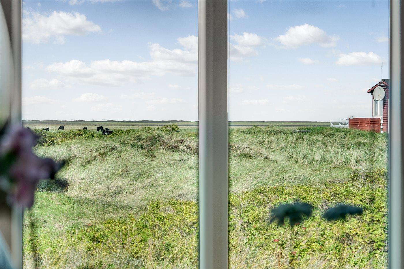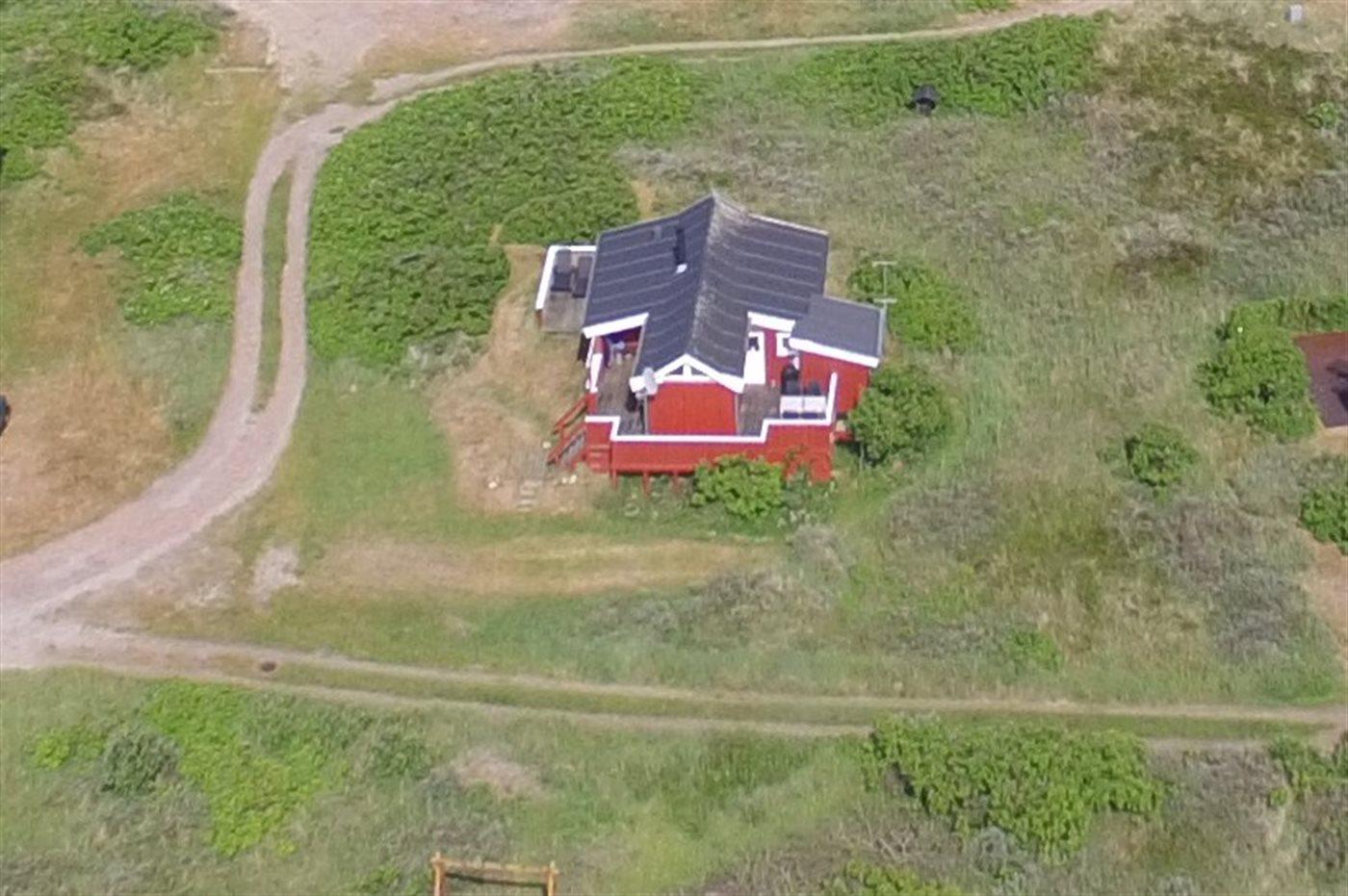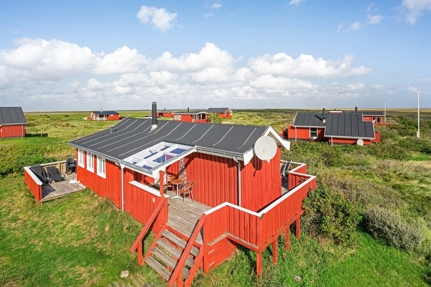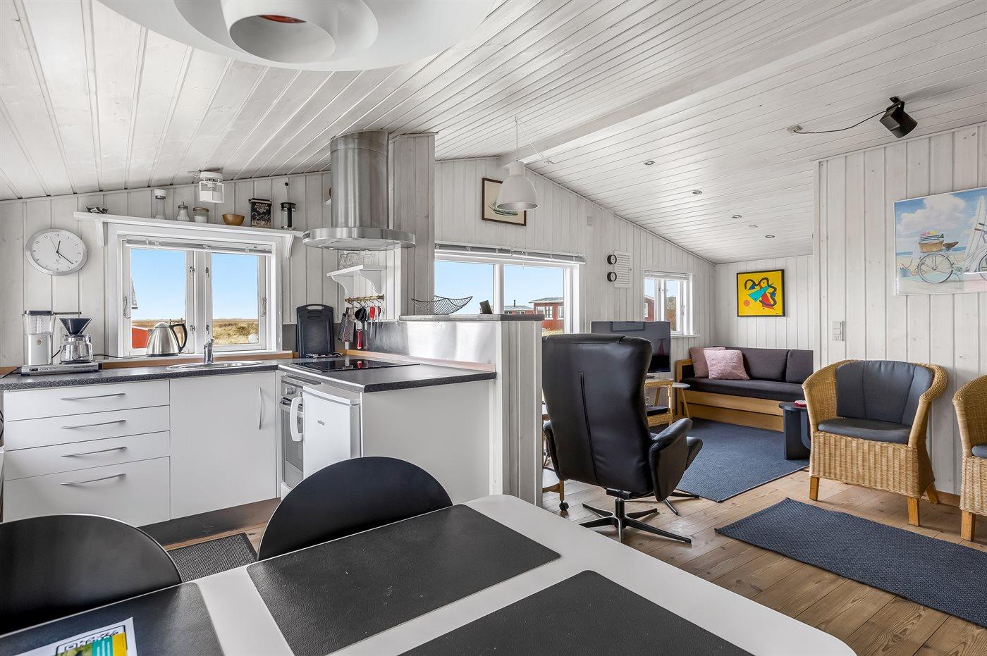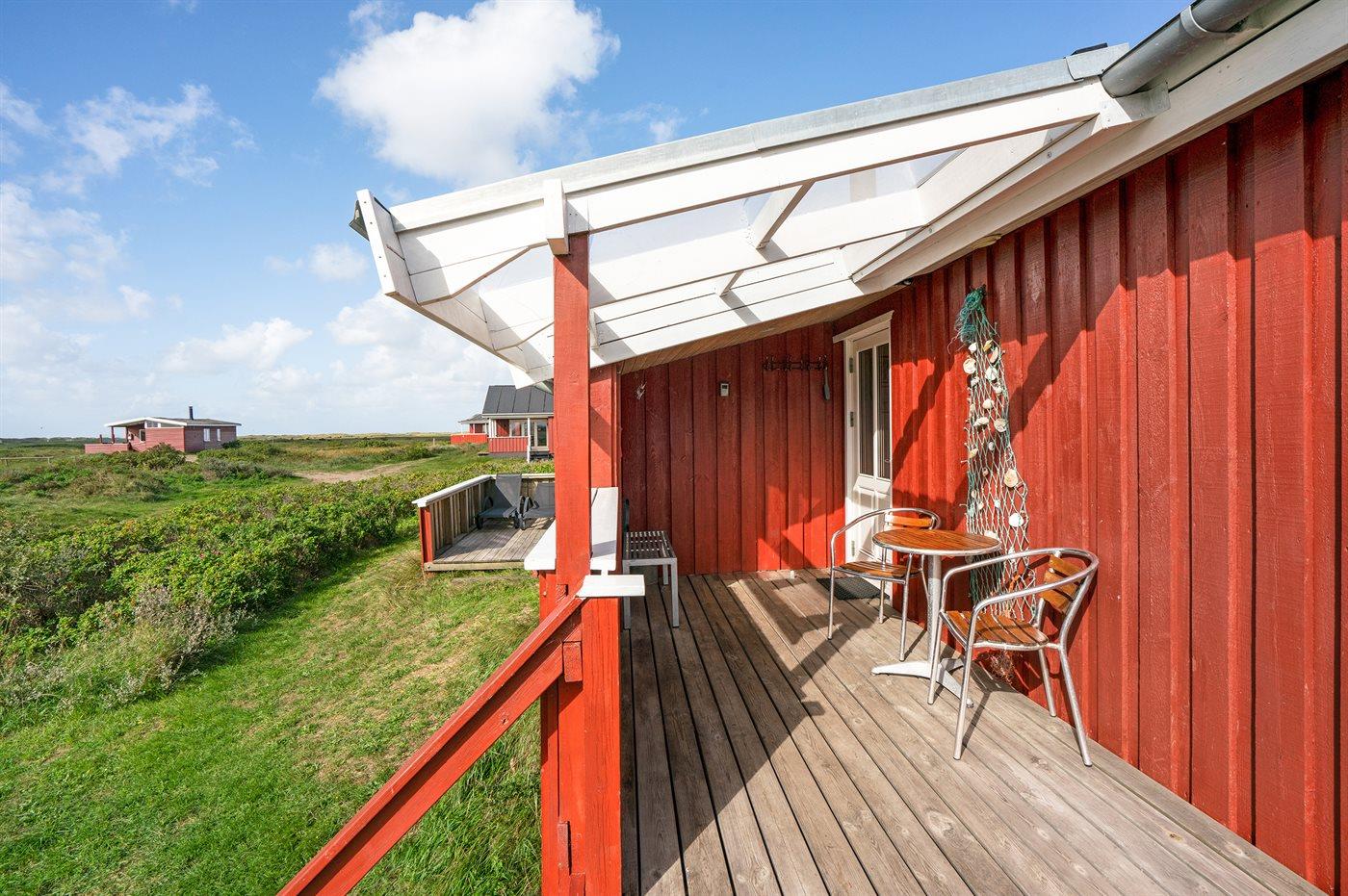 Dette sommerhus i træ med havudsigt, bygget i 1950 og moderniseret i 2003, ligger på en naturgrund kun 350 m fra Vesterhavet. Til huset hører åbent terrasseareal med havemøbler og gode læmuligheder samt en skøn udsigt over Vesterhavet. Indvendigt er væggene i stuen beklædt med træ. Badeværelse med gulvvarme, 2-pers. spa, bruser, vaskemaskine og tørretumbler. Det dejlige og nyrenoverede køkken er kombineret med den lyse opholdsstue, som er udstyret med bl.a. brændeovn, stereoanlæg med CD-afspiller, stort fladskærms-TV med parabolantenne og DVD-afspiller. Husets sovepladser fordeler sig på 1 værelse med dobbeltseng samt dobbelt sovesofa i opholdsstuen. Der er installeret energibesparende varmepumpe og stik til opladning af elbil (CEE stik).