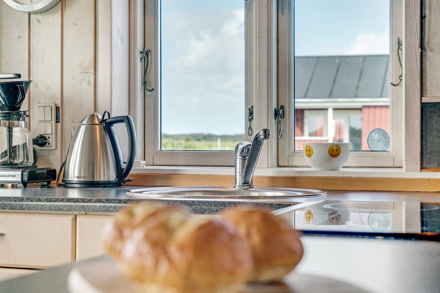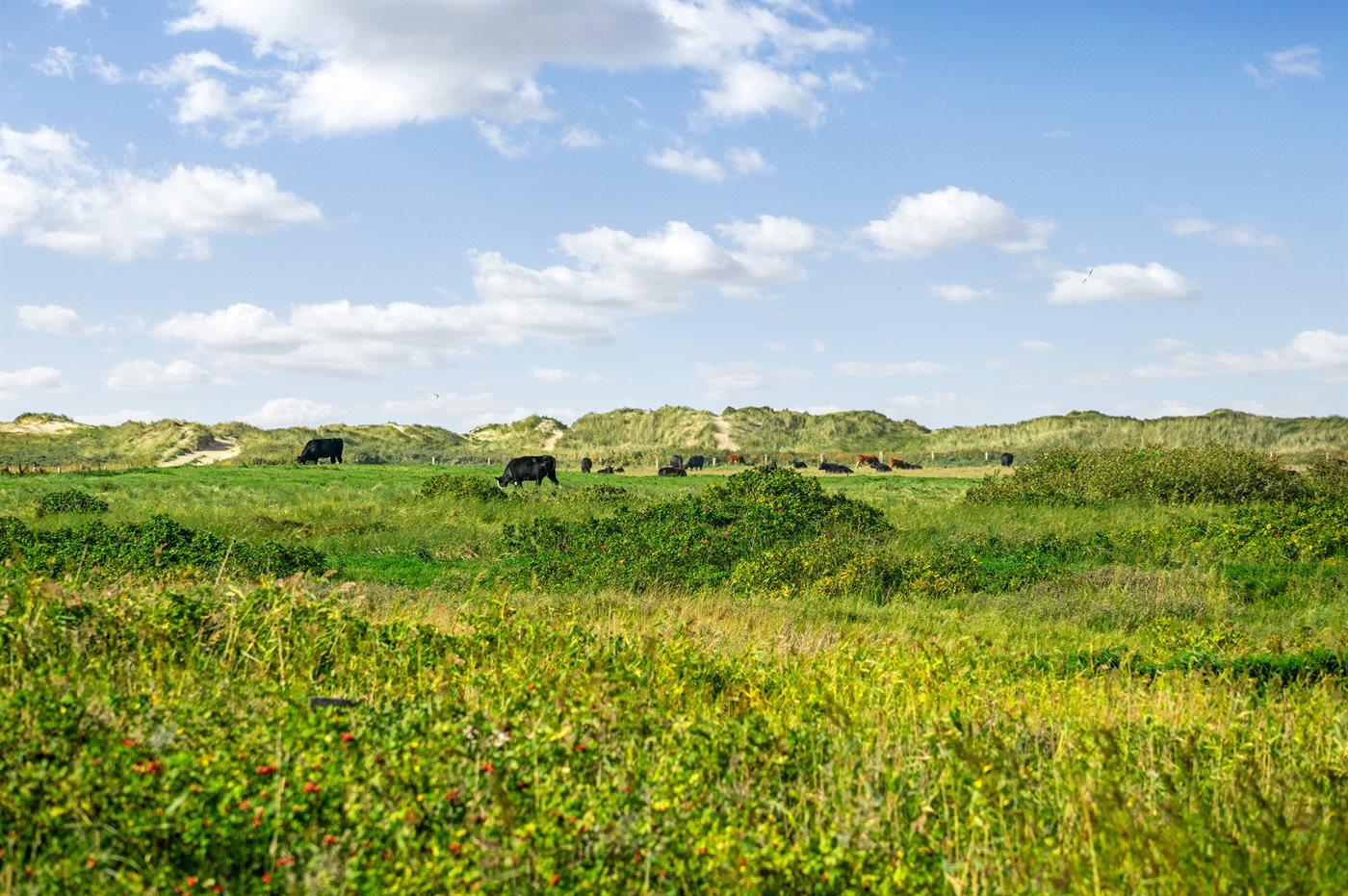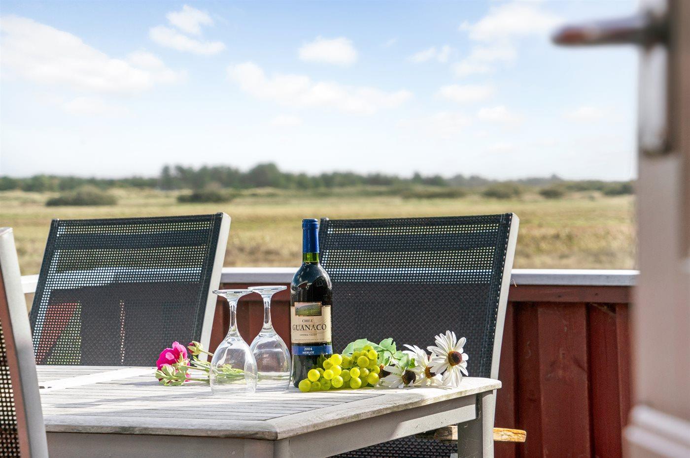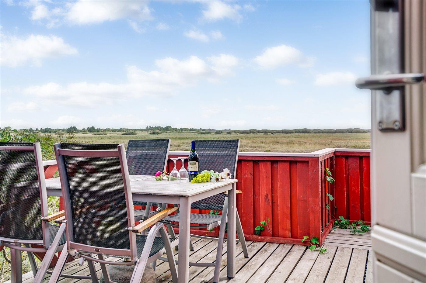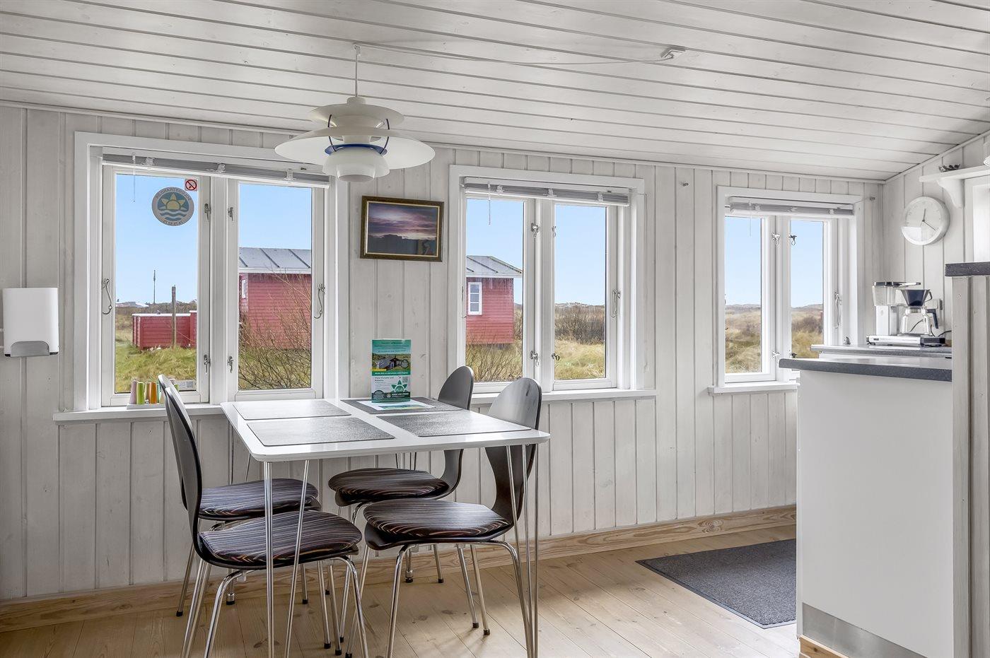 Dette sommerhus i træ med havudsigt, bygget i 1950 og moderniseret i 2003, ligger på en naturgrund kun 350 m fra Vesterhavet. Til huset hører åbent terrasseareal med havemøbler og gode læmuligheder samt en skøn udsigt over Vesterhavet. Indvendigt er væggene i stuen beklædt med træ. Badeværelse med gulvvarme, 2-pers. spa, bruser, vaskemaskine og tørretumbler. Det dejlige og nyrenoverede køkken er kombineret med den lyse opholdsstue, som er udstyret med bl.a. brændeovn, stereoanlæg med CD-afspiller, stort fladskærms-TV med parabolantenne og DVD-afspiller. Husets sovepladser fordeler sig på 1 værelse med dobbeltseng samt dobbelt sovesofa i opholdsstuen. Der er installeret energibesparende varmepumpe og stik til opladning af elbil (CEE stik).