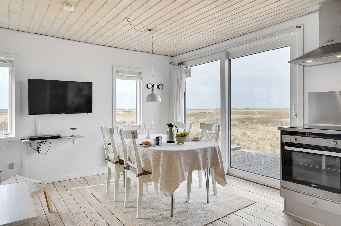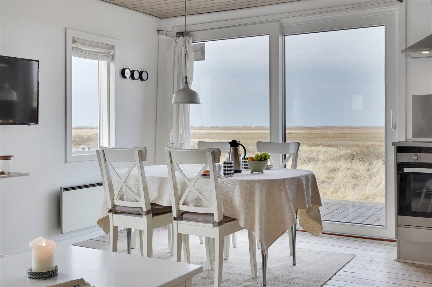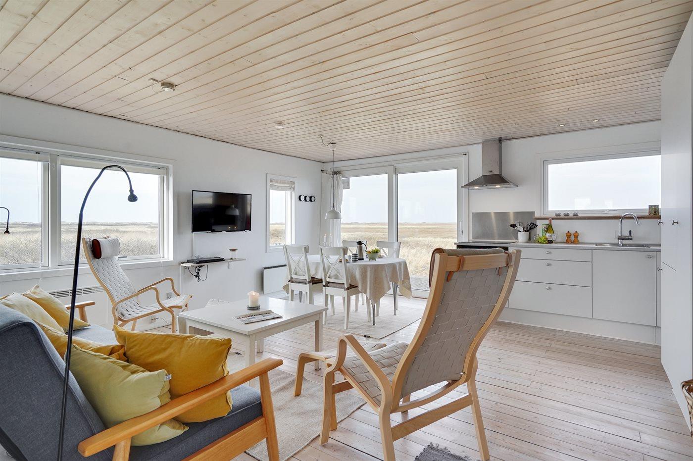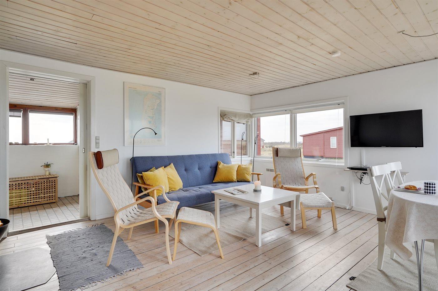 Et dejligt og lyst indrettet sommerhus med udsigt over Vesterhavet. Bemærk, at de 2 sovepladser på sovesofaen befinder sig i opholdsstuen.