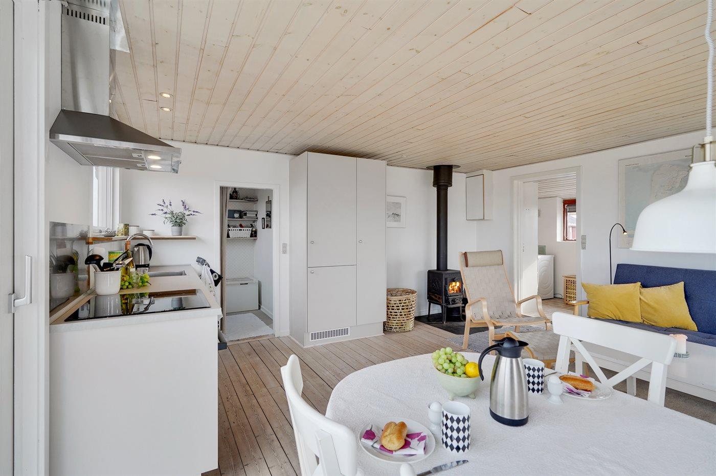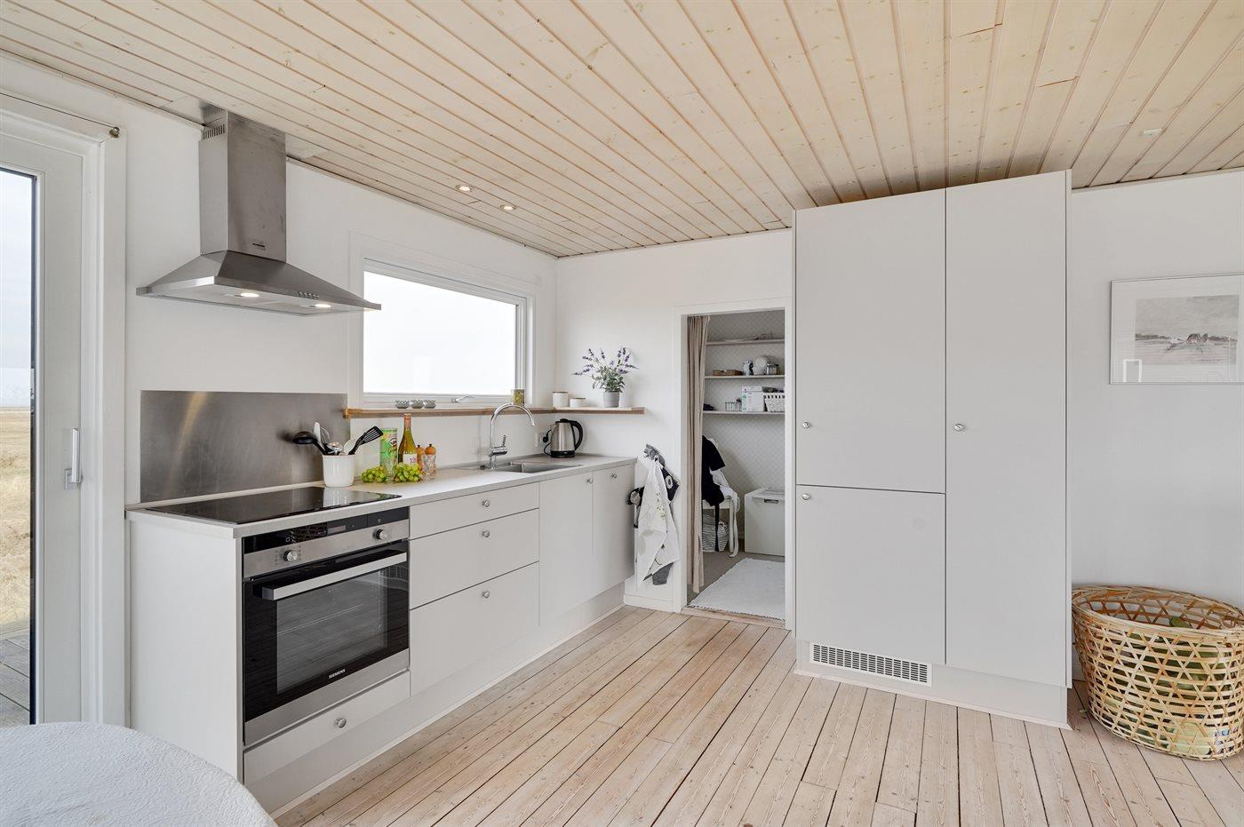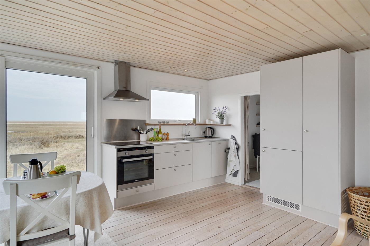 Køkkenet er udstyret med 1 køleskab. Der er 4 keramiske kogeplader, varmluftovn samt opvaskemaskine.