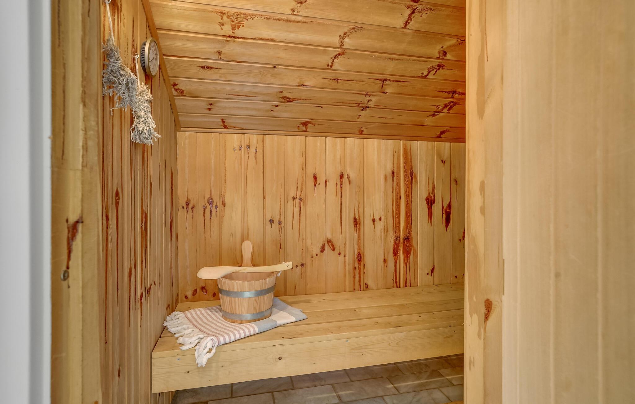Indvendigt er det hyggeligt indrettet med træbeklædte lofter og vægge. Her findes en god brændeovn til de kolde årstider. Badeværelset er indrettet med et spabad til to personer og giver adgang til en sauna. Endvidere findes her et gæstetoilet.