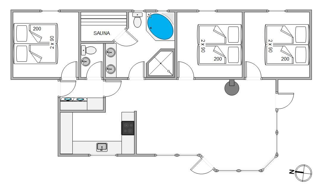 Sommerhuset har 3 gode soverum samt et dejligt badeværelse med gulvvarme, sauna og spa. Her er der altså rig mulighed for en masse afslapning. Sommerhuset har også et ekstra gæstetoilet, så der ikke er kø til badeværelset om morgenen.