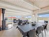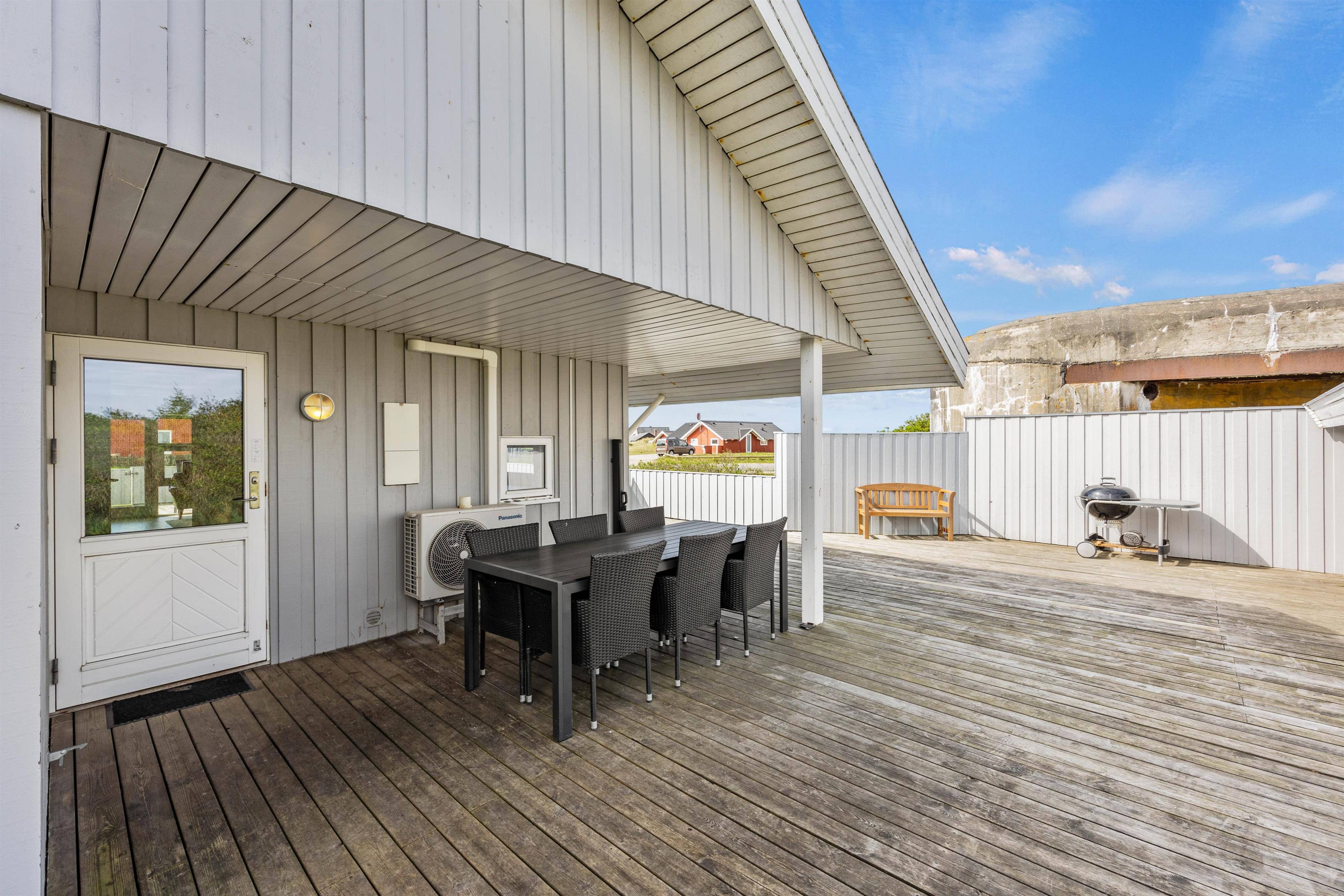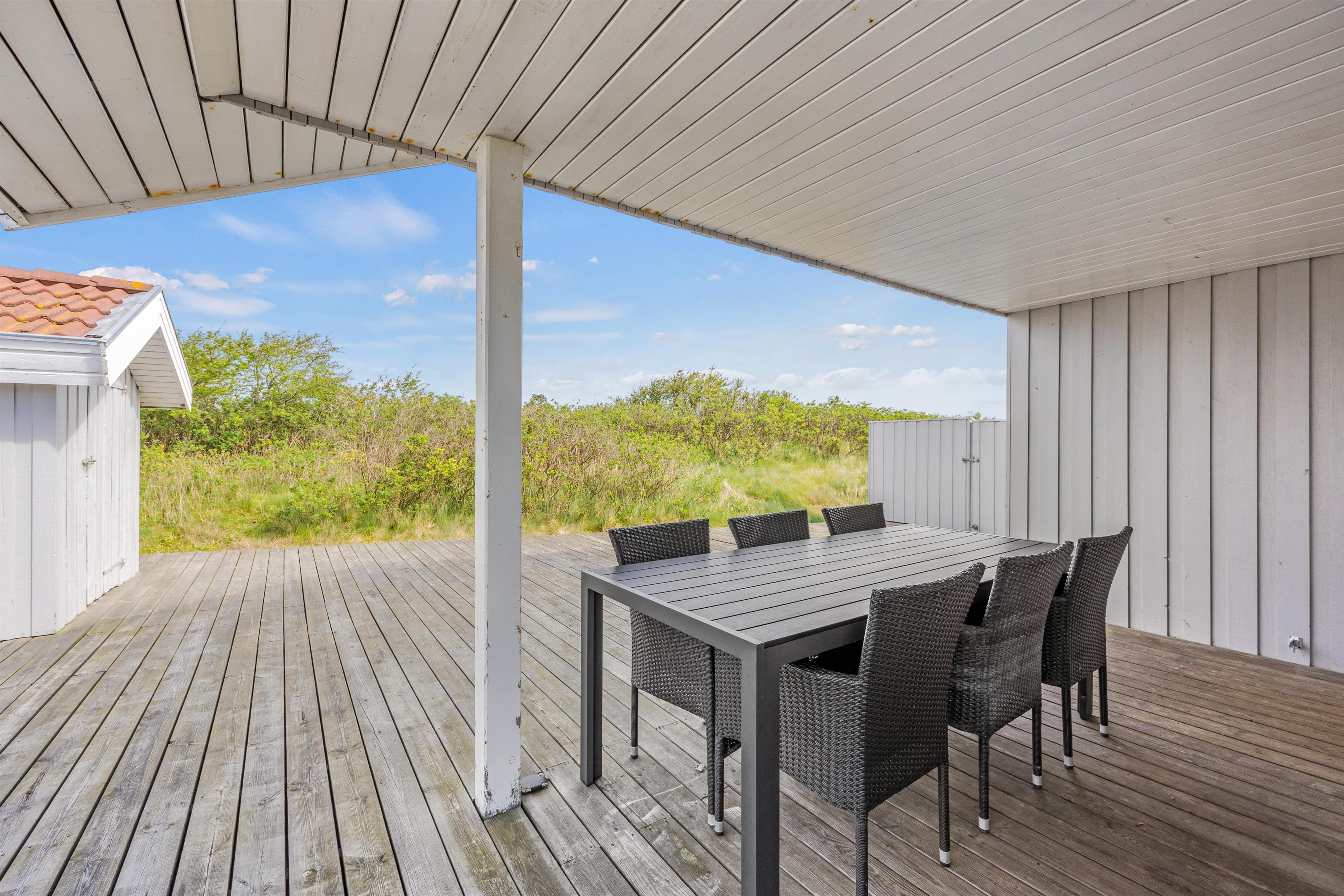 Fra stuen er der flere udgange til den dejlige træterrasse, som sommerhuset er omringet af. Terrassen er delvist lukket, afskærmet og overdækket, så det er muligt at finde læ. Her kan I nyde en dejlig kop kaffe i de behagelige havemøbler. Hen ad eftermiddagen kan I finde sommerhusets praktiske gasgrill frem, hvorpå I kan lave en lækker middag, og hvis vejret byder til det, kan I nyde middagen på terrassen.