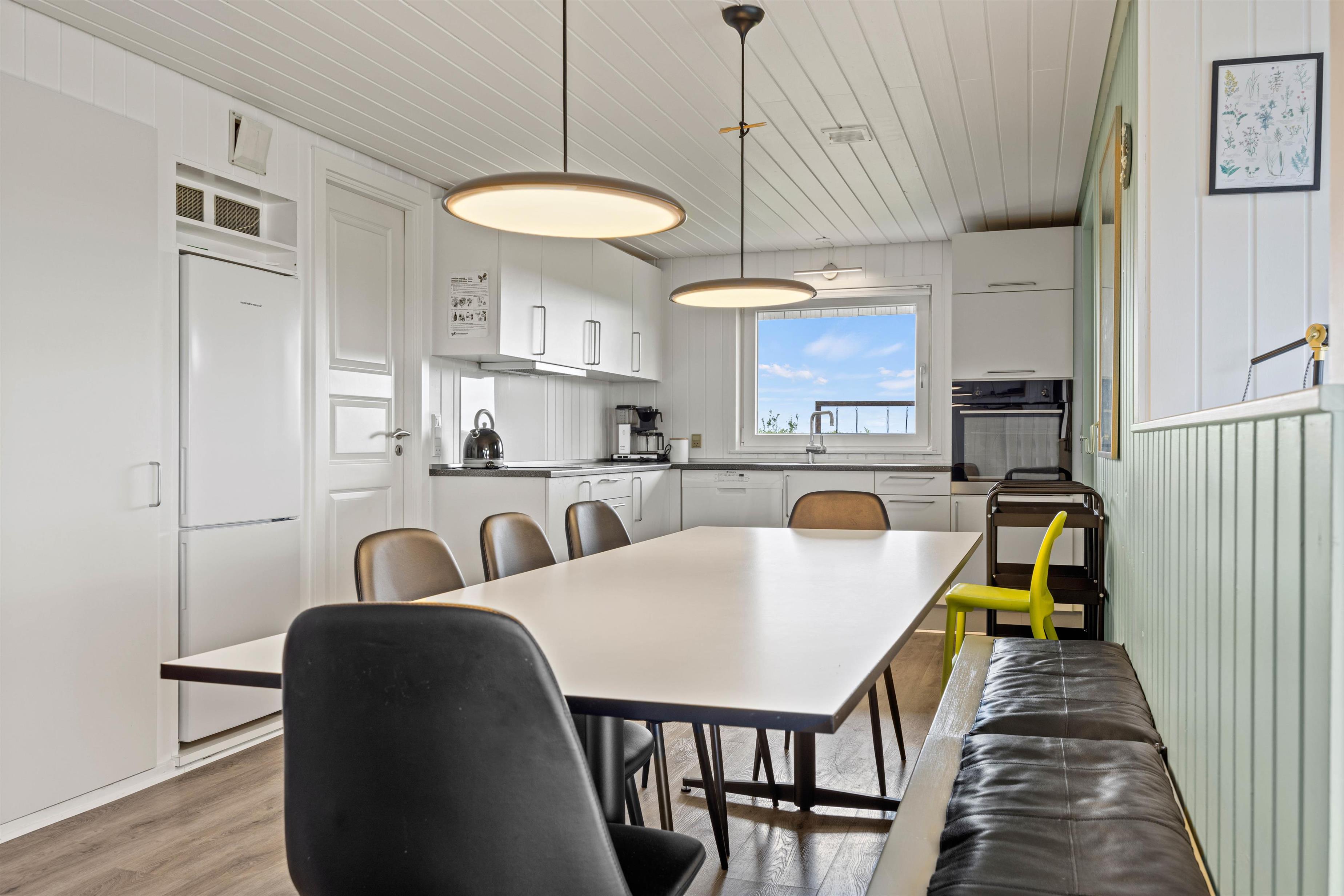 Også sommerhusets hjerterum, det åbne alrum, er perfekt til de afslappende stunder. Her er god plads til jer alle, uanset om den står på fællesmadlavning, spilleaften eller ren afslapning på sofaen. Her er lads til at flyde ud, se film eller læse bog foran den knitrende brændeovn. Udover brændeovnen kan I med fordel gøre brug af den energibesparende varmepumpe, der sørger for et behageligt indeklima.