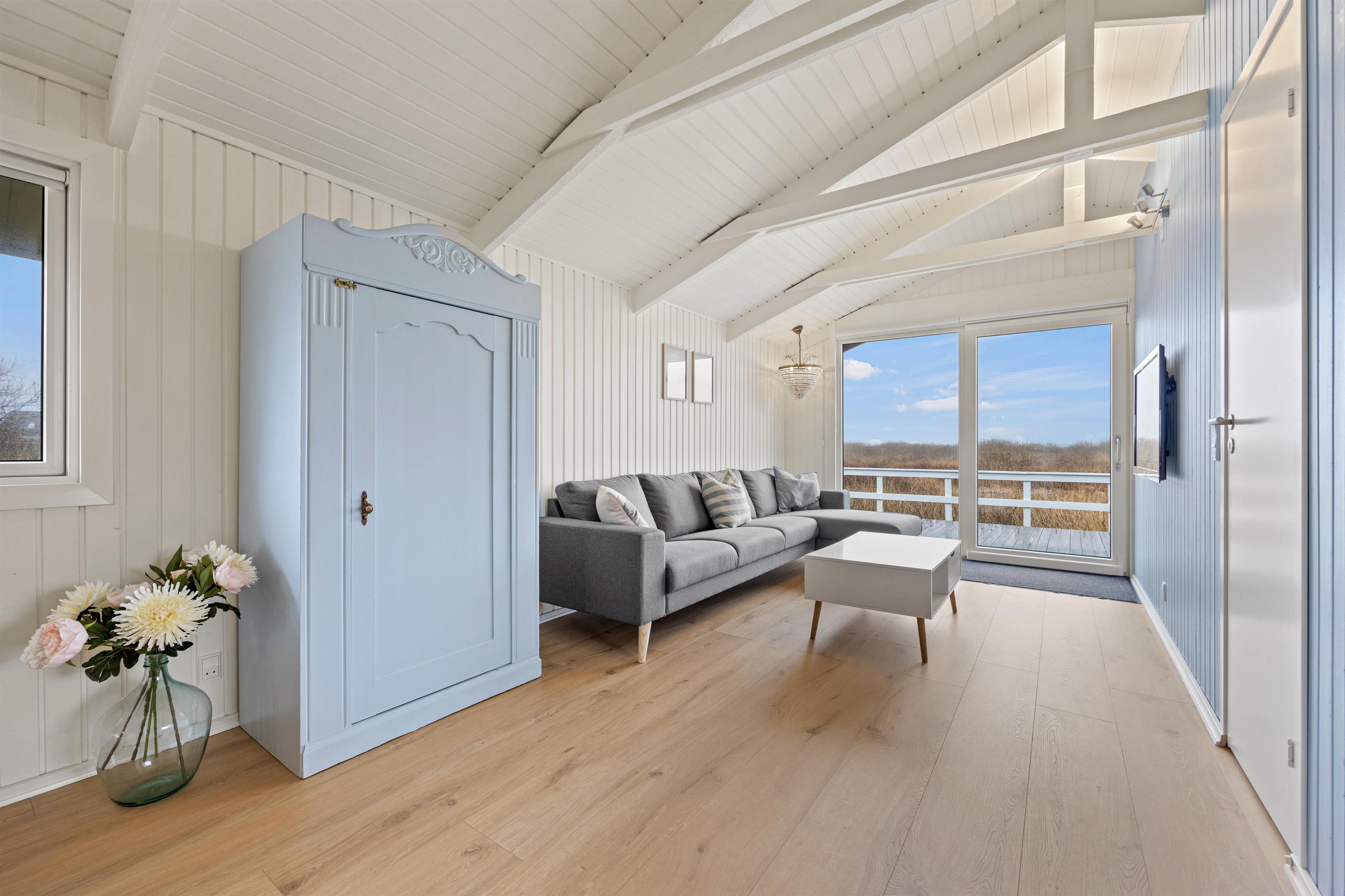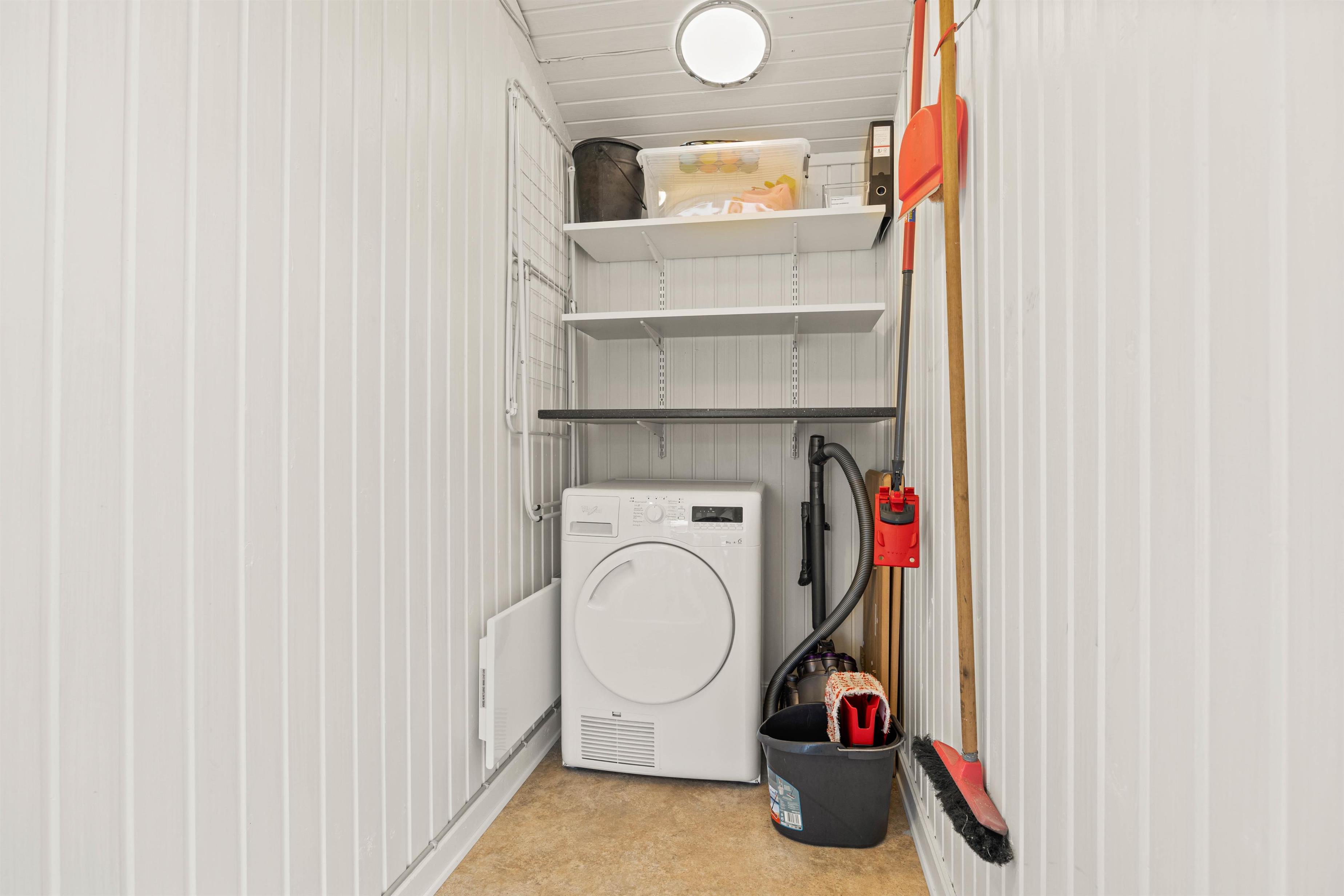 Samlingspunktet inden døre bliver dog køkkenalrummet, hvor køkken, spiseplads og stue er i forlængelse af hinanden. I køkkenet kan der tilberedes lækker mad, der senere skal en tur på gasgrillen eller måske bages en kage til kaffen? Den kedelige opvask klares heldigvis af opvaskemaskinen. Rummets store glasdøre og vinduer bidrager med masser af dagslys, mens brændeovnens placering i midten skaber en naturlig opdeling mellem køkken og stue. På denne måde spredes dens varme og hygge også i hele rummet. Slå efterfølgende benene op i sofaen med en god bog eller hyg med jeres yndlingsbrætspil ved spisebordet– alt imens pejsens varme og hygge spredes. Stuen har desuden en energibesparende varmepumpe, mens I til højre for indgangen har adgang til et lille separat opbevaringsrum, der også indeholder en tørretumbler.