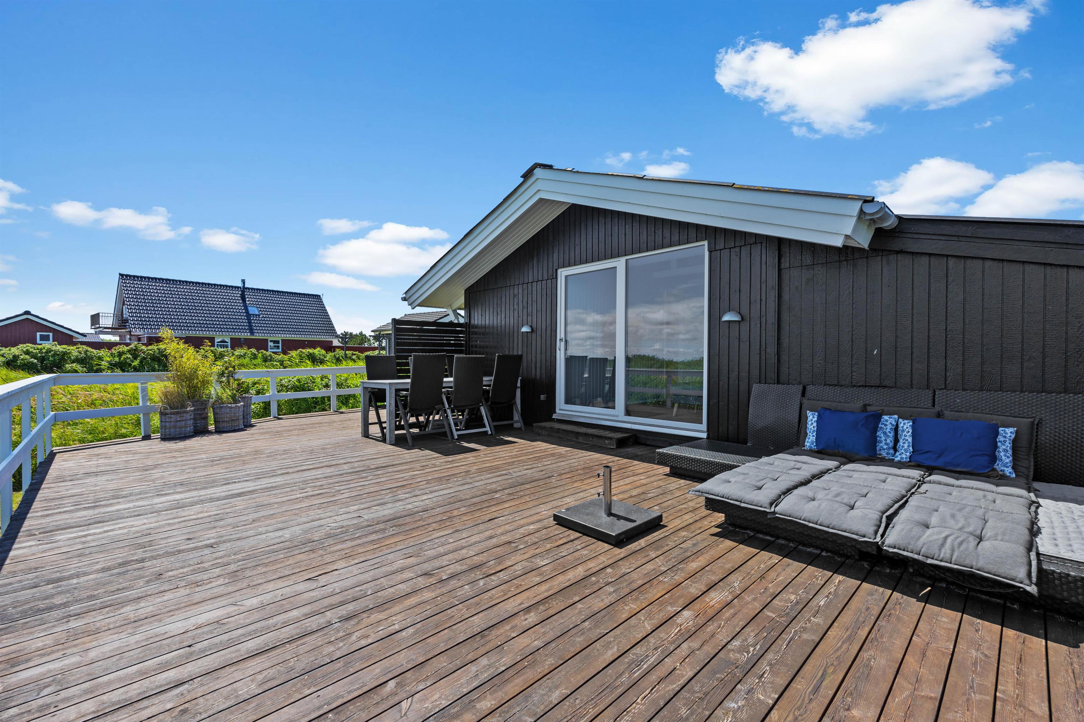 Solskinstimerne kan nydes fra en af de skønne terrasser, hvorfra der er udsigt over de grønne områder. En på forsiden af sommerhuset samt en stor træterrasse i nordøst. Her venter havemøbler og liggestolene på jer. Mens der bliver solet på terrassen, kan de små gynge på gyngerne eller bygge store sandslotte i sandkassen.