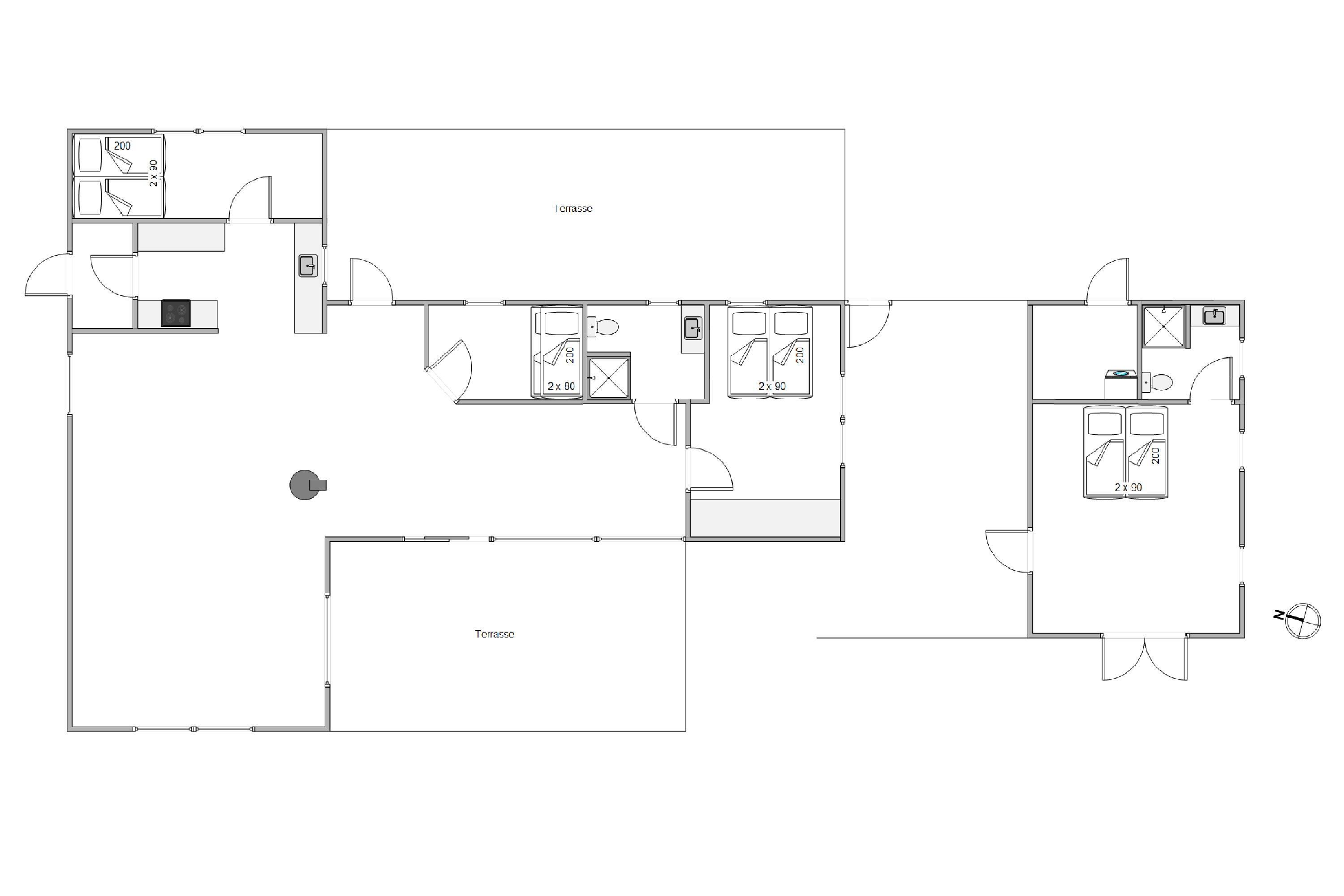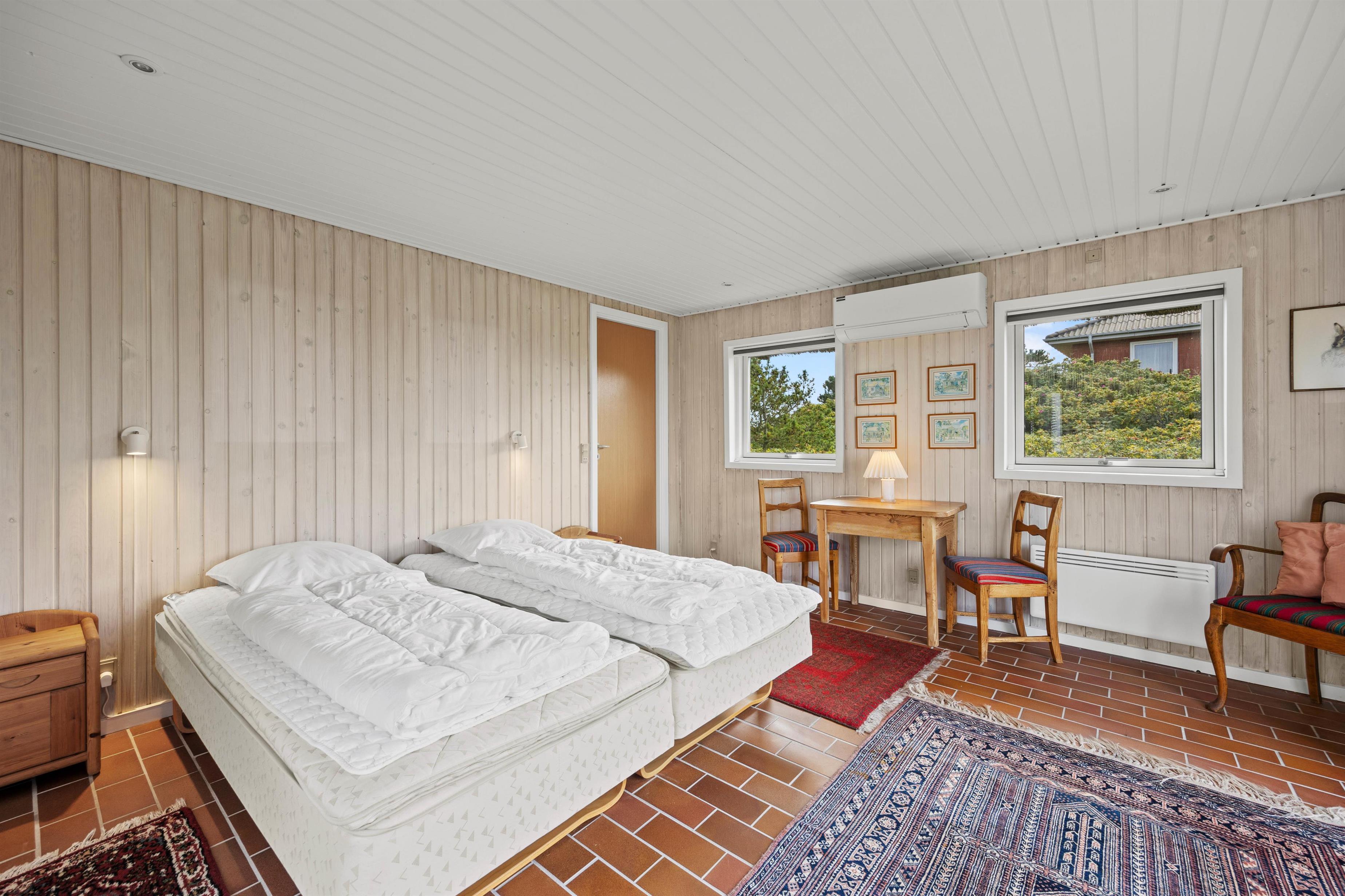 Huset tilbyder rigelig plads til 8 personer, så det er særligt velegnet til en ferie med den større familie eller med flere vennepar. Der er i alt 4 soveværelser og 2 komplette badeværelser med gulvvarme. I hovedhuset er der tre soveværelser, to af dem med dobbeltsenge, og det tredje med en køjeseng, der er særligt populær blandt børn. I gæstehuset er der et yderligere stort soveværelse og det andet badeværelse.