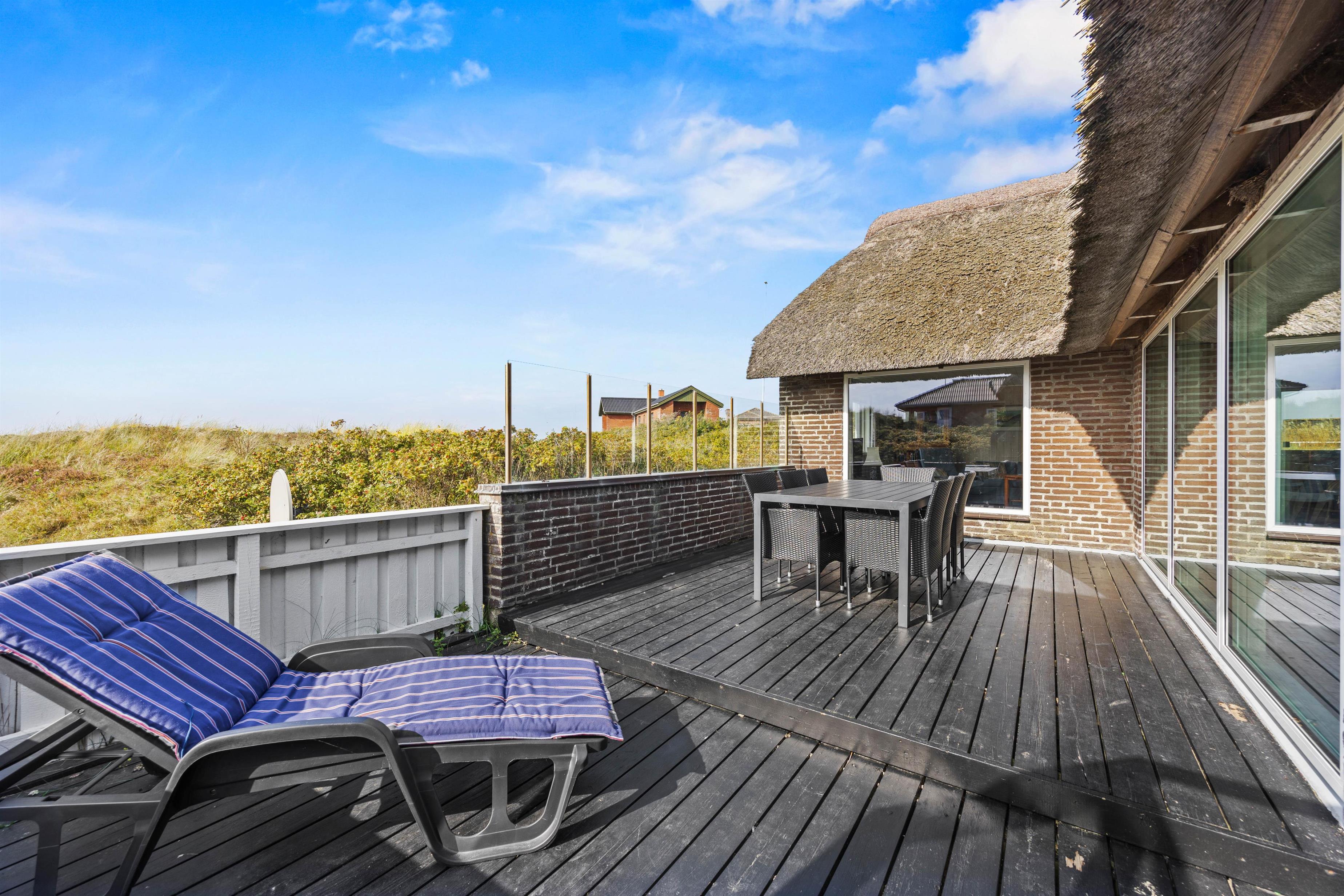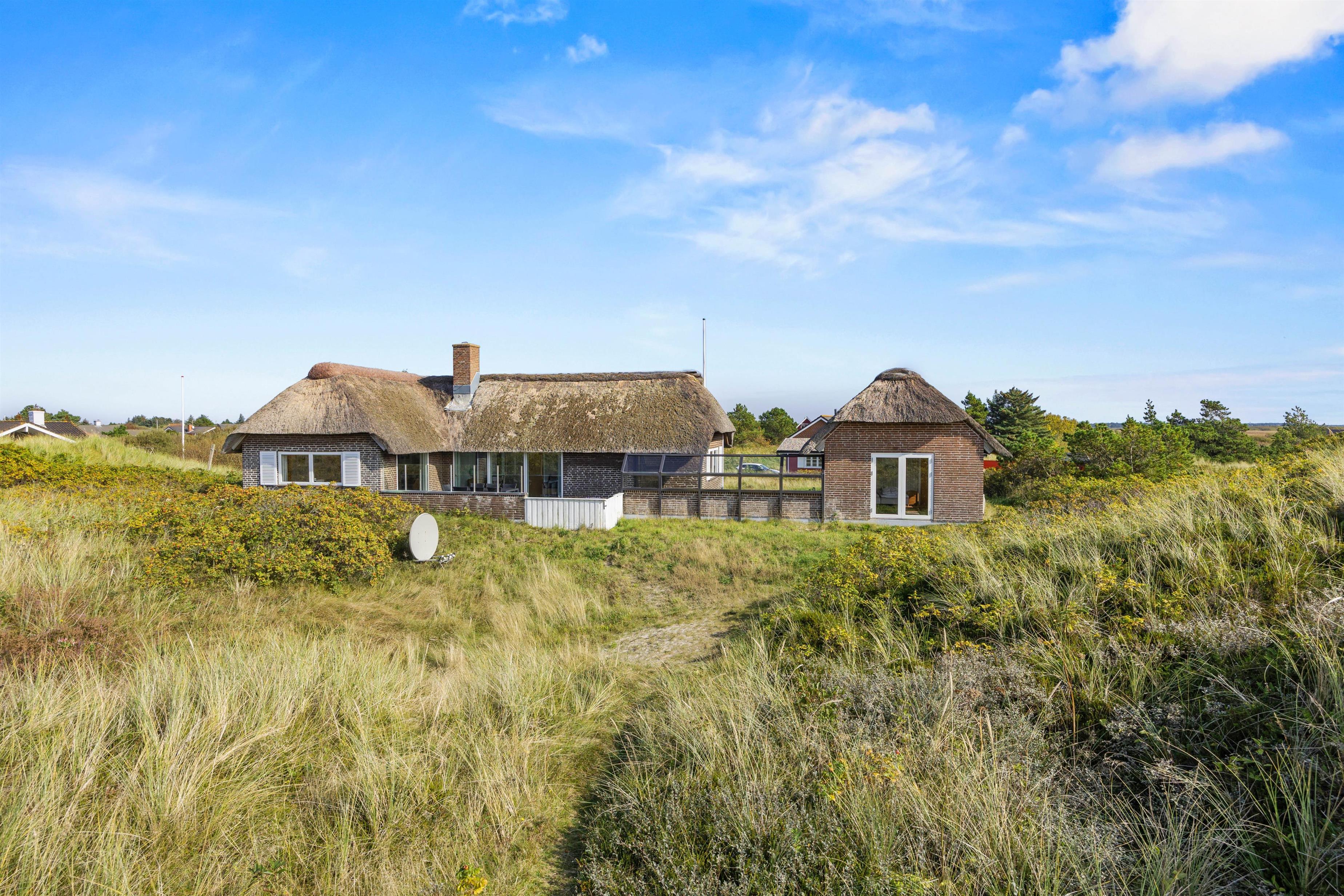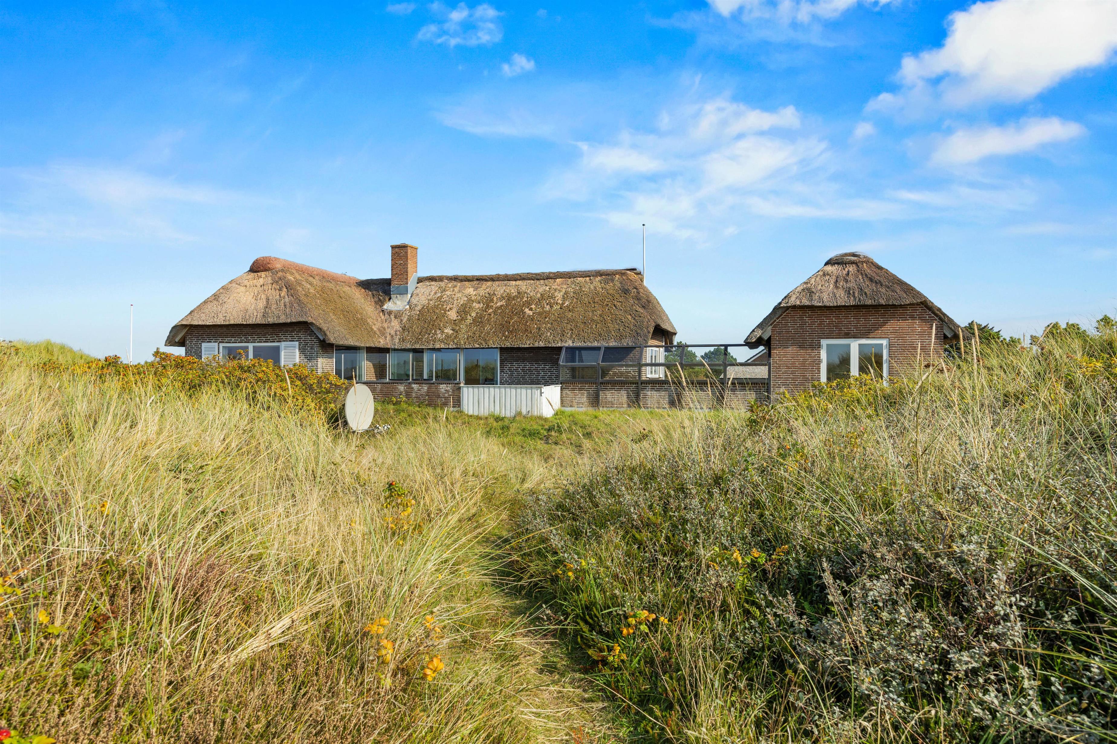 Sommerhuset ligger 600 meter fra den brede sandstrand på Lakolk, og en lille sti ved huset fører gennem klitterne til stranden. Ved huset er der flere store og beskyttede terrasser med havemøbler, så I altid kan finde en plads i solen og læ for vinden. Her kan I virkelig nyde husets unikke beliggenhed og roen og friheden.