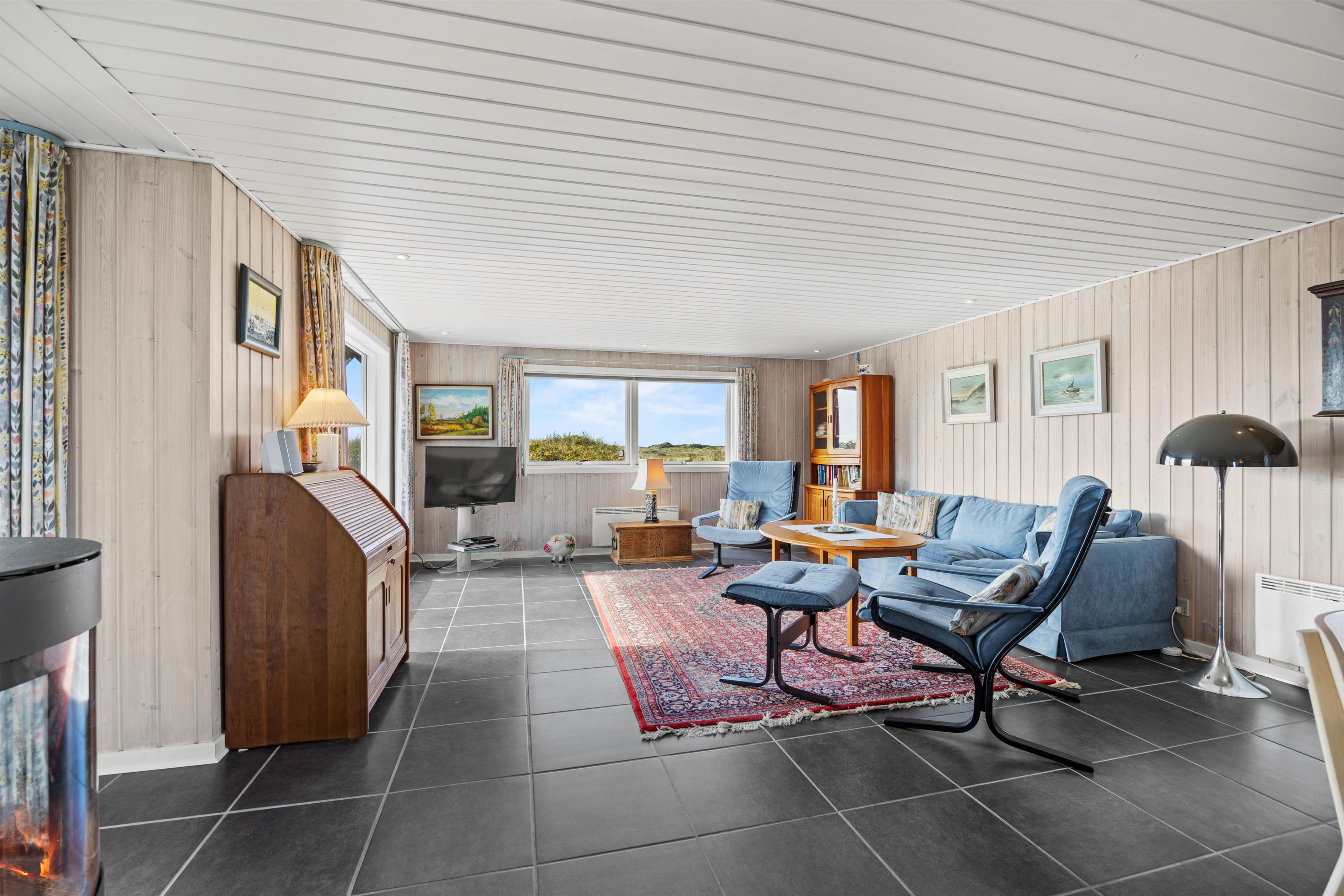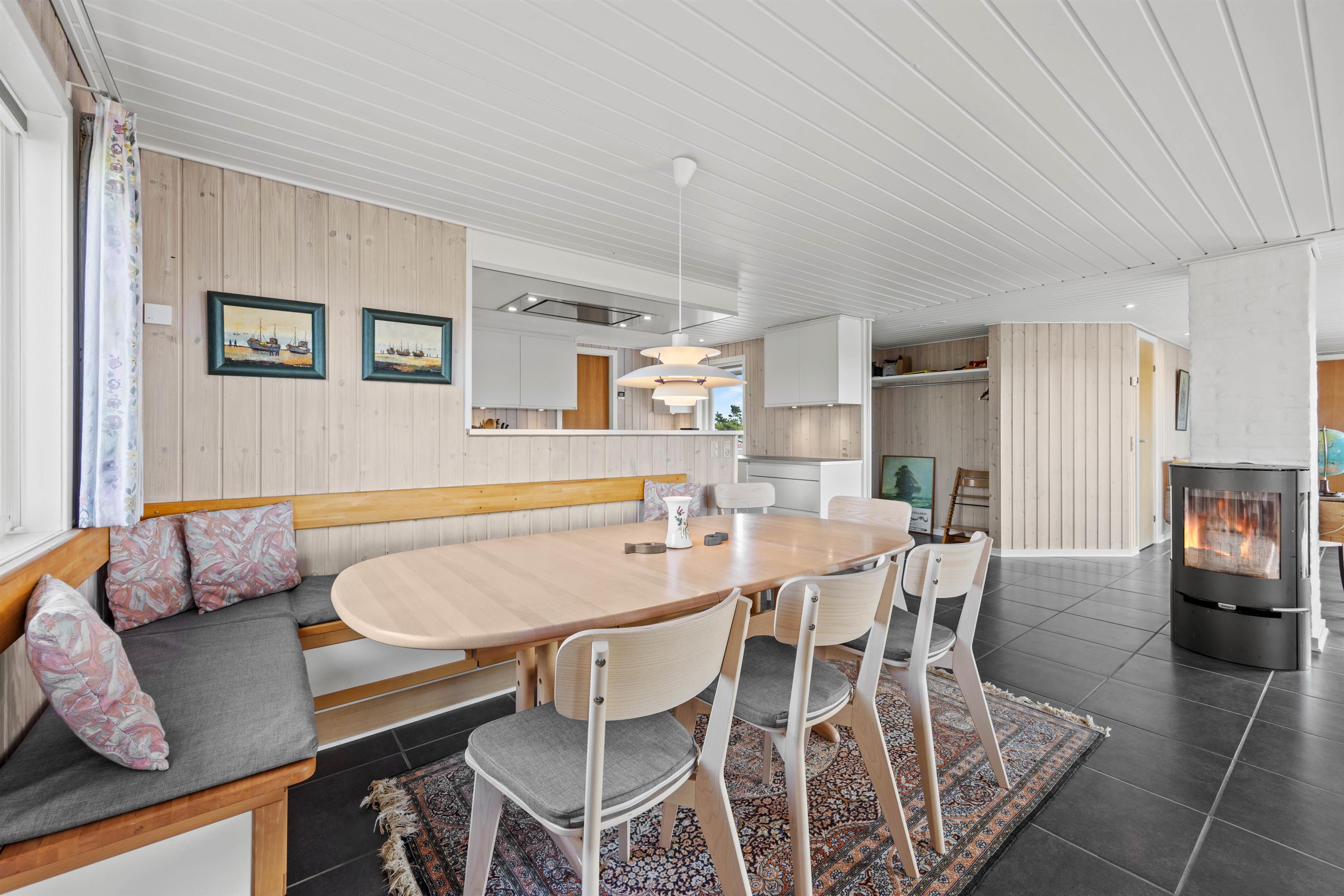 Det 112 m2 store sommerhus indbyder til mange skønne, fælles timer. I den rummelige stue med integreret spisekrog er der masser af muligheder for at nyde husets fantastiske beliggenhed i kredsen af sine kære.