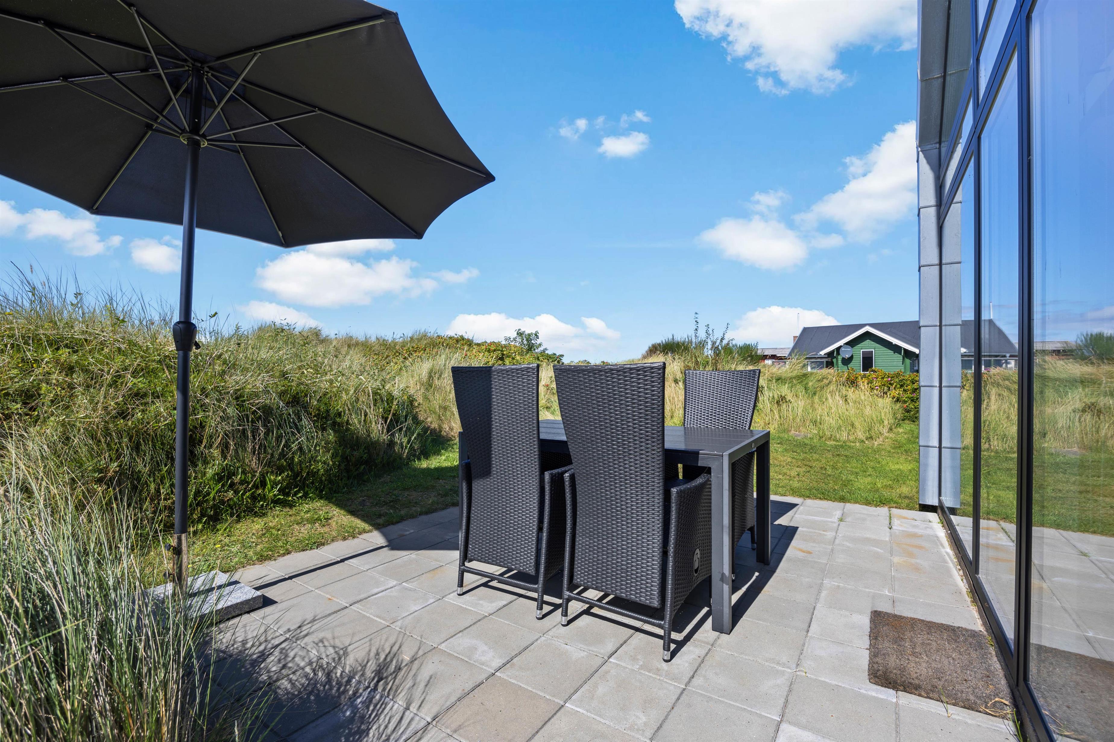 På begge sider af huset er der lavet terrasse, så I kan nyde solen så meget som muligt. Terrassen i øst er perfekt til morgenkaffen, mens den overdækkede del af terrassen findes på vestsiden er perfekt til aften solen. Nyd den smukke udsigt og se solnedgangen, mens I griller på en lun sommeraften. Afslut evt. aftenen med en gåtur på stranden.