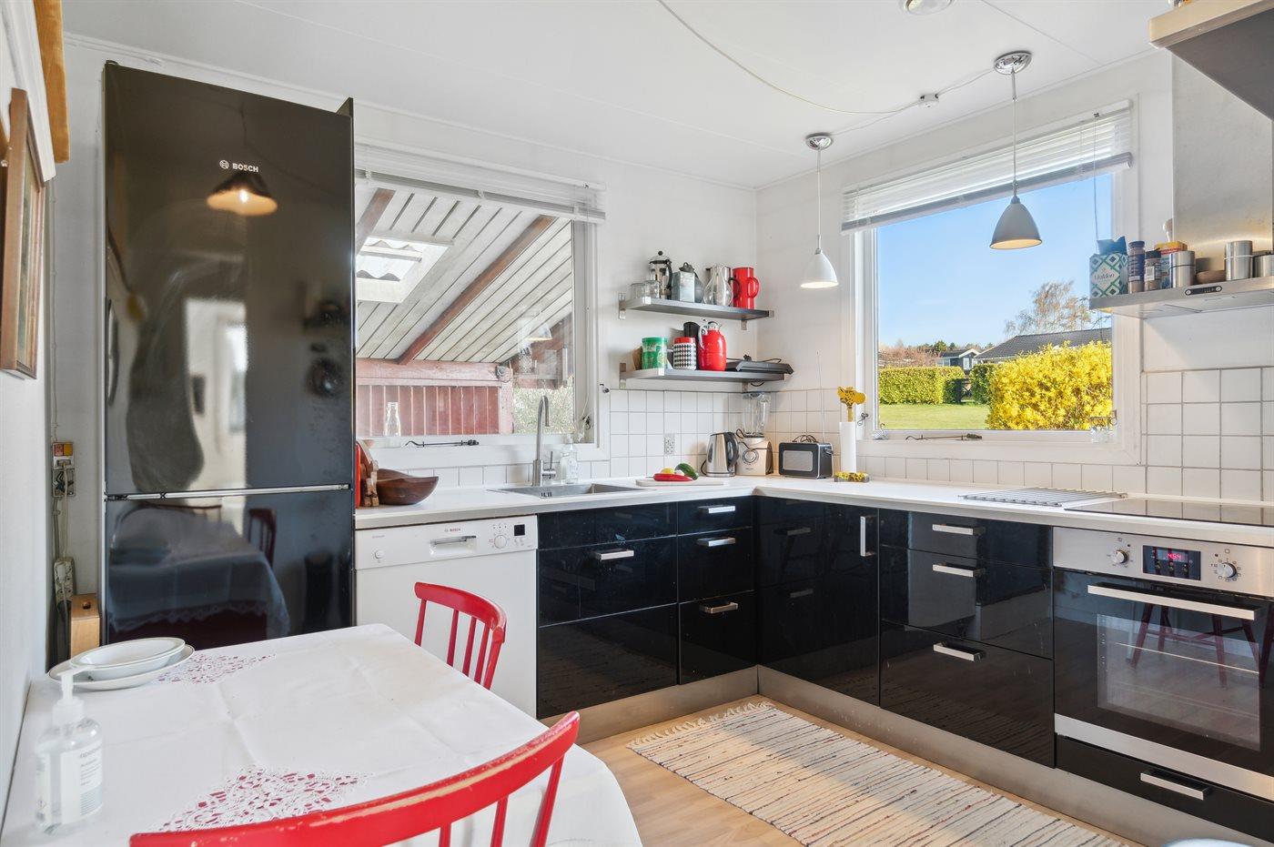 Køkkenet er udstyret med 1 køleskab. Der er 4 keramiske kogeplader, varmluftovn samt opvaskemaskine.