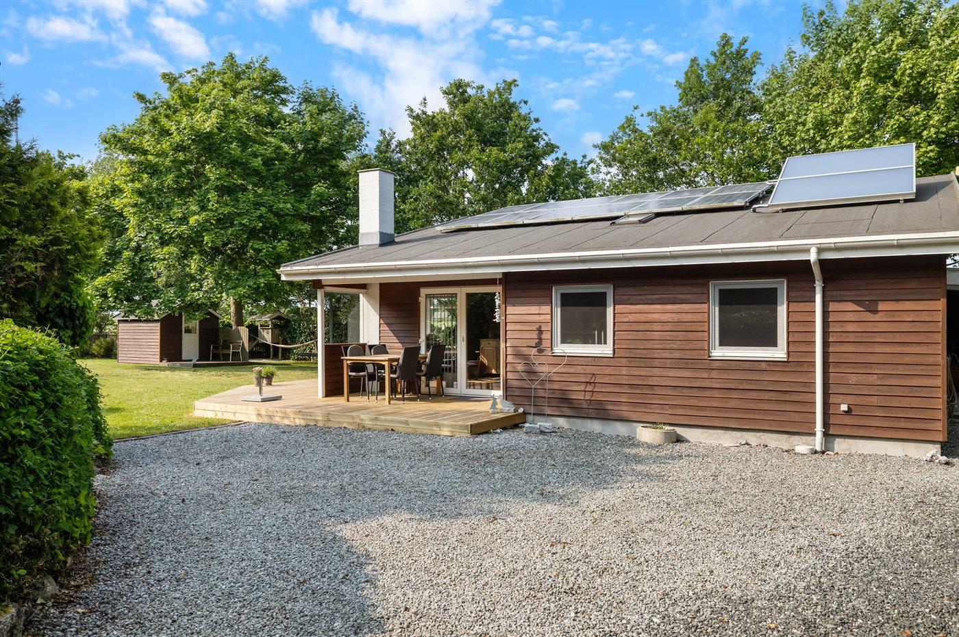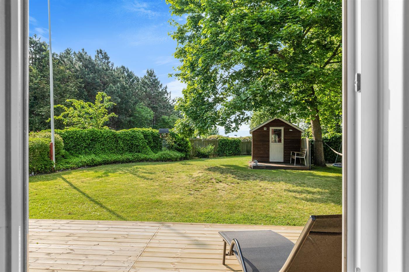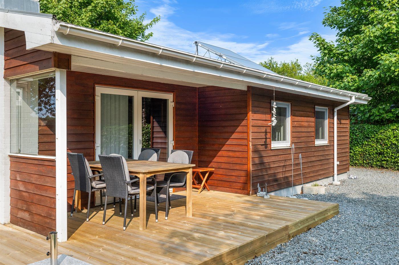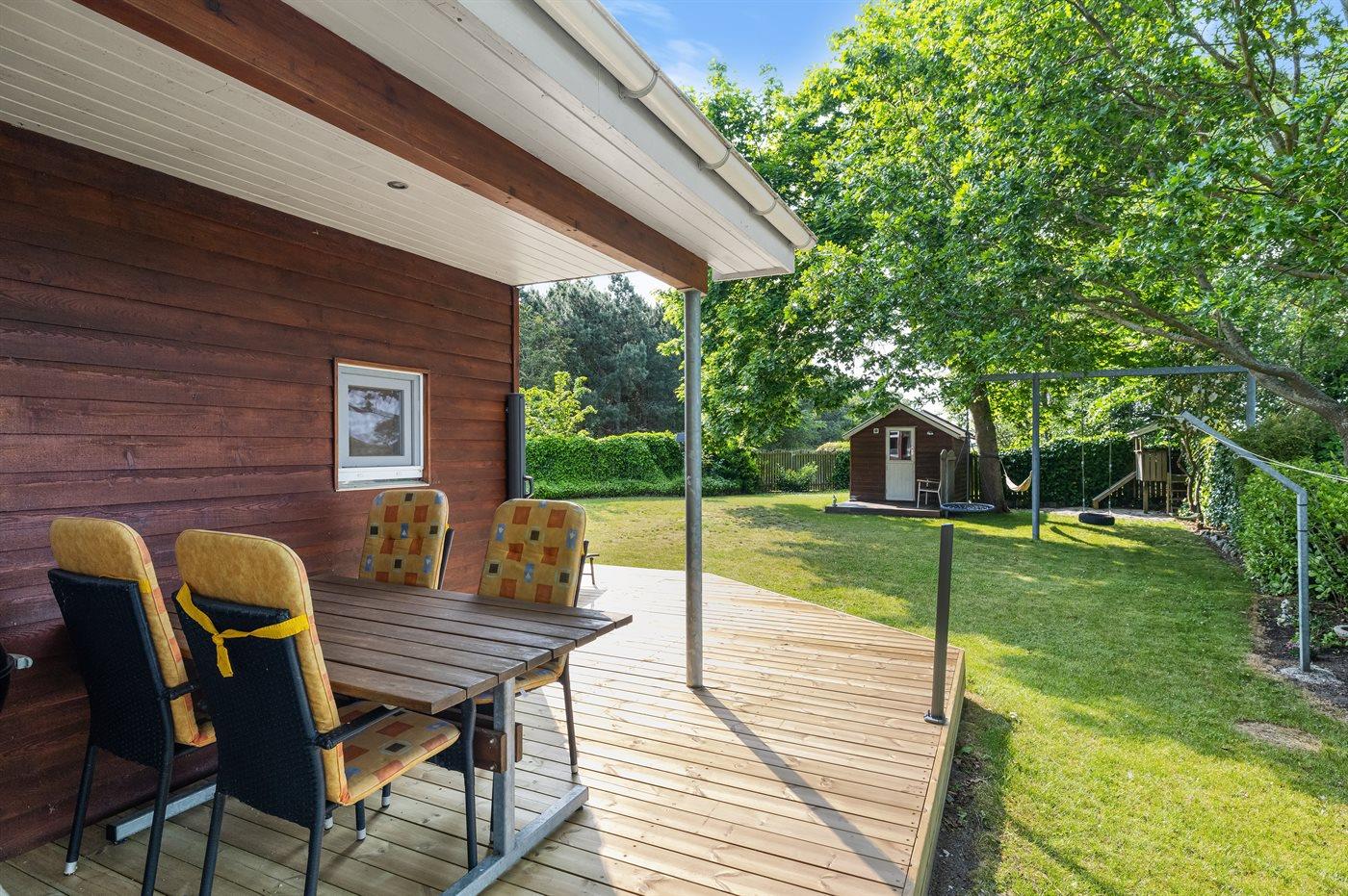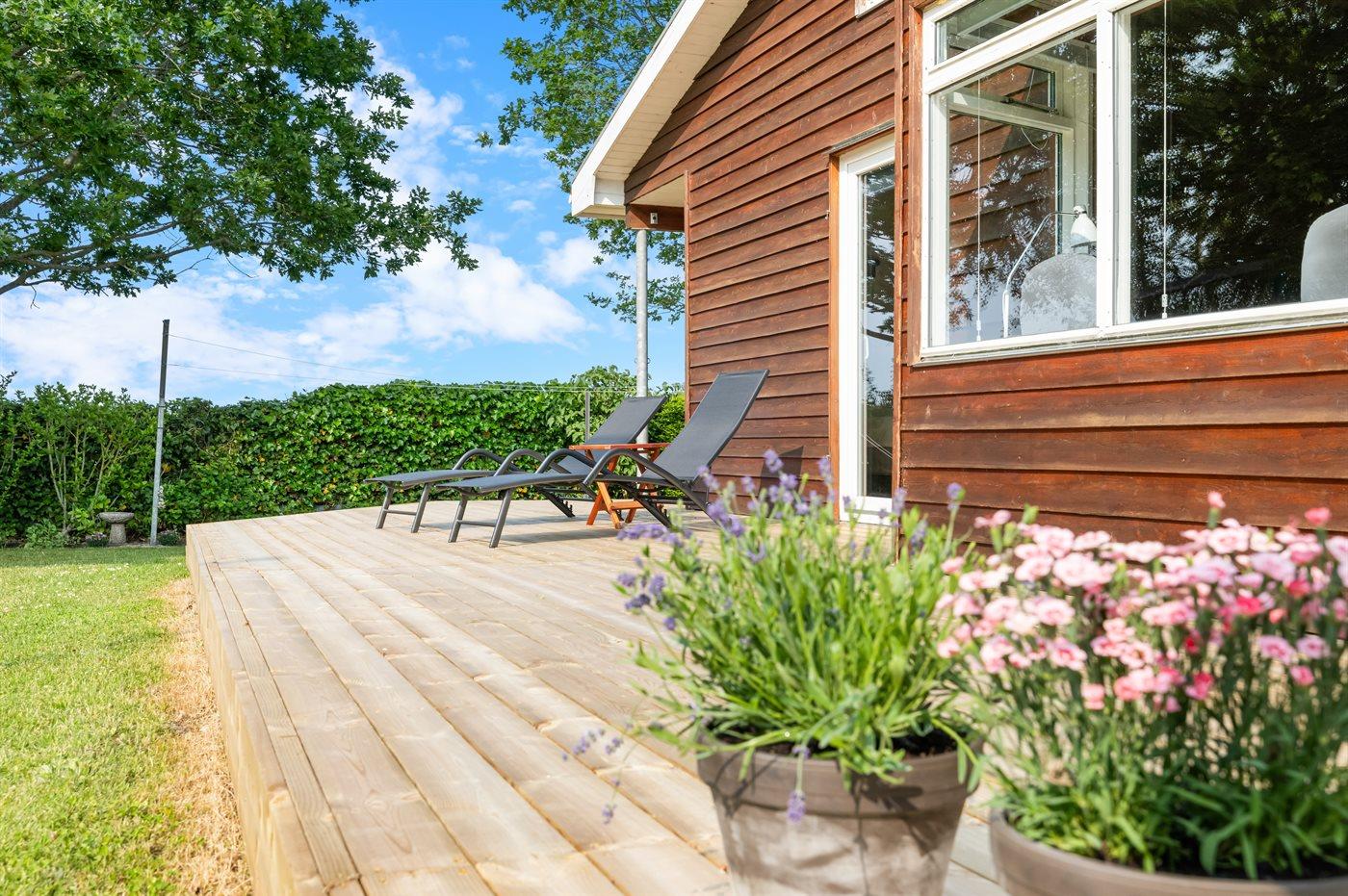 Til huset hører et dejligt, nyanlagt terrasseareal, hvoraf en del er overdækket. Hele grunden er indhegnet, hvilket er en fordel hvis man har hunden eller små børn med på ferie.