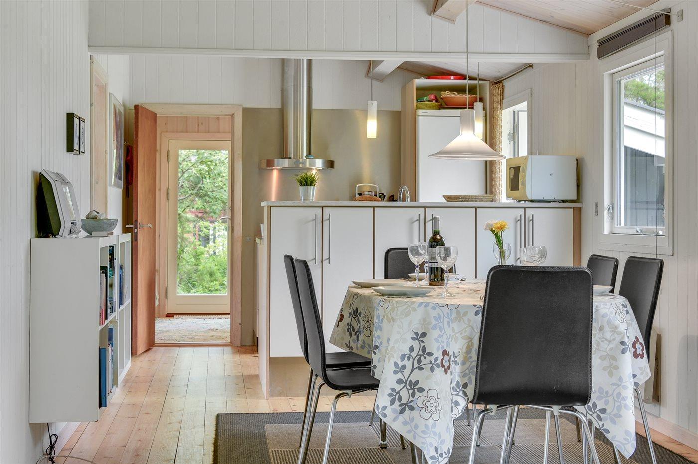 Køkkenet er udstyret med 1 køleskab. Der er 4 induktionskogeplader, varmluftovn, mikrobølgeovn samt opvaskemaskine.