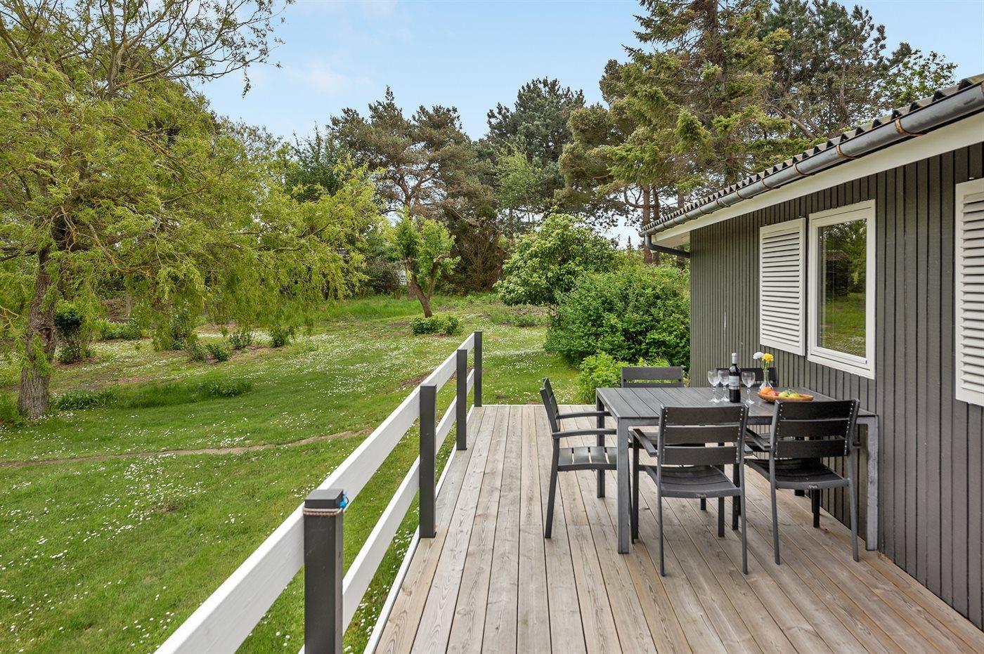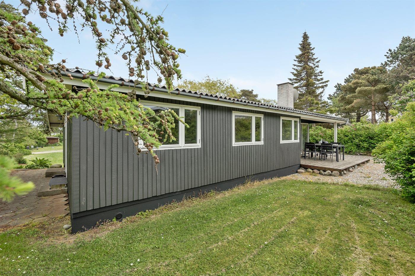 Dette hyggelige sommerhus i træ ligger på en stor grund med mange træer og buske, kun 140 m fra vandet. Fra huset er der udgang til overdækket og åben terrasse med havemøbler. Sommerhuset ligger i et område med en meget smuk natur og et rigt dyreliv.