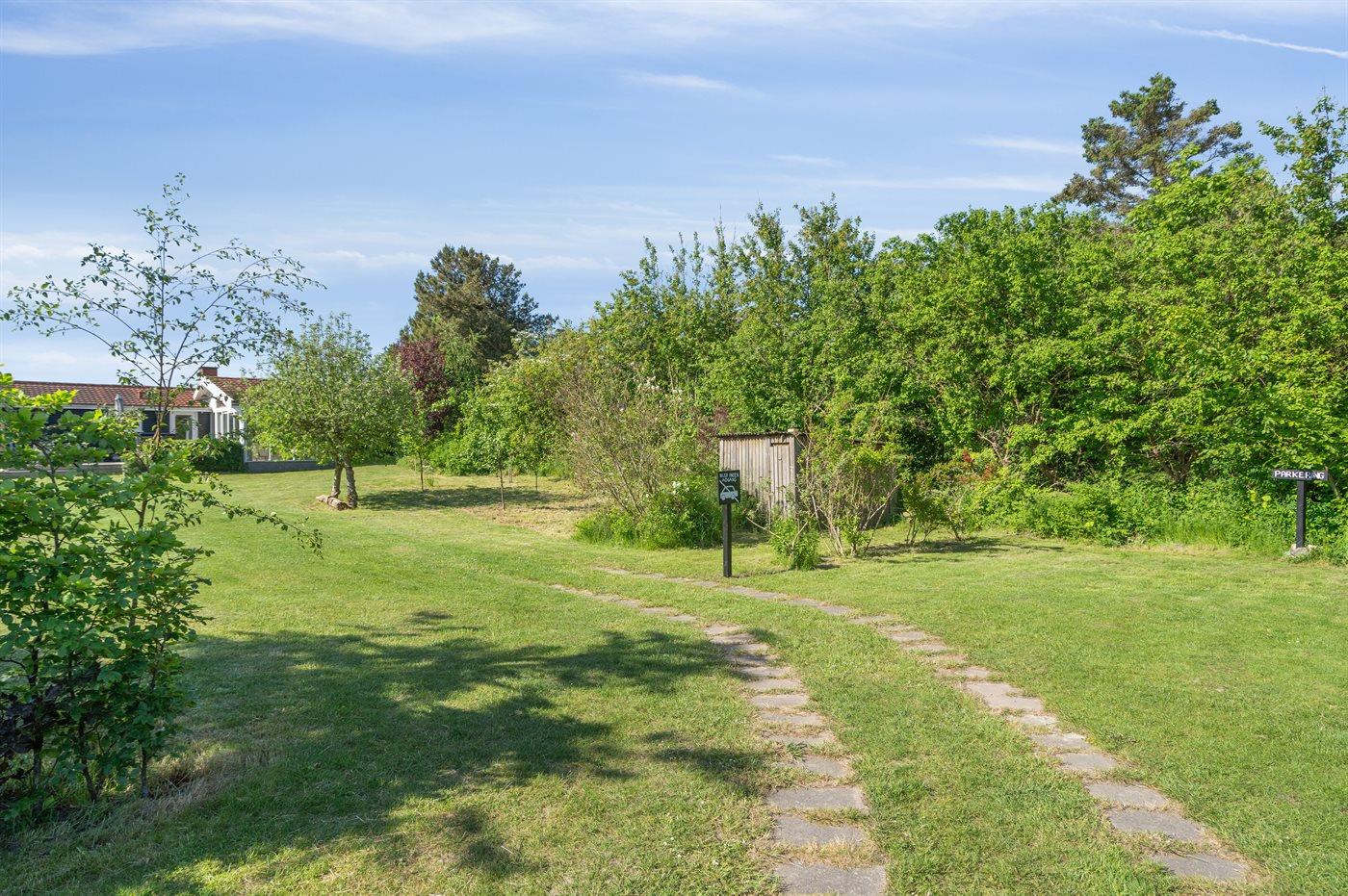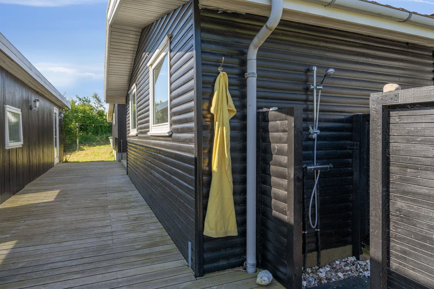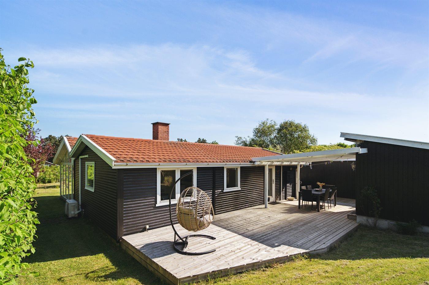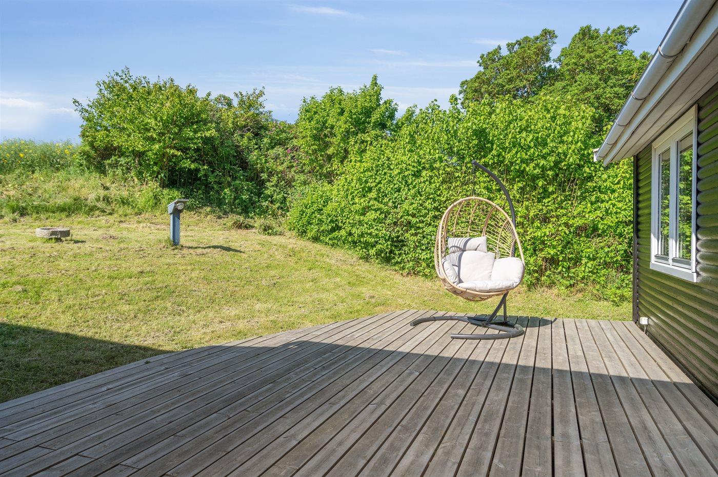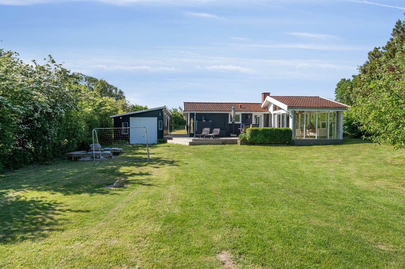 Ferieboligen er beliggende på en 1500 m² stor havegrund. Der er 75 m til havet. Nærmeste forretning er beliggende i en afstand af 7500 m. Til ferieboligen hører åbent terrasseareal. Desuden er der overdækket terrasse. Ligeledes er der adgang til udestue. Fodboldmål. Bålsted. Udendørs bruser. Grill til rådighed. Parkering ved ferieboligen.