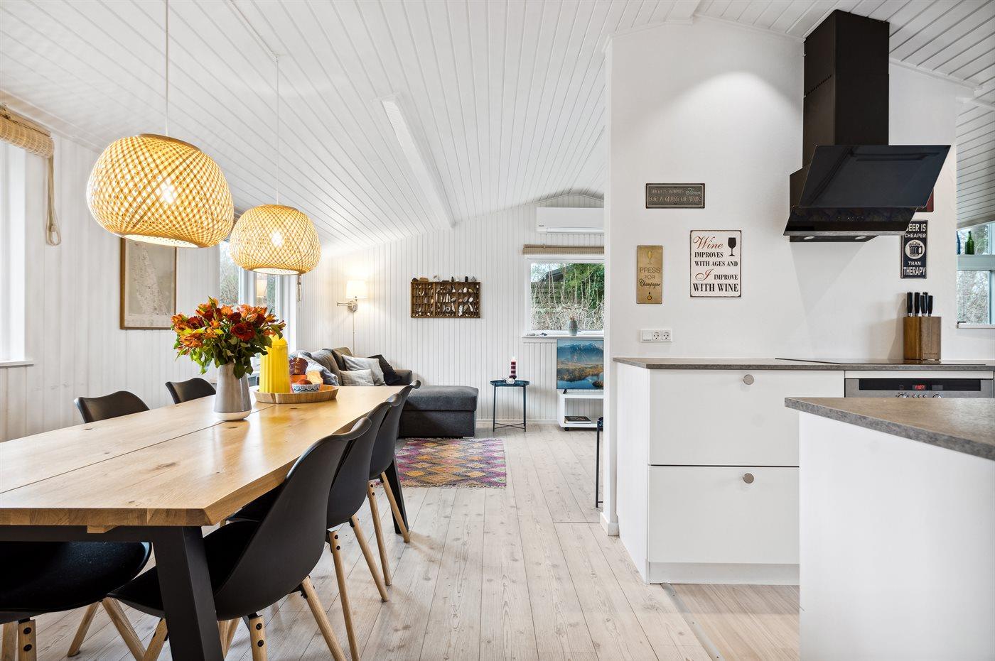 Køkkenet er udstyret med 1 køleskab. Der er 4 induktionskogeplader, varmluftovn, mikrobølgeovn samt opvaskemaskine.