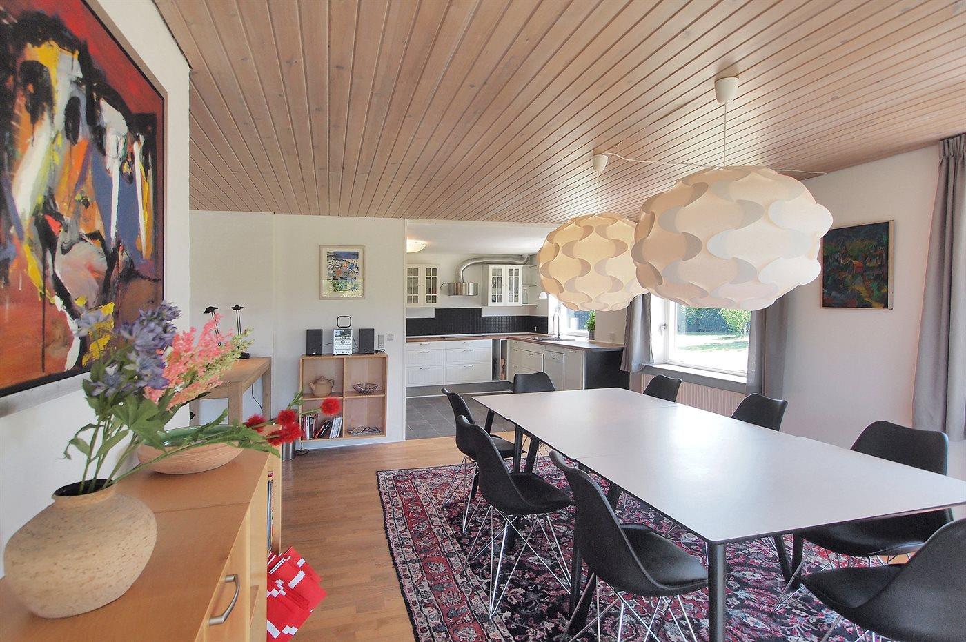 Huset er skønt og rummeligt, og i stueetagen finder man et stort, åbent køkken, spiseafdeling, soveværelse samt opholdsstue. Stort badeværelse og på første sal et gæstetoilet. Du finder ligeledes fem store storeværelser, og dermed er huset optimalt for den store familie eller, hvis du ønsker at ”bo sammen hver for sig”. Fra stuen er der udgang til den store terrasse og den skønne have, hvor børnene kan boltre sig timevis. Her finder du også grillen, hvor lækre måltider kan tilberedes.