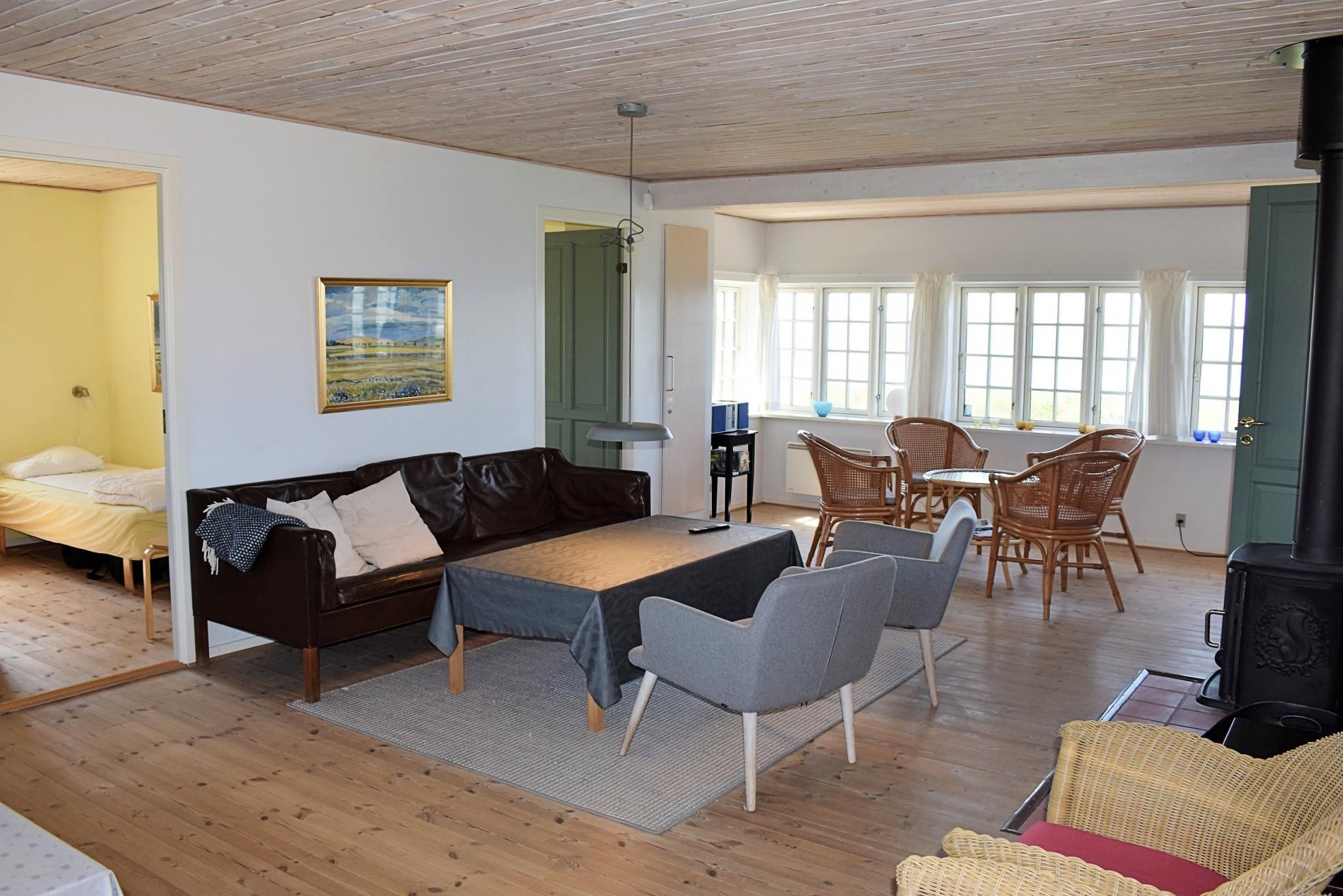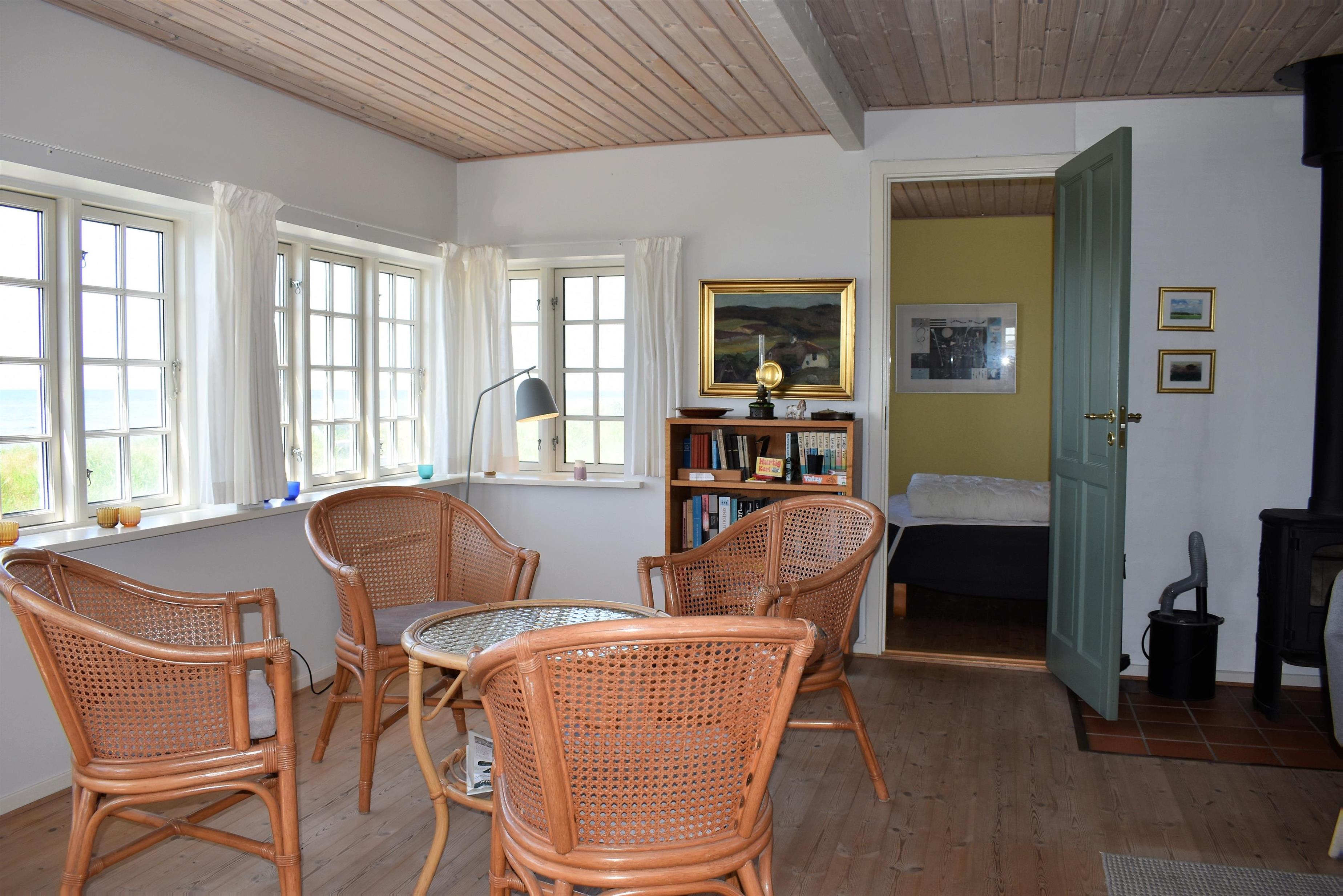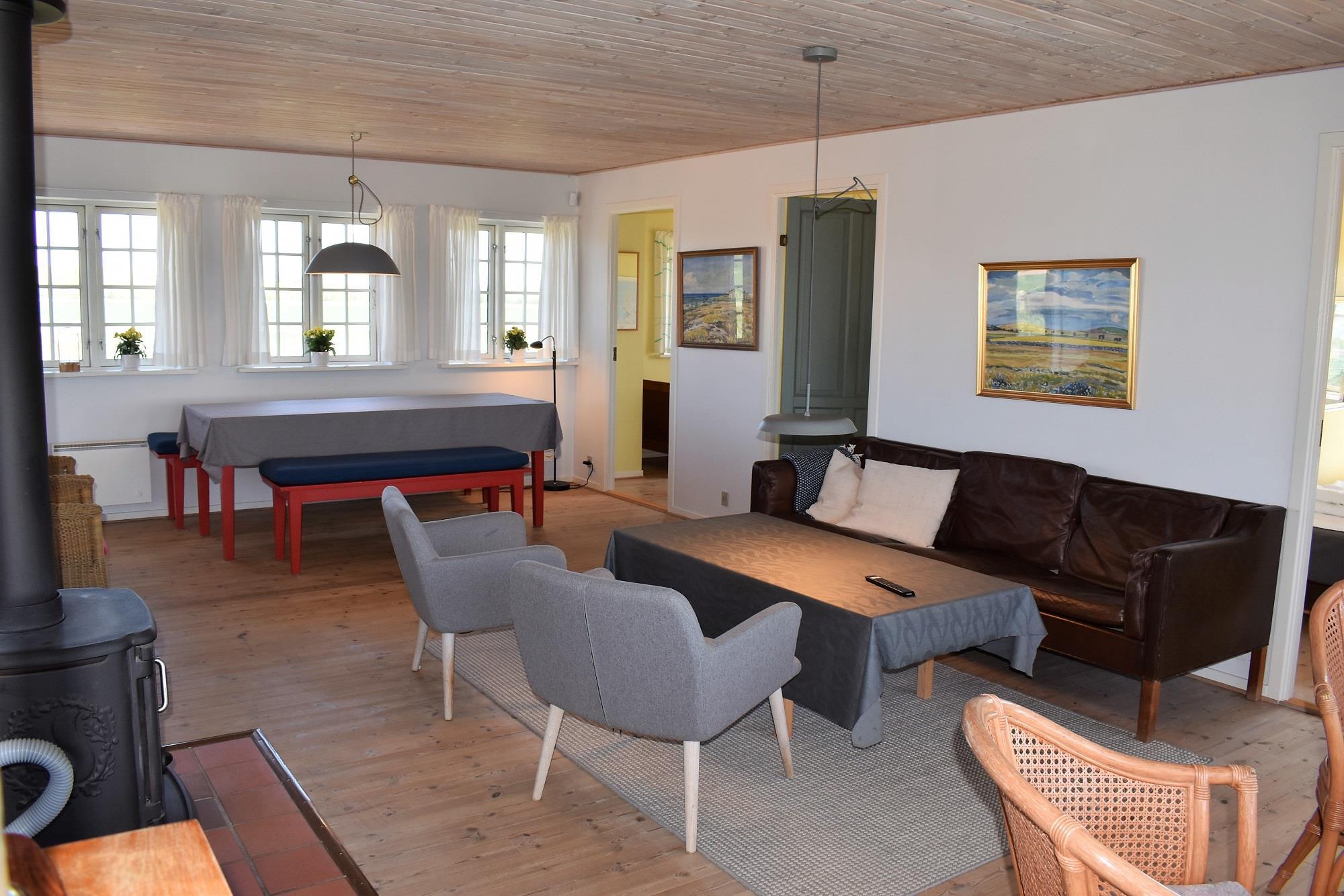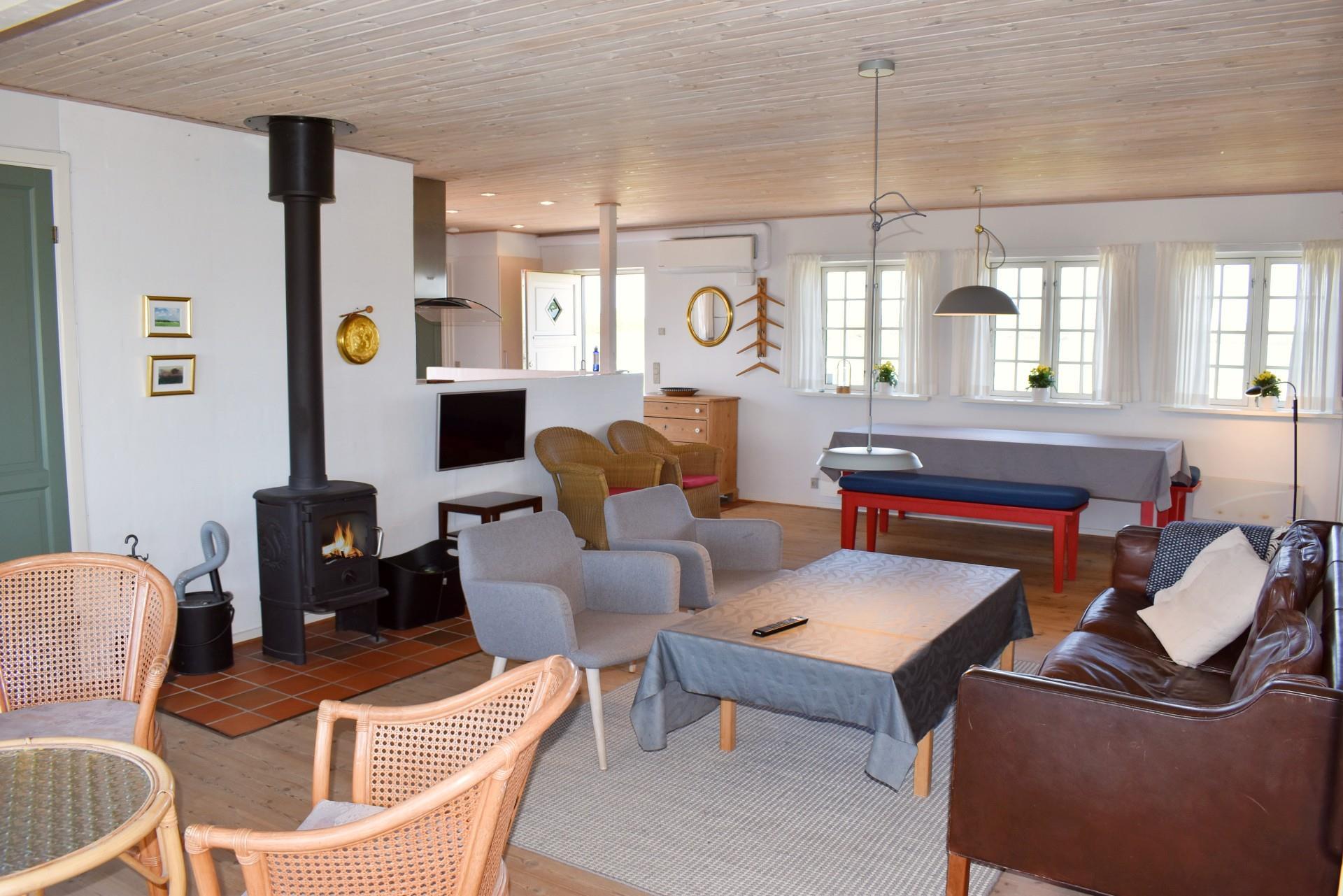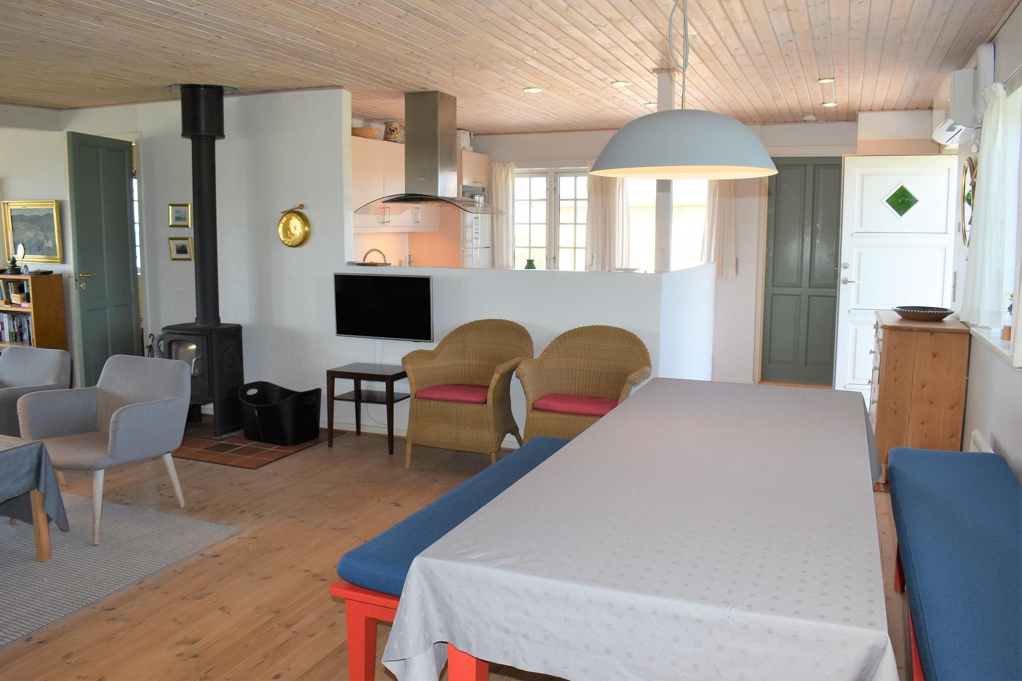 Sommerhuset er lyst og hyggeligt indrettet med et åbent køkken, der er forbundet med en rummelig stue. Her skaber brændeovnen hygge på kølige aftener, mens den energibesparende varmepumpe sikrer en behagelig temperatur året rundt. Huset rummer tre gode soveværelser, ideelle til både familier og par, samt et badeværelse med både vaskemaskine og tørretumbler for ekstra komfort.