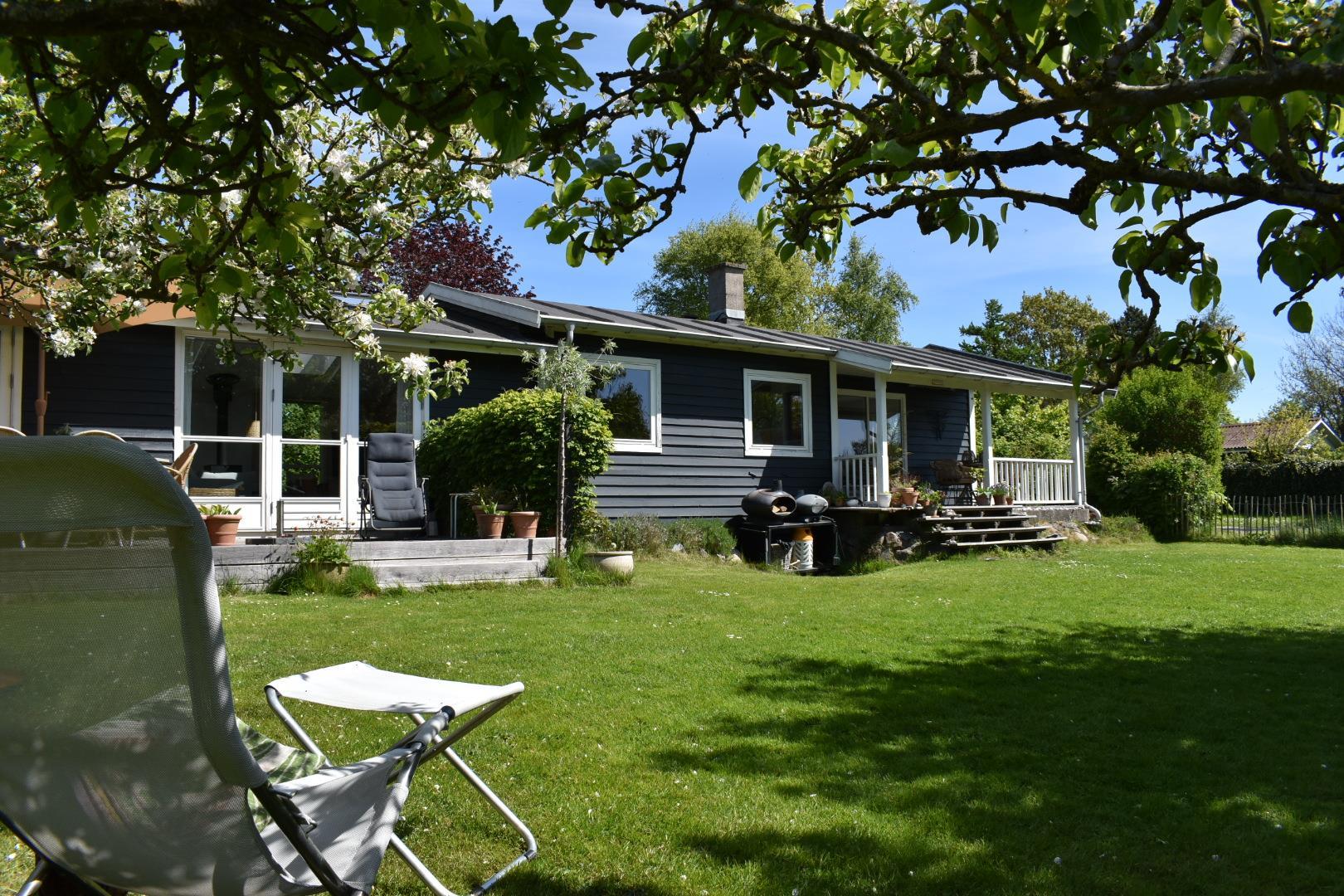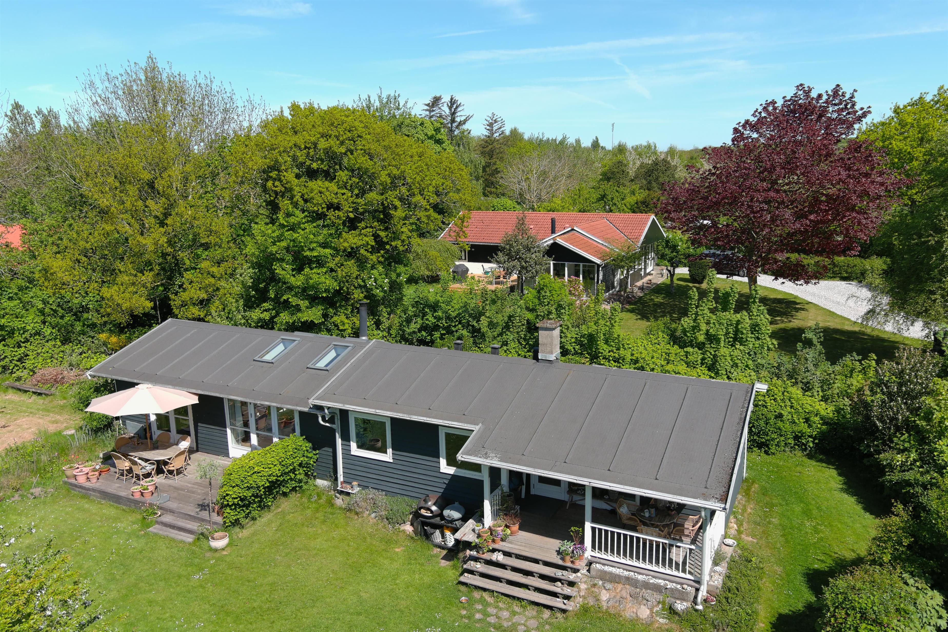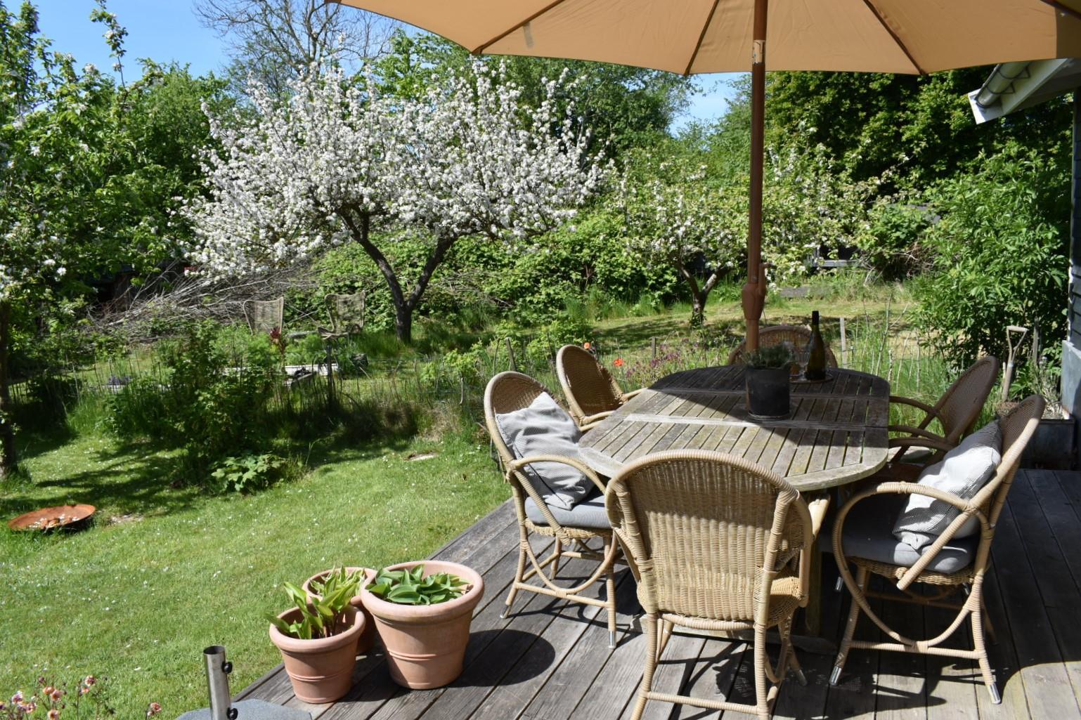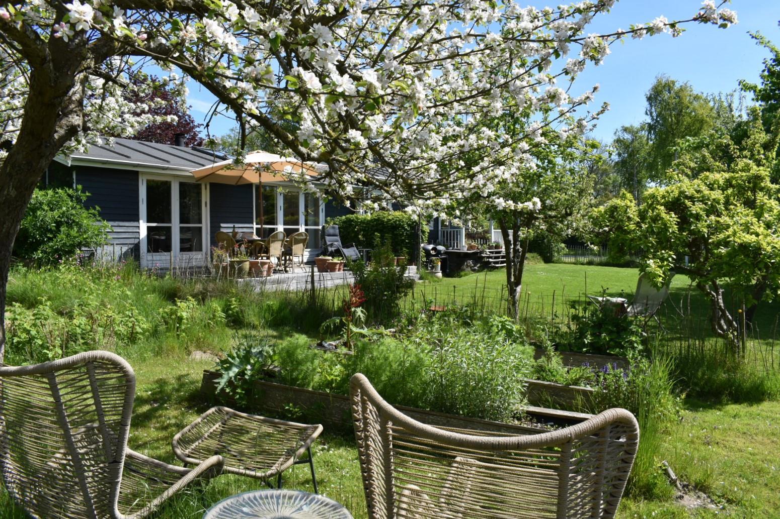 Grunden er helt indhegnet, så din hund trygt kan færdes frit. Bagerst i haven finder du tre shelters – perfekte til børnenes leg eller en nat under åben himmel. Haven er bevidst holdt vild og naturlig for at skabe gode forhold for fugle og insekter – en lille oase for naturelskere.