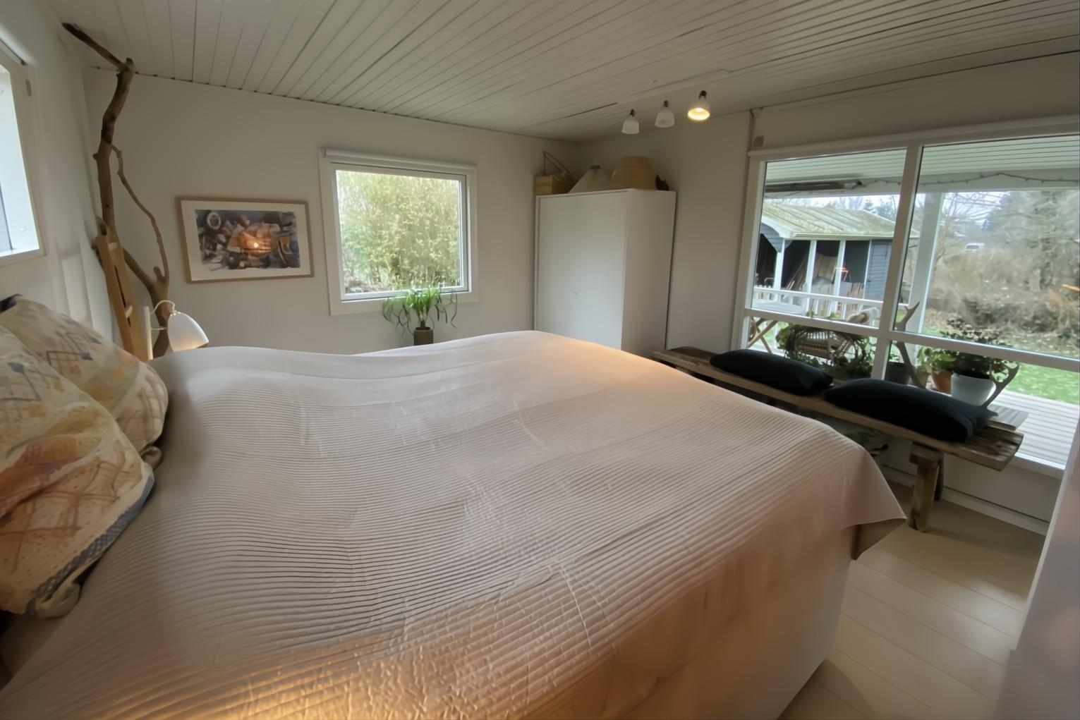 Der er to lyse og indbydende soveværelser – begge med dobbeltsenge – samt et pænt badeværelse med bruseniche, gulvvarme og vaskemaskine/tørretumbler. Fra både køkken og stue er der udgang til en dejlig terrasse og en overdækket veranda, hvor du kan nyde udsigten til den frodige have, omgivet af træer og buske.