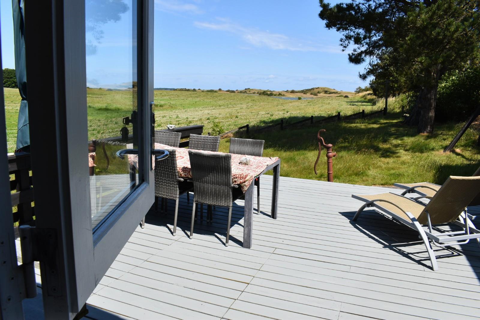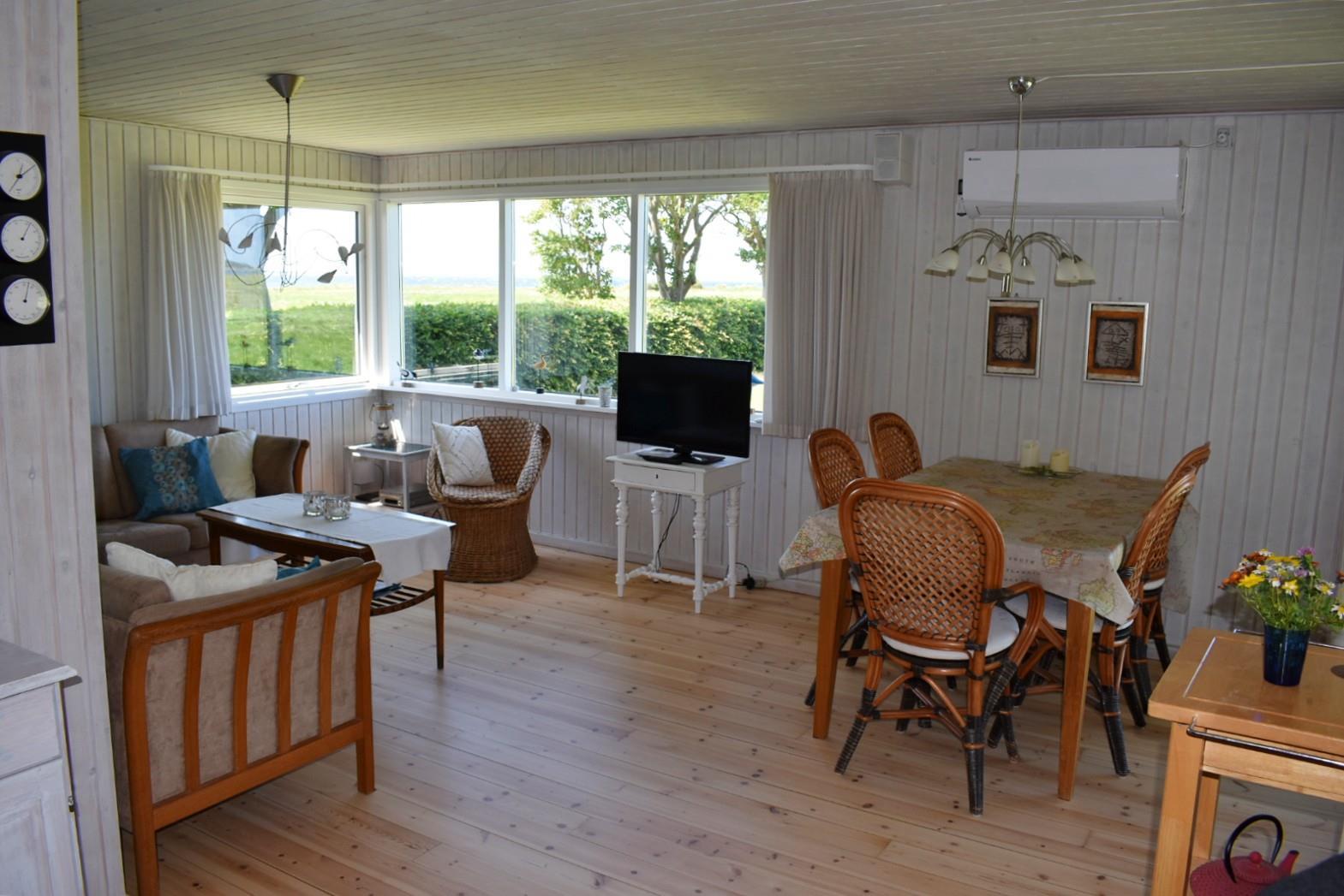 Huset er ældre, men hyggeligt og funktionelt. Her er tre soveværelser med i alt 6 sovepladser: én dobbeltseng, 2 enkeltsenge og 2 køjer. Et stort badeværelse med vaskemaskine og tørretumbler, samt en lys stue med panoramaudsigt og udgang til både udestue og stor træterrasse, hvor udelivet rigtig kan nydes. Herfra har du frit udsyn over en smuk, uspoleret mark og fjorden mellem Langø og Fyns Hoved. Køkkenet er nyt fra 2024 og fuldt udstyret. Der er ikke TV-pakke, men mulighed for at streame via chromecast.