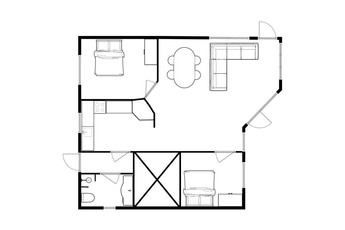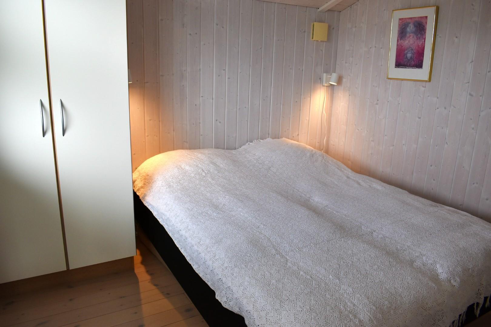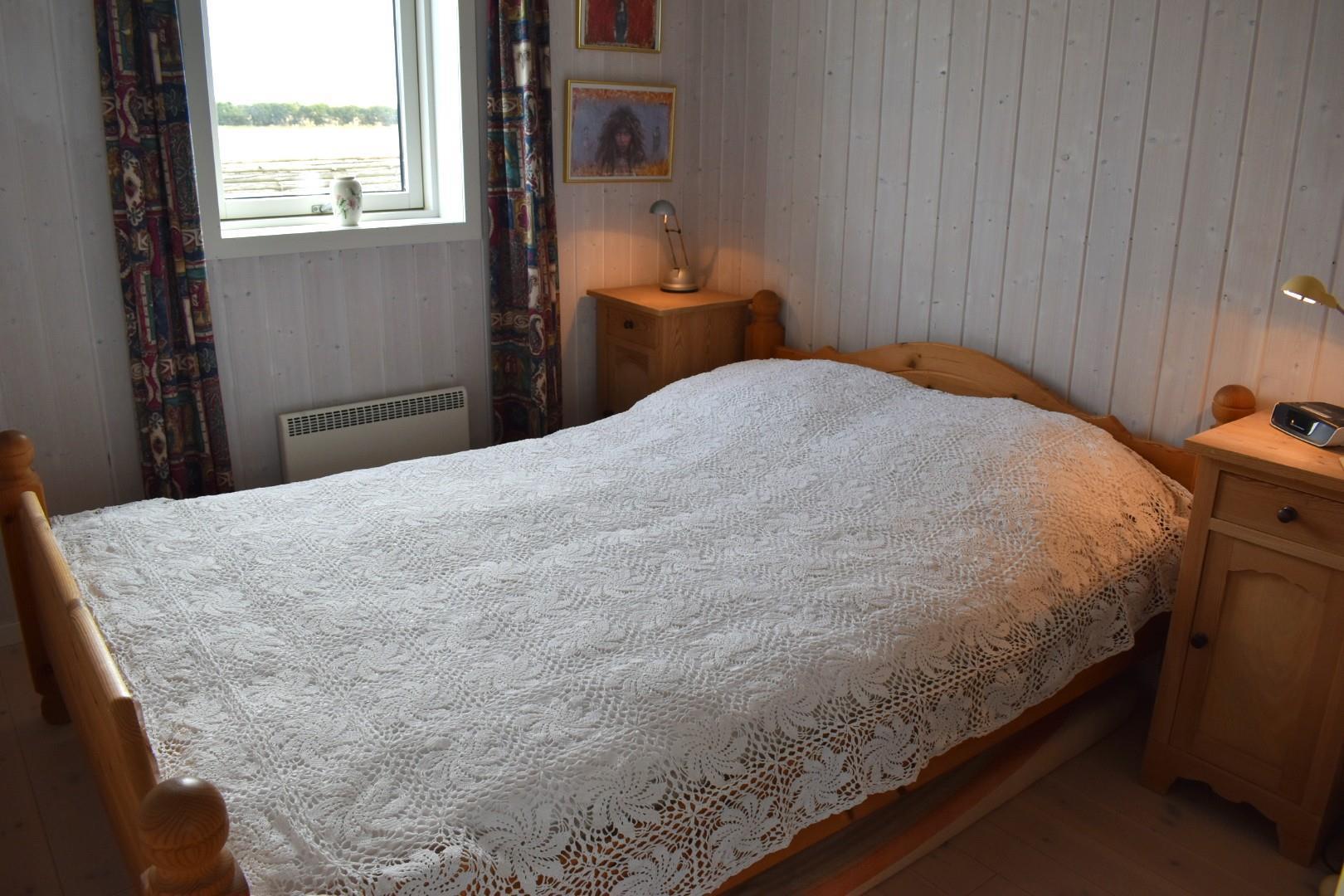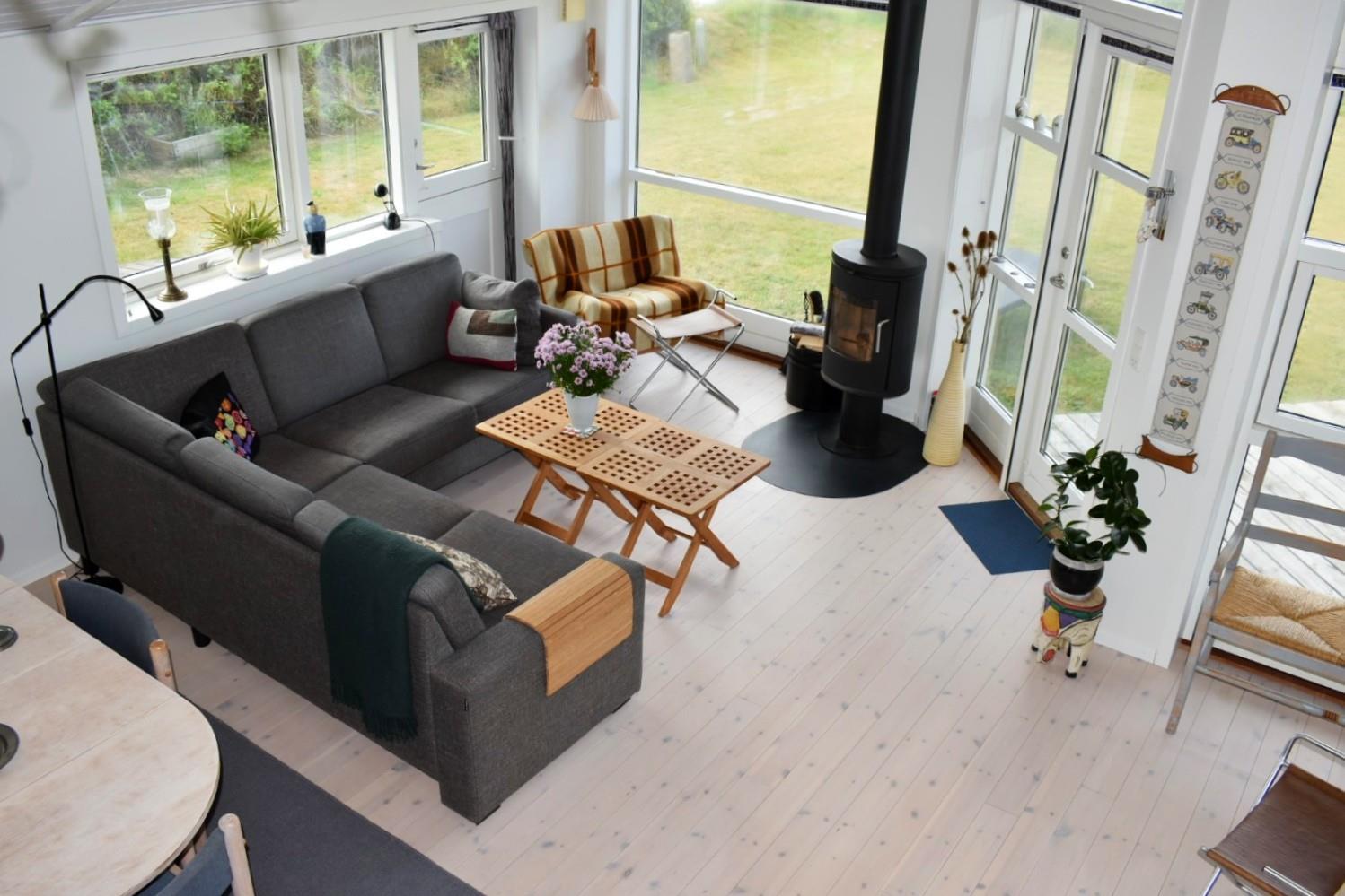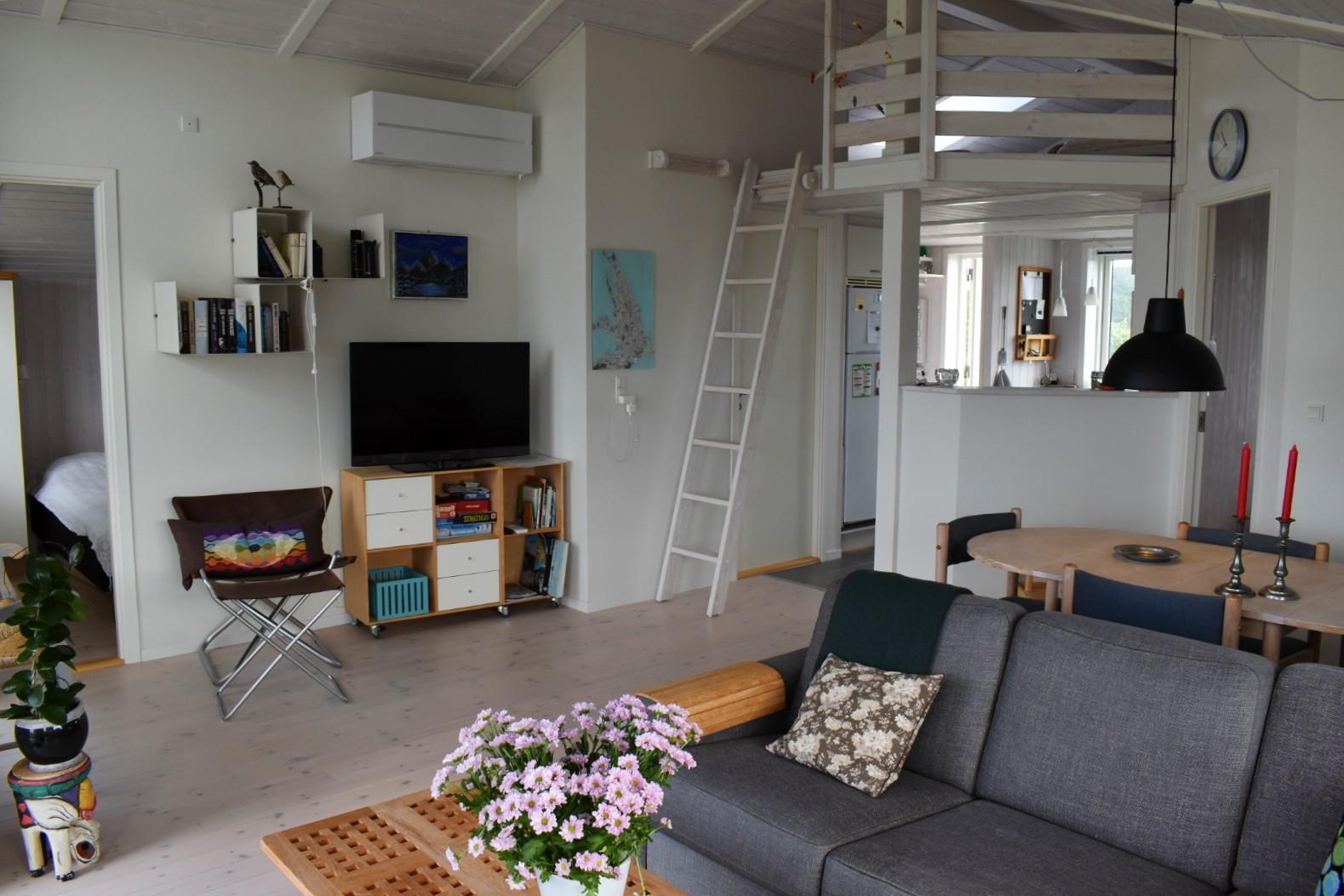 Sommerhuset er lyst og moderne indrettet med to komfortable soveværelser, med en dobbeltseng i hver (140 cm og 160 cm, som kan arrangeres som enkeltsenge), et badeværelse med vaskemaskine samt et fuldt udstyret køkken, der er åbent forbundet med den hyggelige stue. Herfra kan du nyde den fantastiske udsigt over vandet – både fra sofaen og fra det ene soveværelse. Stuen er desuden udstyret med en brændeovn, som skaber ekstra hygge på kølige aftener, samt en energibesparende varmepumpe. Fra stuen er der adgang til en hems med 2 madrasser. Huset har ingen TV-kanaler, men TV med Chromecast giver mulighed for at streame fra din telefon eller Ipad. Der er gulvvarme i bad, gang og køkken.