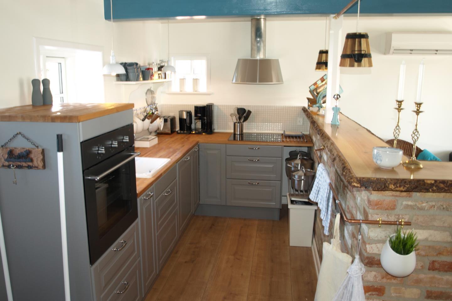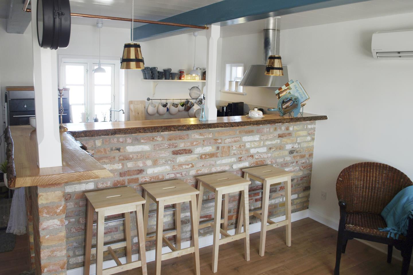 Dejligt, velindrettet køkken med opvaskemaskine i åben forbindelse med stuen. Der er bardisk og barstole, så man kan følge med i, hvad der foregår i køkkenet.