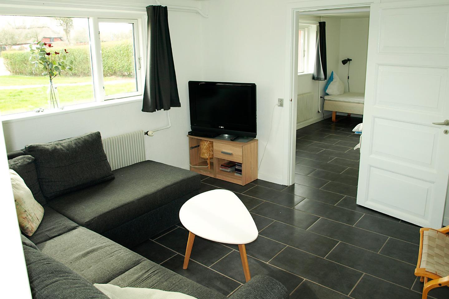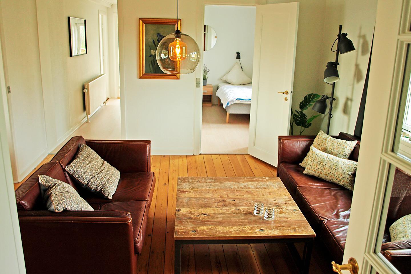 Der er en dejlig stor stue med brændeovn, og her er også gratis internet.
