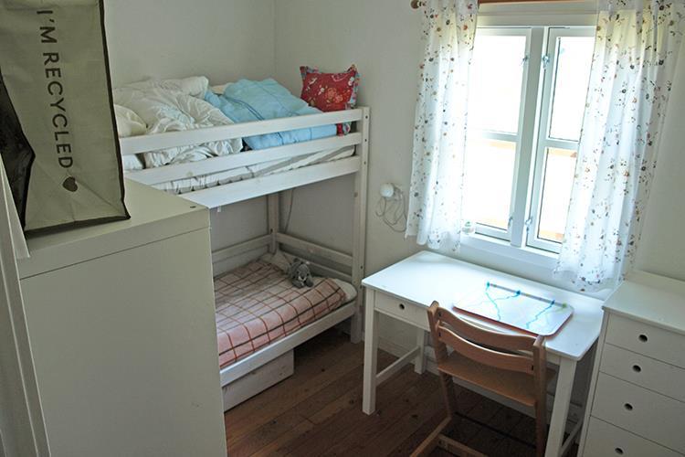 Her er 2 soveværelser. Det ene er indrettet med en dobbeltseng (to enkeltsenge der er stillet sammen) og det andet er indrettet med en køjeseng med to sovepladser. Her er der også en lille arbejdsplads med plads til en pc, hvis I lige har noget, I skal klare.