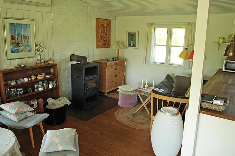 Dejligt køkken med opvaskemaskine og halvdør ud til haven. Skønt en sommermorgen at kunne åbne den øverste halvdør og nyde en kop kaffe og udsigten til alt det grønne. Køkkenet ligger i åben forbindelse med stuen, der har brændeovn og dør ud til terrassen. Stuen er hyggeligt indrettet med en dejlig spiseplads ved vinduet og hyggekrog med lænestole.