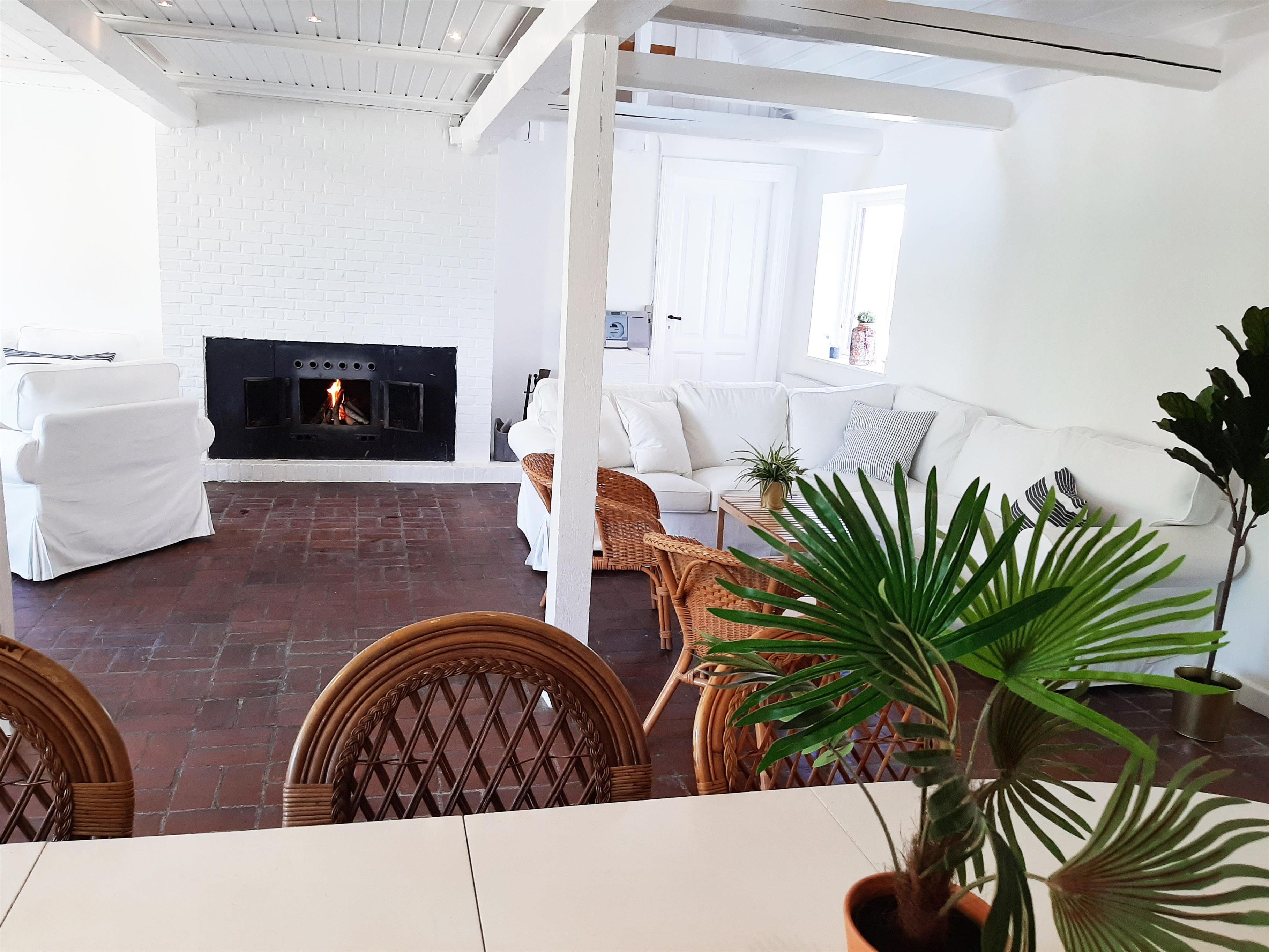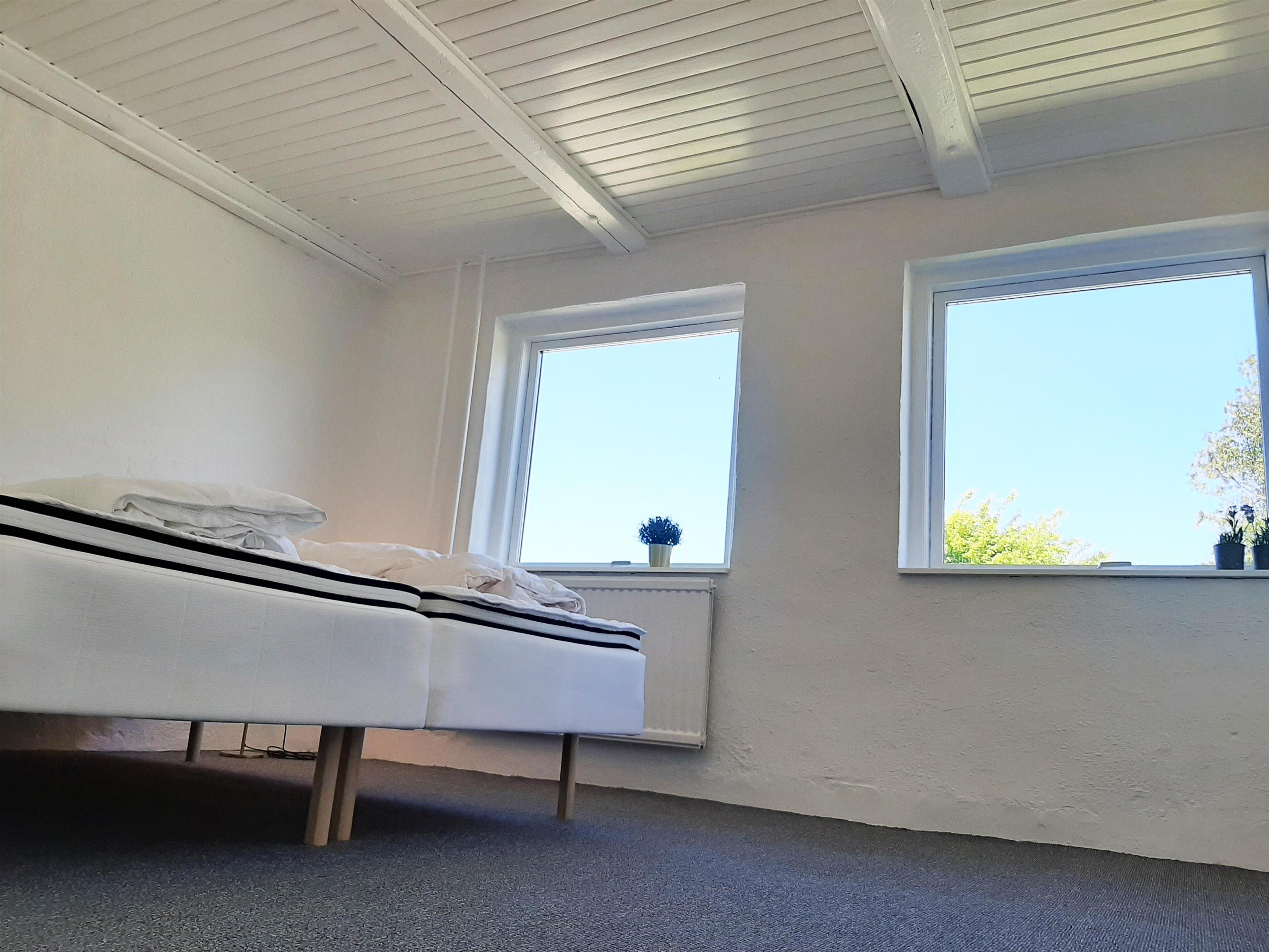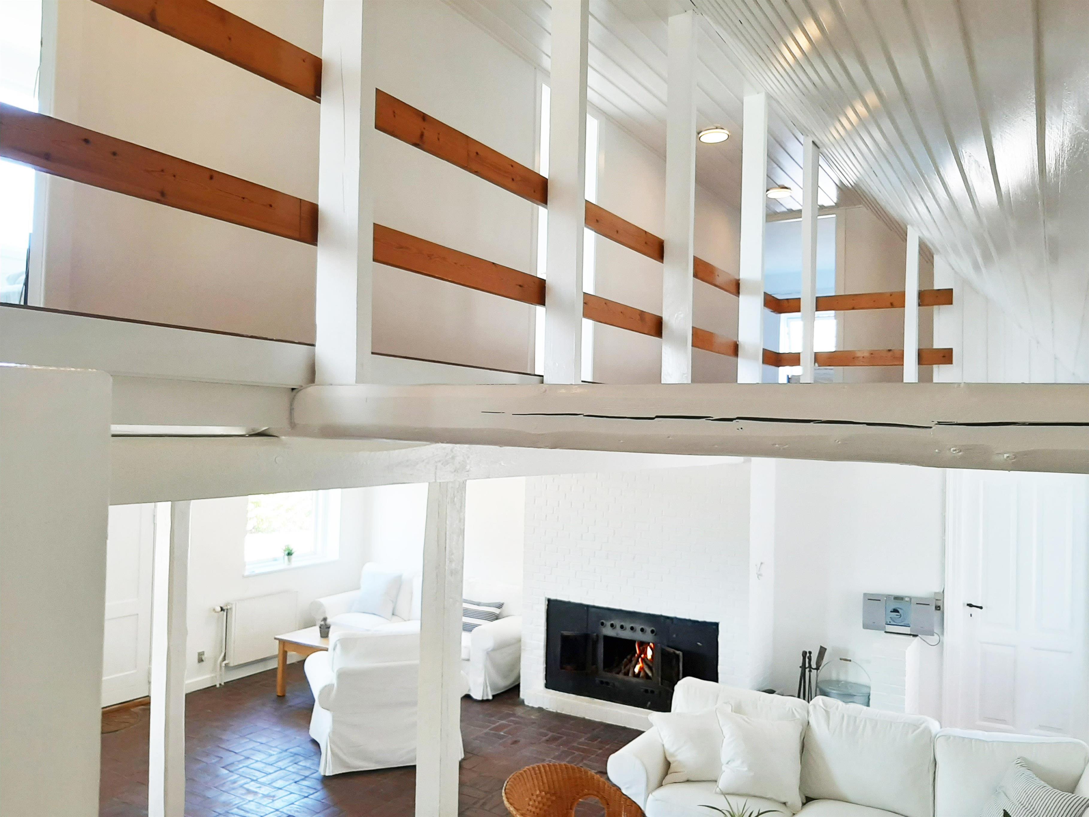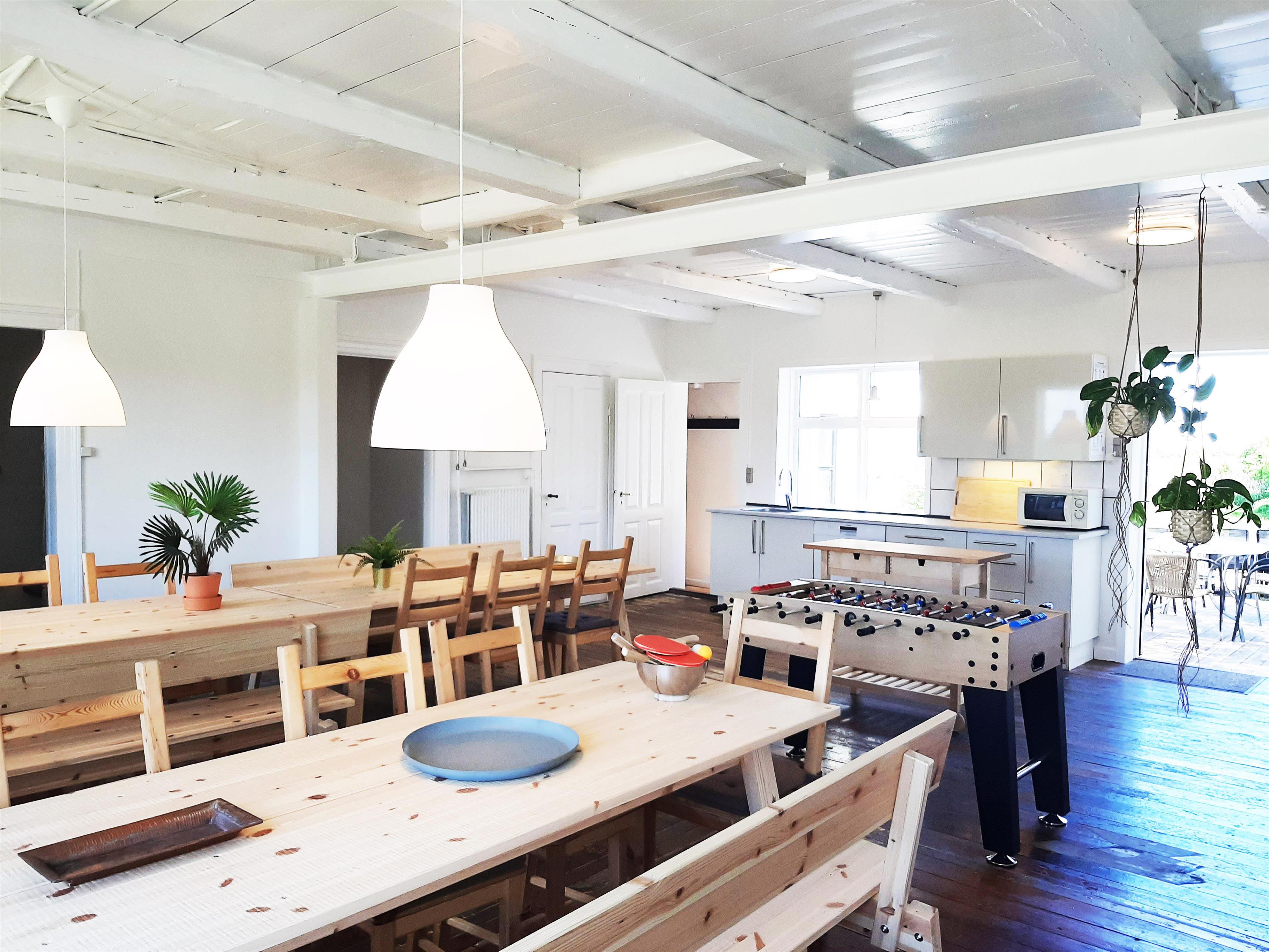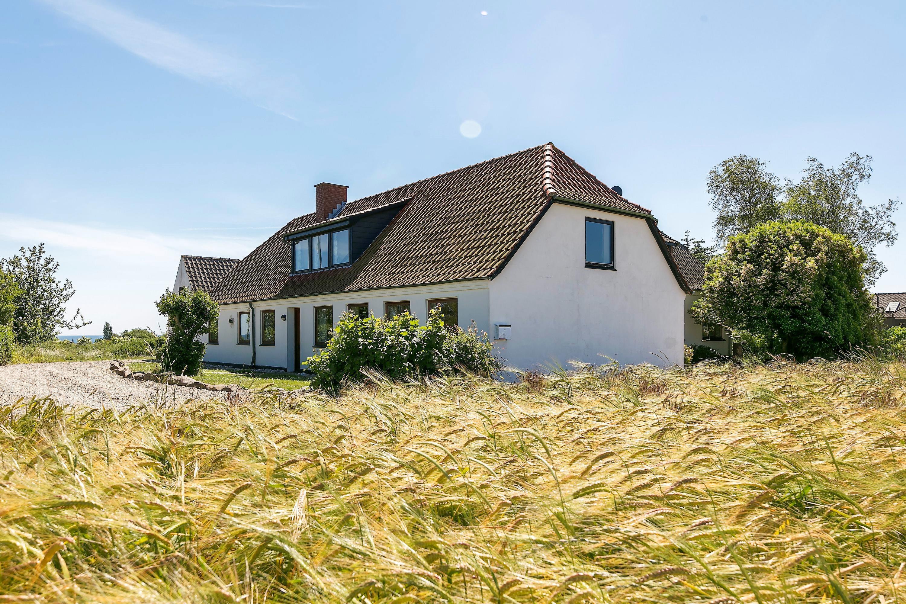 I stueetagen findes ligeledes et stort køkken-alrum med god plads til at lave mad med familie og venner, samt spise, hygge eller spille brætspil ved de store spiseborde. Der er desuden 4 badeværelser placeret i stueetagen med klinkegulve og hertil tre soverum. Fra opholdsstuen er der opgang til 1. sal, hvor der befinder sig fire af husets soverum og en lang gang med udsigt ned til pejseområdet. Fra køkken-alrummet er der adgang til yderligere en 1. sal med to tilhørende soverum, som har den smukkeste udsigt over landskabet og med havet i det fjerne. Huset ligger i rolige og idylliske omgivelser omgivet af marker og kun 500 meter fra en dejlig strand.
