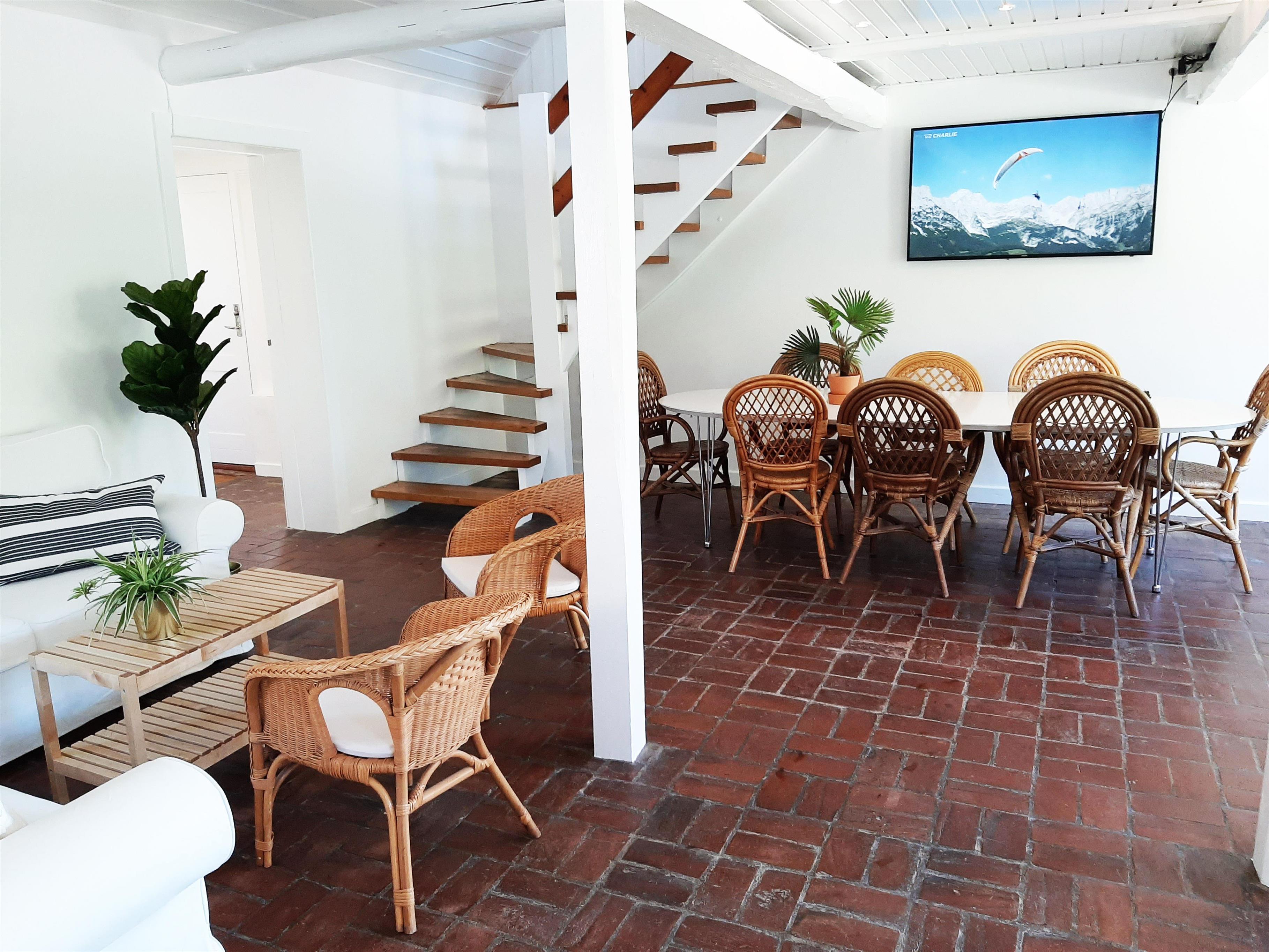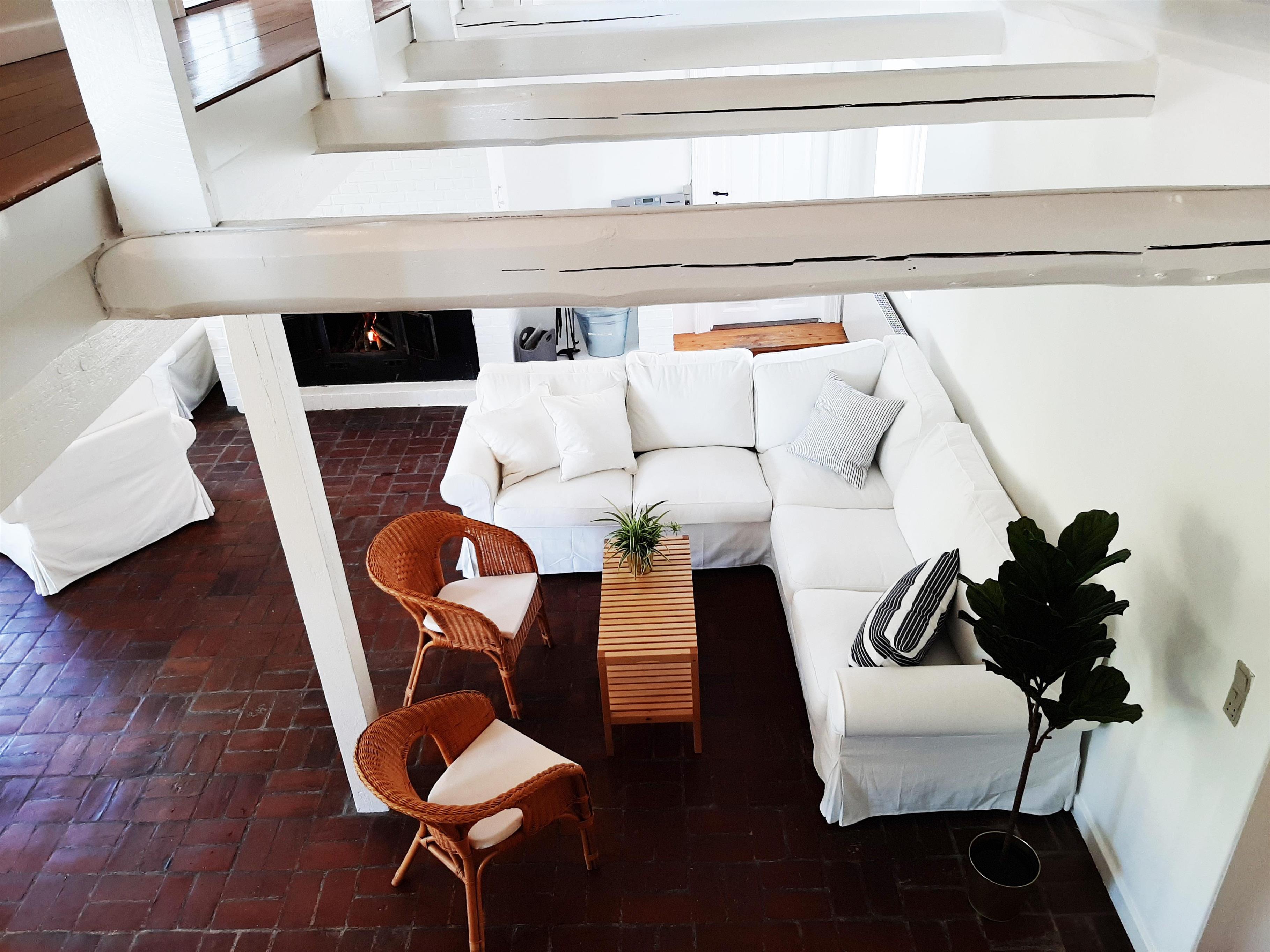 Huset er bygget i 1900 og er under løbende renovering. Derfor møder man som lejer en blanding af nyt og gammelt. Stueetagen er indrettet med stor opholdsstue med synlige bjælker og dertilhørende pejseområde til afslapning og aktiviteter til familien. Pool-området er det østligste punkt i huset, hvor man har mulighed for at skimte ned over marken og ud mod havet, imens man opholder sig ved den 30m2 store swimmingpool med børnepool og stor sauna i tilstødende rum. Der er desuden udgang fra pool-området til have og terrasse.
