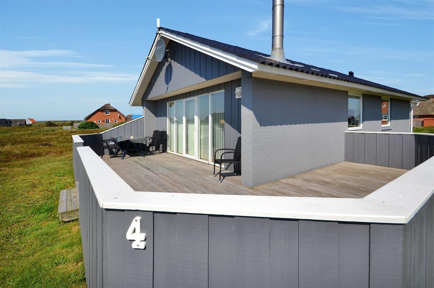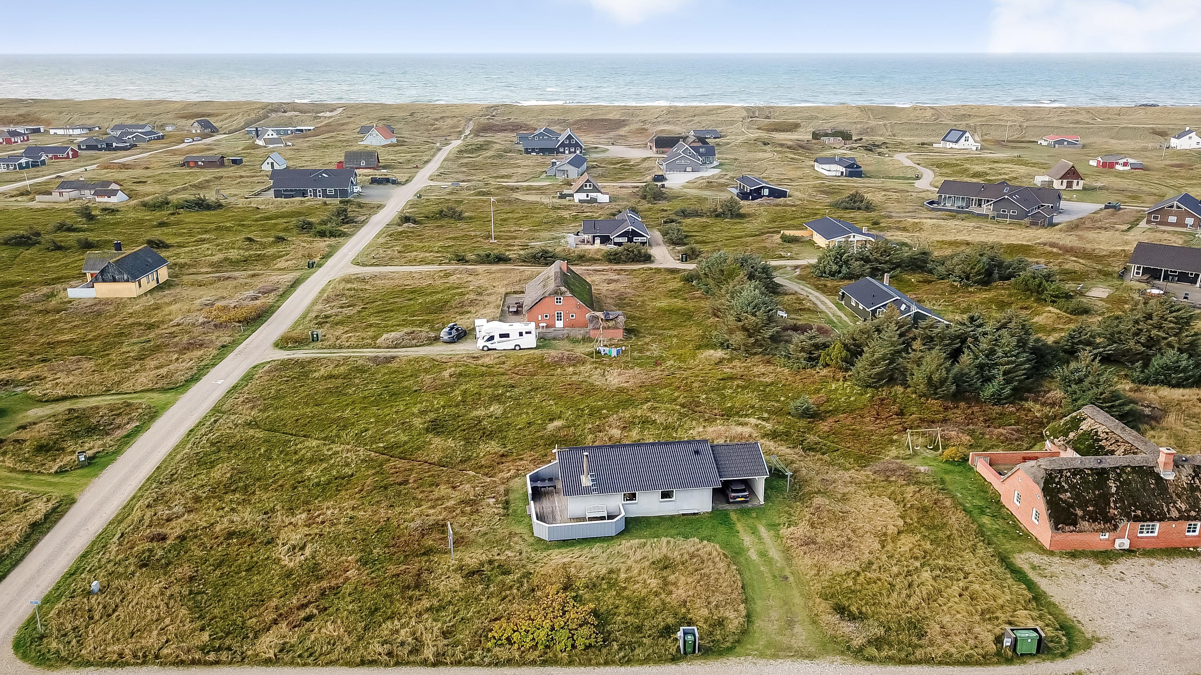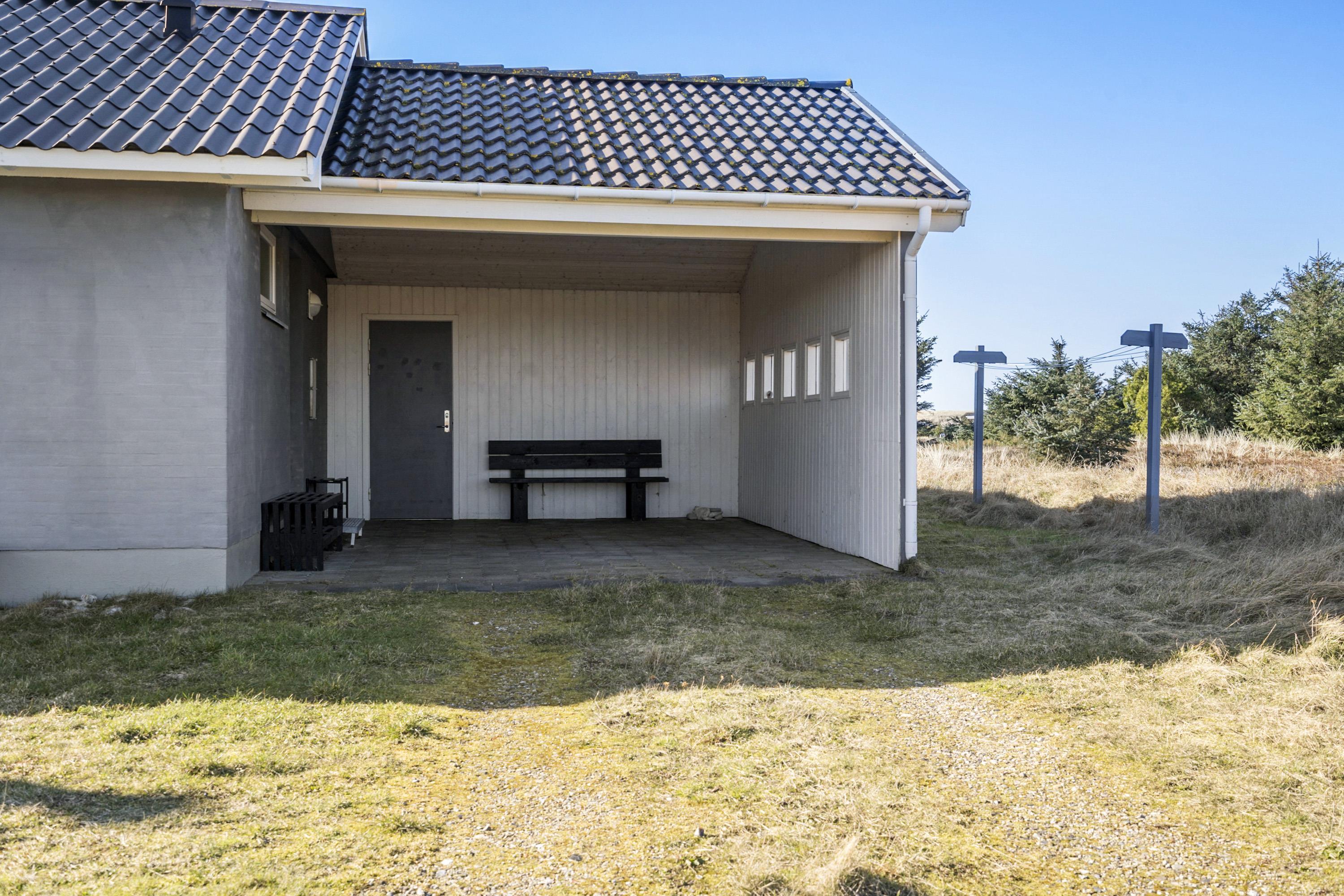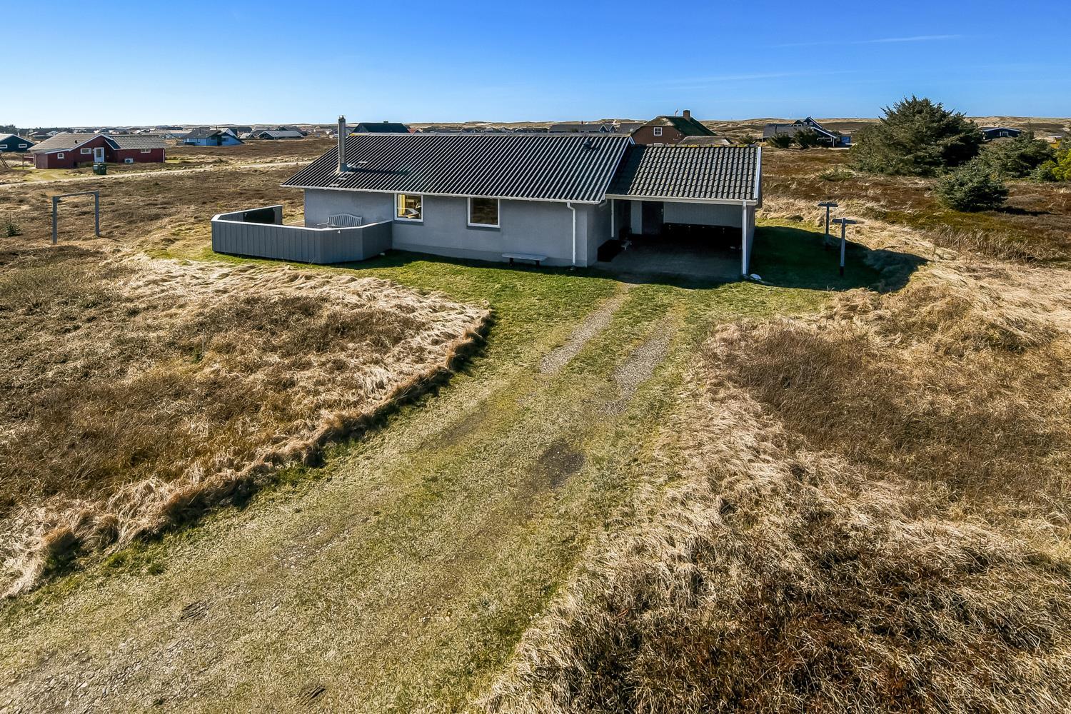 Fra opholdsstuen er der udgang til en dejlig indhegnet terrasse med havemøbler, liggestole og grill. Carport og ekstra opbevaringsrum. Et rigtig godt sommerhus med den perfekte beliggenhed på en dejlig naturgrund tæt på det unikke Vesterhav som er et dagligt besøg værd både på solrige- som på blæsende dage. Hop ind i bilen eller tag cyklen og hent morgenbrød til familien i hos de nærved liggende supermarkeder. Så hvad enten du er til aktiv ferie eller total afslapning, danner dette feriehus en dejlig ramme både hvad angår hus, beliggenhed og omgivelser.