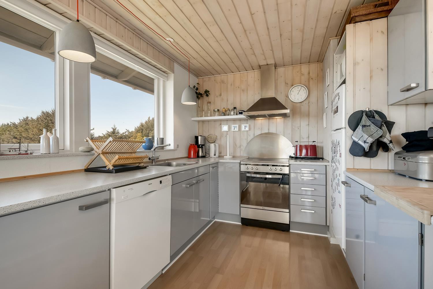 Godt udnyttet feriehus på ca. 75 m2 med kig til de høje klitter ved Vesterhavet. 2 soveværelser (1DS, 2ES+1KS). Huset seneste større renovering var 2006, men huset bliver løbende vedligeholdt og renoveret. Huset er indrettet med lædermøbler, spiseplads, samt-TV med danske og tyske programmer samt mulighed for streaming af TV / radio / Apps. Radio og CD-afspiller. En hyggelig brændeovn samt varmepumpe søger for en billigere el-regning og ekstra hygge samt varme til de rå dage ved Vesterhavet. Praktisk køkkenhjørne med bl.a. opvaskemaskine, komfur med keramiske kogeplade, emhætte, mikroovn samt køleskab med fryseboks. Badeværelse med toilet, håndvask, bruseniche og klinkegulv samt vaskemaskine. Der er praktiske træ gulve i alle opholds- og soverum. Max. 1 husdyr tilladt. Ikke ryger hus.