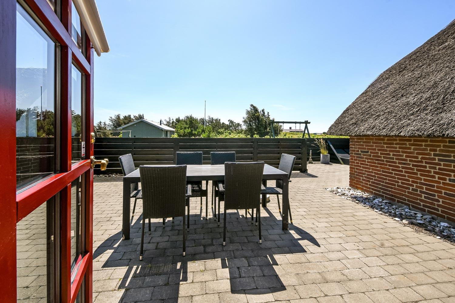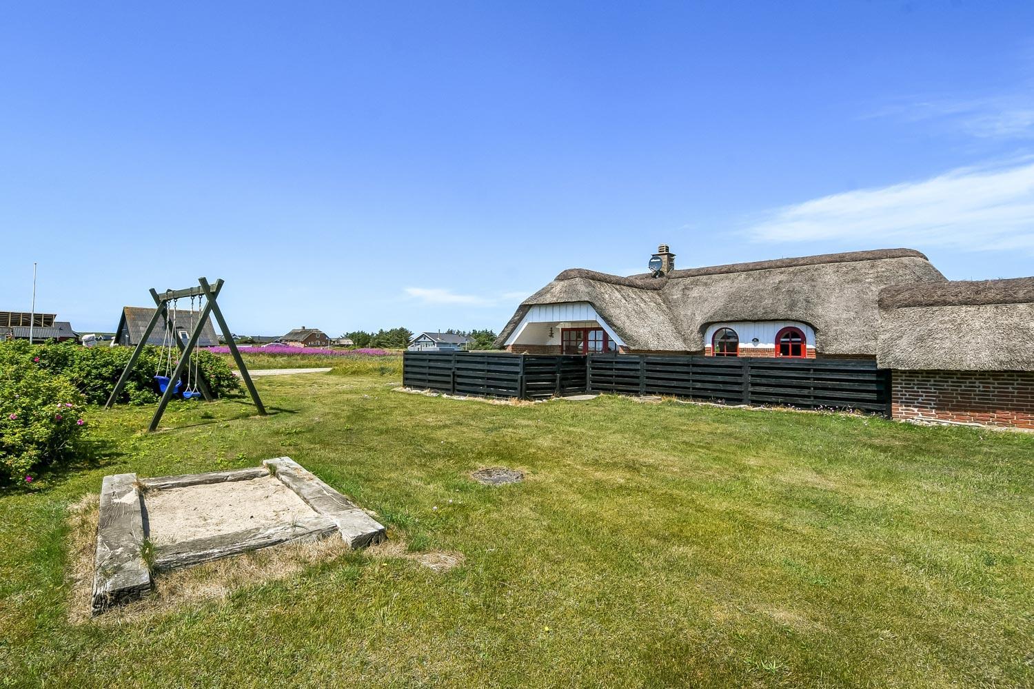 Huset er beliggende på en 2100 m2 naturgrund blot 350 m fra Vesterhavet. Der er en dejligt lukket terrasse med havemøbler, solvogne og gasgrill. Til de mindste gæster er der gynger og sandkasse. Der er en carport til bilen + oplader til el-bil. Huset ligger i gåafstand til Vesterhavet som hver dag byder på nye maleriske oplevelser. Stranden byder på mange aktiviteter såsom samle sten og rav, fiske, bade, flyve med drager eller blot sidde og nyde den fantastiske udsigt over Vesterhavet. I kort afstand med bil kan man besøge fiskerbyen Thyborøn som har mange gode spisesteder, butikker og attraktioner. Den gamle handelsby Lemvig ligger heller ikke langt fra huset og her man en dejlig havnepromenade med legeplads, butikker, museer og flere gode spisesteder. Et virkeligt attraktivt ferietilbud uanset årstiden.