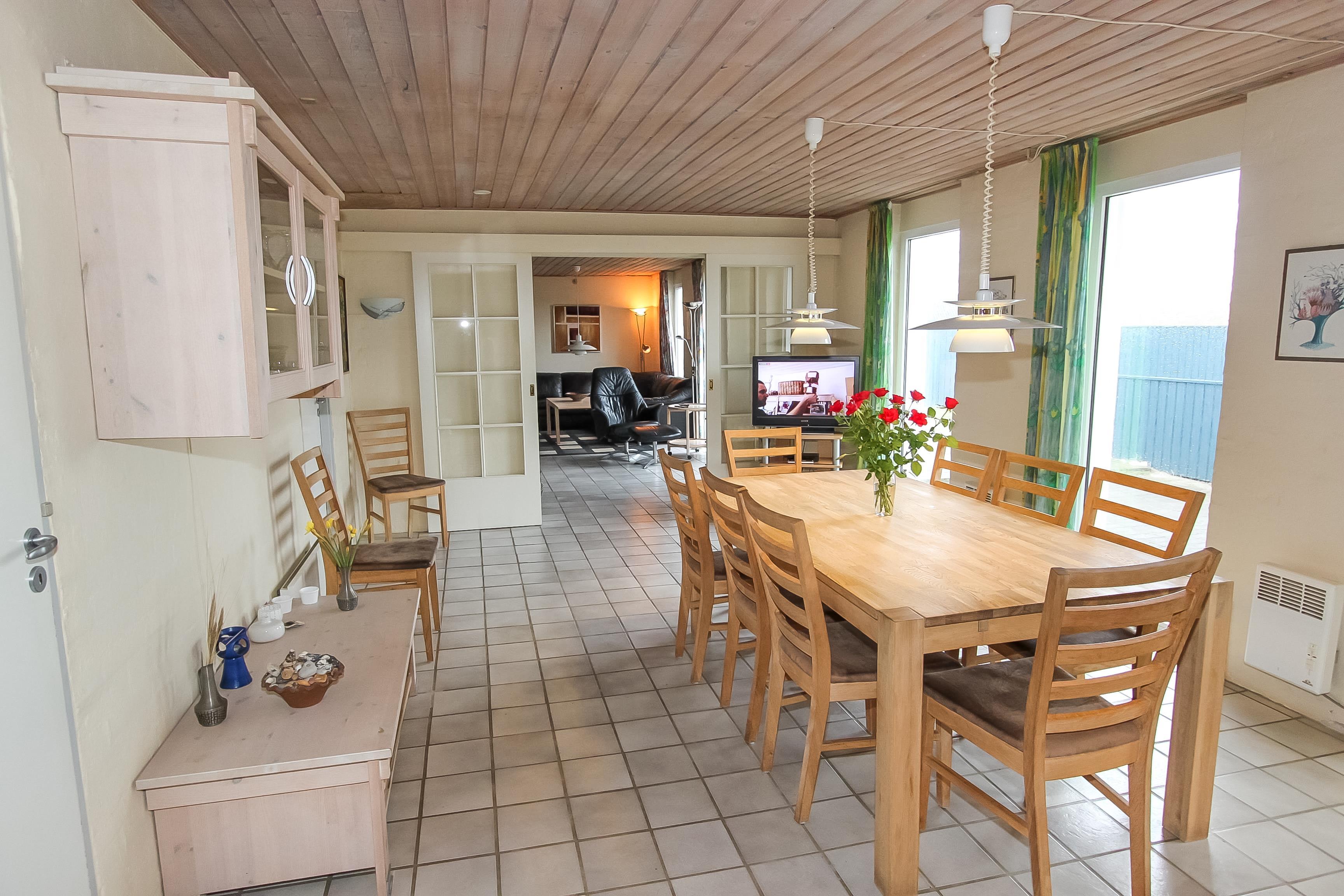 Huset har et stort køkken hvor man kan samtale til spisebordet. Her er næsten alt hvad man typisk har i hjemmet: Glaskeramisk komfur, mikrobølgeovn, køle/fryseskab, separat fryser på 60 liter samt en opvaskemaskine. Stien ligger i forlængelse af køkkenet og byder på fladskærm med DR samt tyske kanaler, CD-afspiller og DVD-afspiller. Herudover er der en hyggelig sofragruppe med stuebord samt en brændeovn.