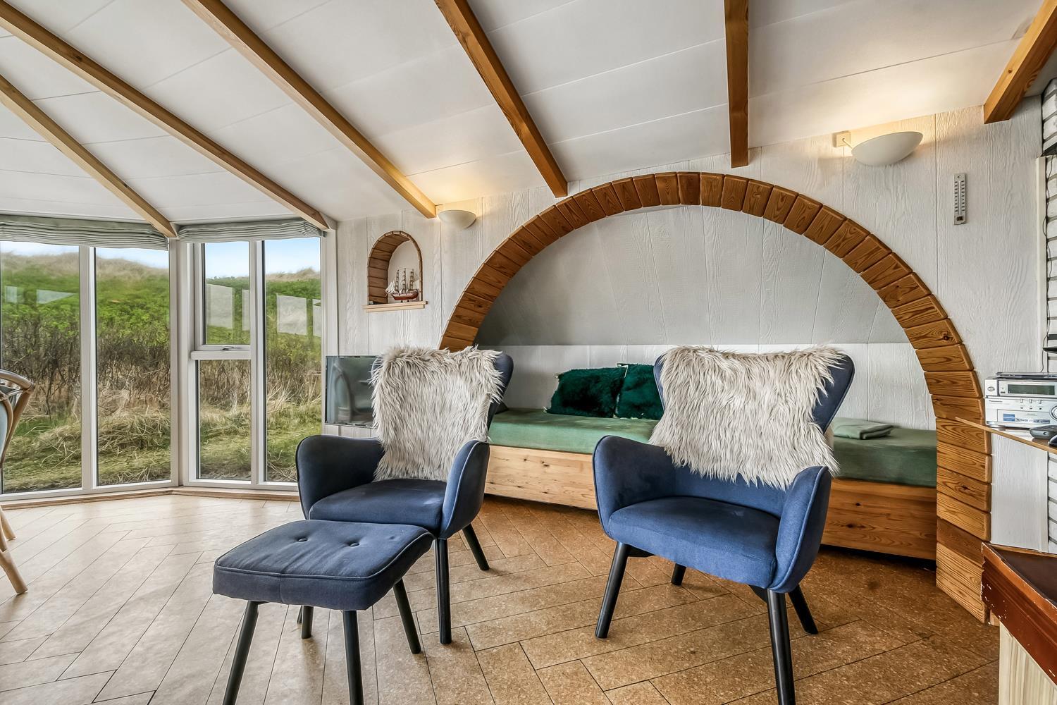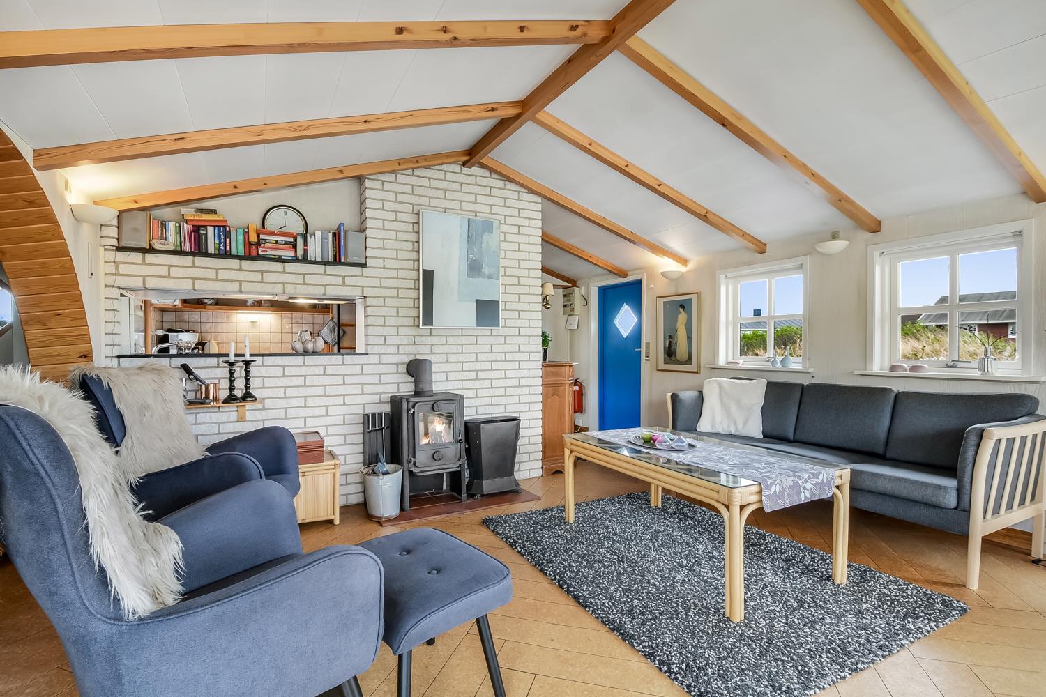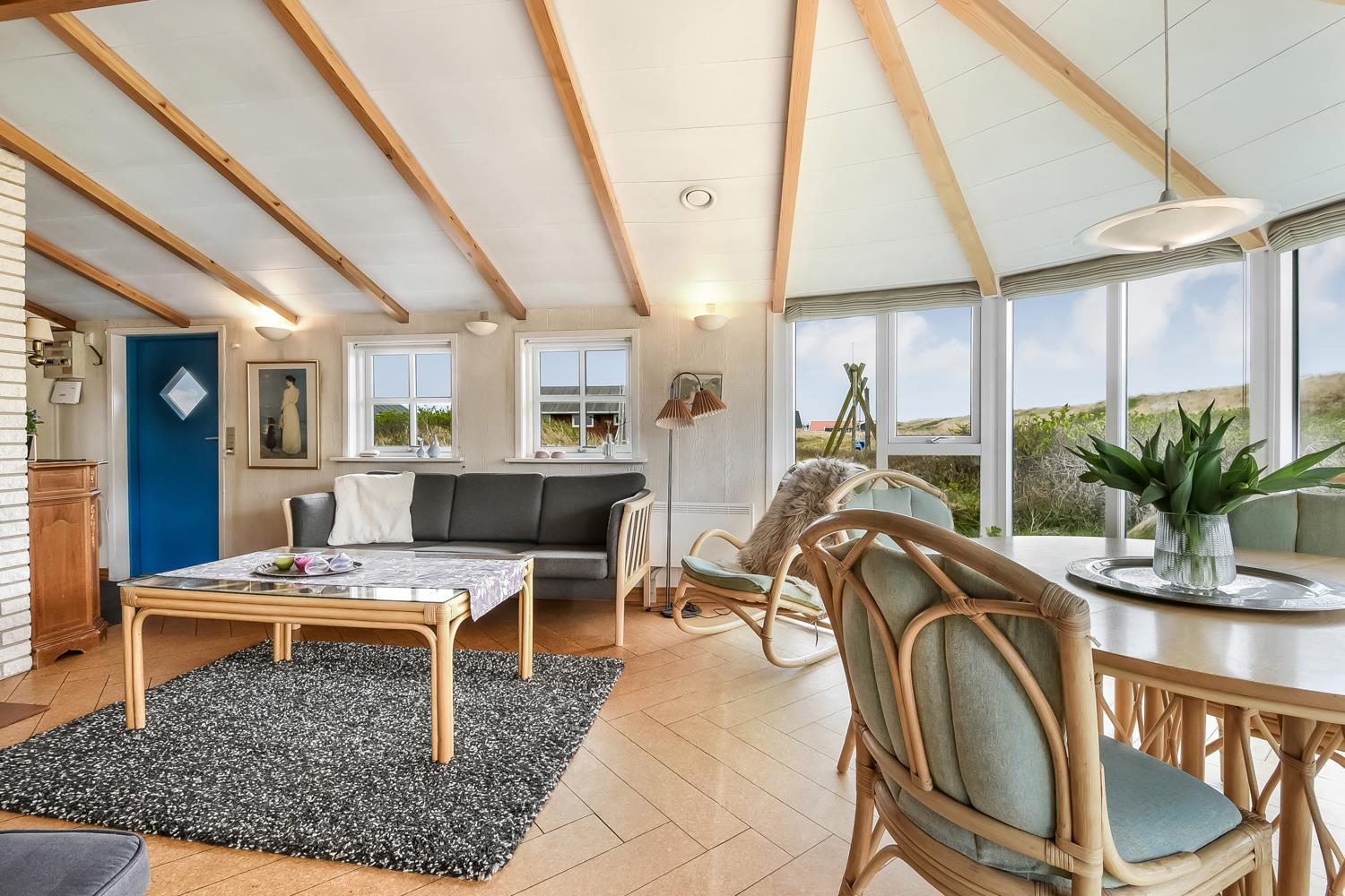 Stuen er dejlig lys med synlige loftsbjælker, hvor en stor glaskarnap bidrager til et godt lysindfald. Desuden peger glaskarnappen lige ud til klitterne, hvor Vesterhavet gemmer sig bag, så man har en skøn udsigt ved alle måltider ved spisebordet. Stuen er indrettet med polstermøbler og Smart-TV med danske og tyske kanaler, og man kan streame egne streamingtjenester. Ydermere er der DVD- og CD-afspiller og også en radio. I stuen er der også en stor alkove, som udgør to sovepladser.