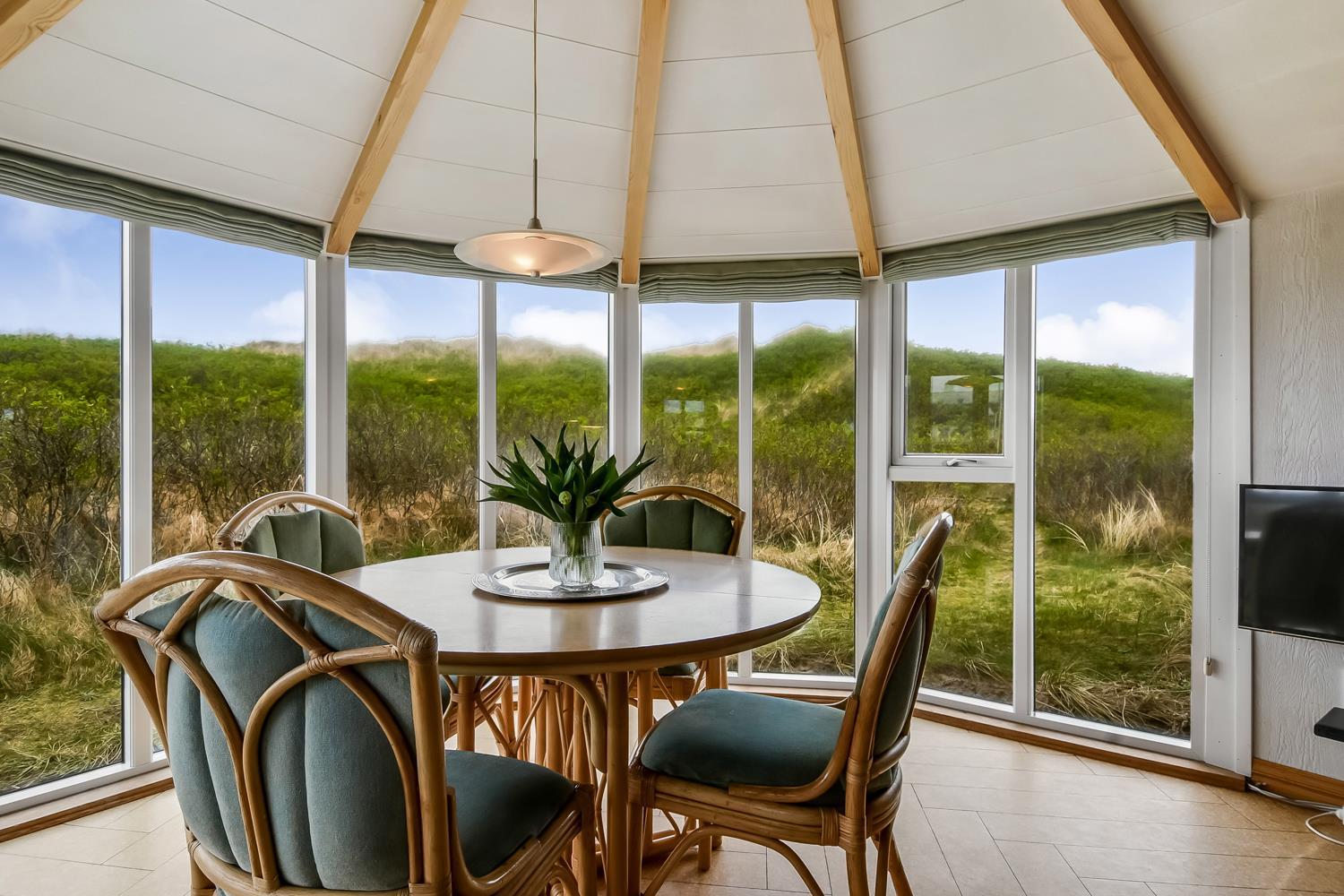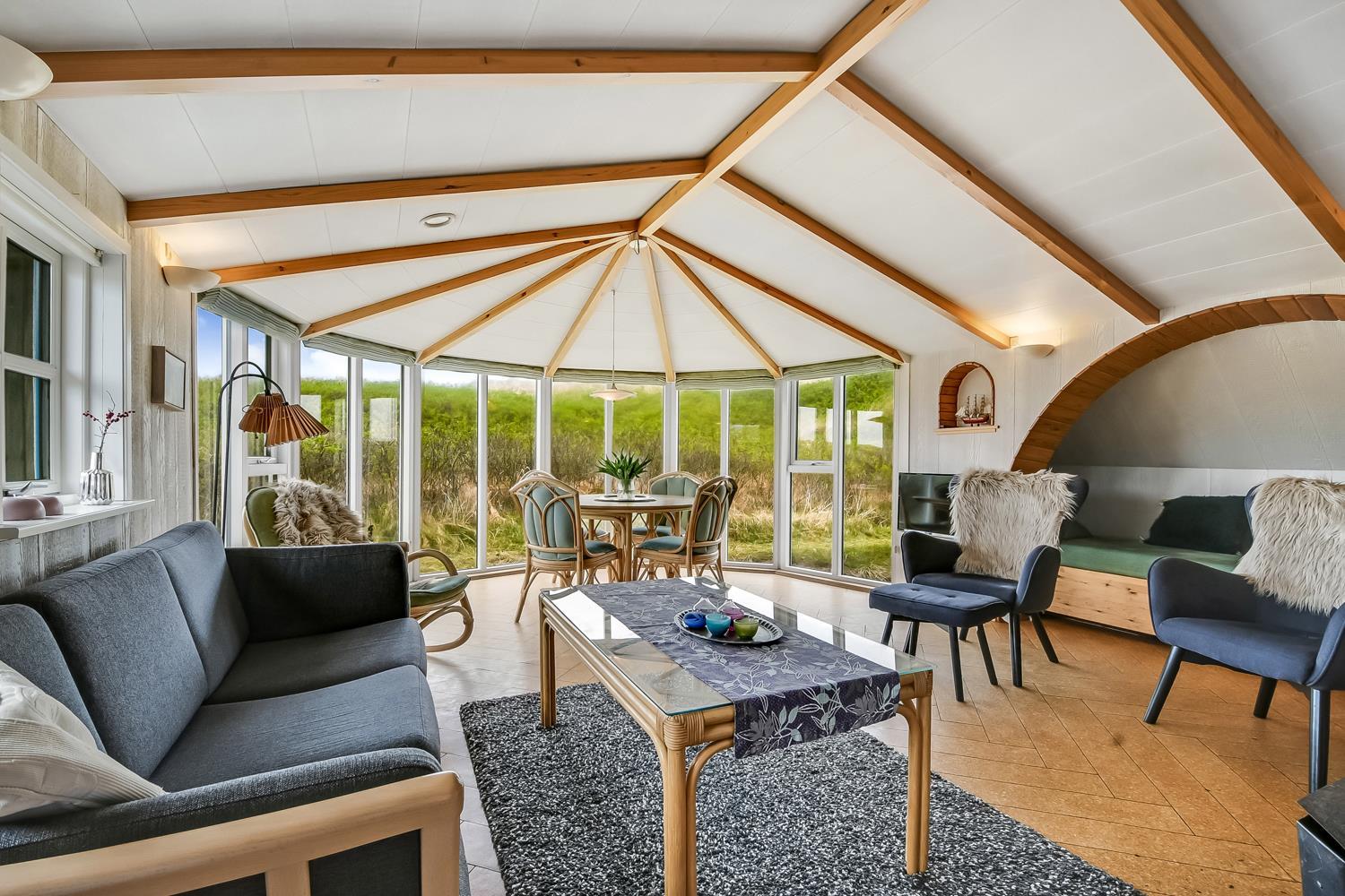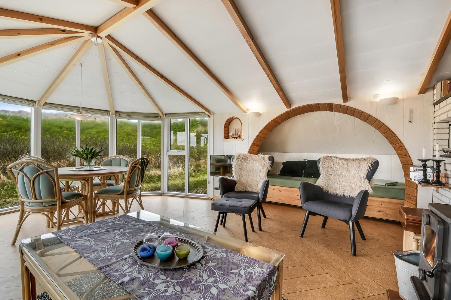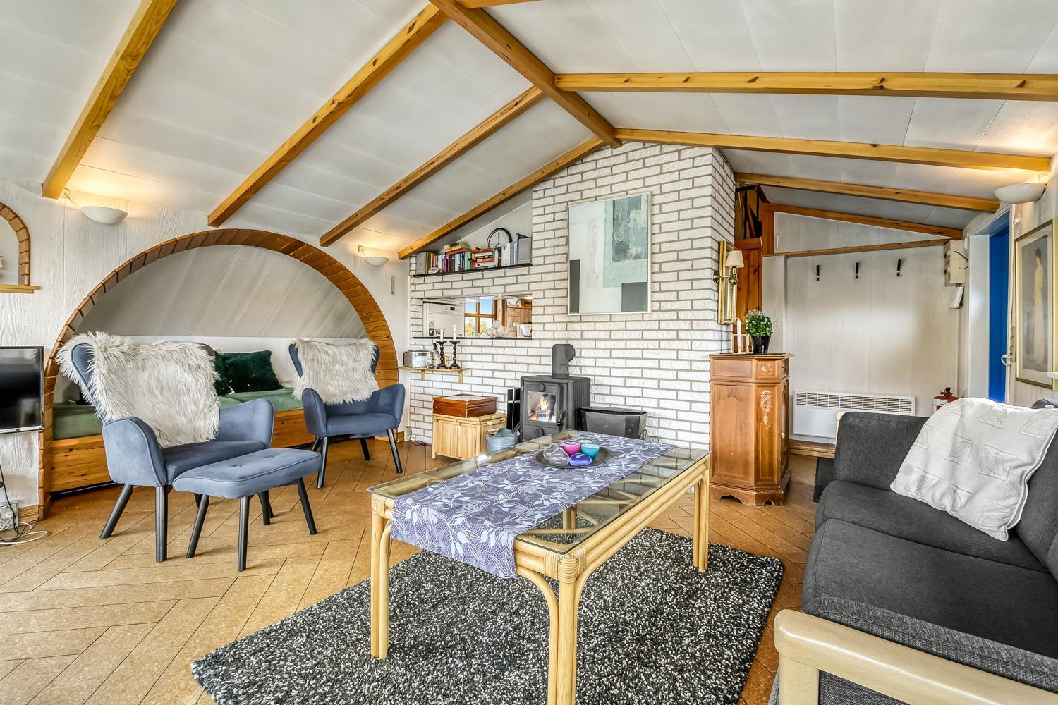 Stuen er dejlig lys med synlige loftsbjælker, hvor en stor glaskarnap bidrager til et godt lysindfald. Desuden peger glaskarnappen lige ud til klitterne, hvor Vesterhavet gemmer sig bag, så man har en skøn udsigt ved alle måltider ved spisebordet. Stuen er indrettet med polstermøbler og Smart-TV med danske og tyske kanaler, og man kan streame egne streamingtjenester. Ydermere er der DVD- og CD-afspiller og også en radio. I stuen er der også en stor alkove, som udgør to sovepladser.
