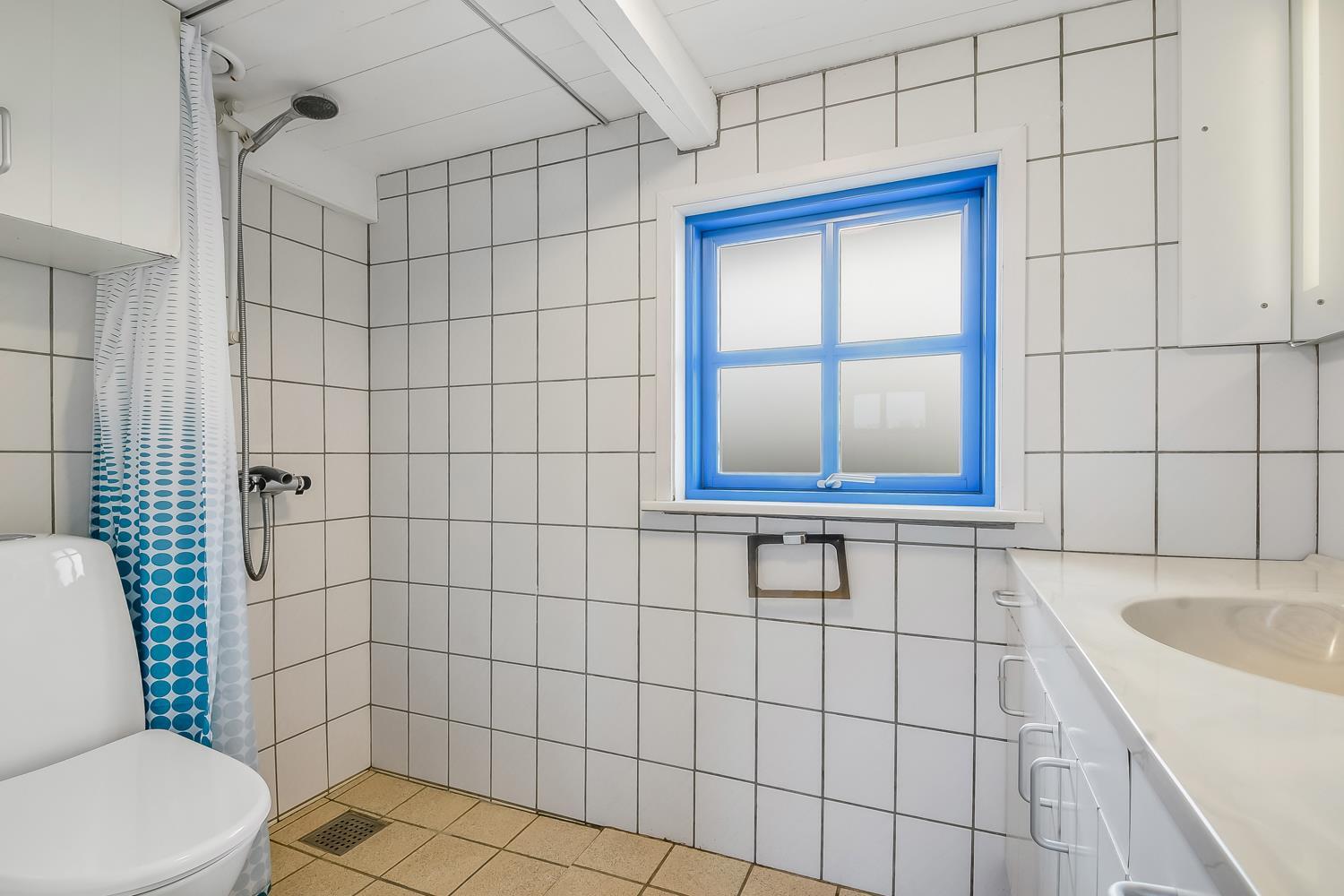 Det sidste rum i huset er badeværelset. Her er der toilet, håndvask og en bruser.