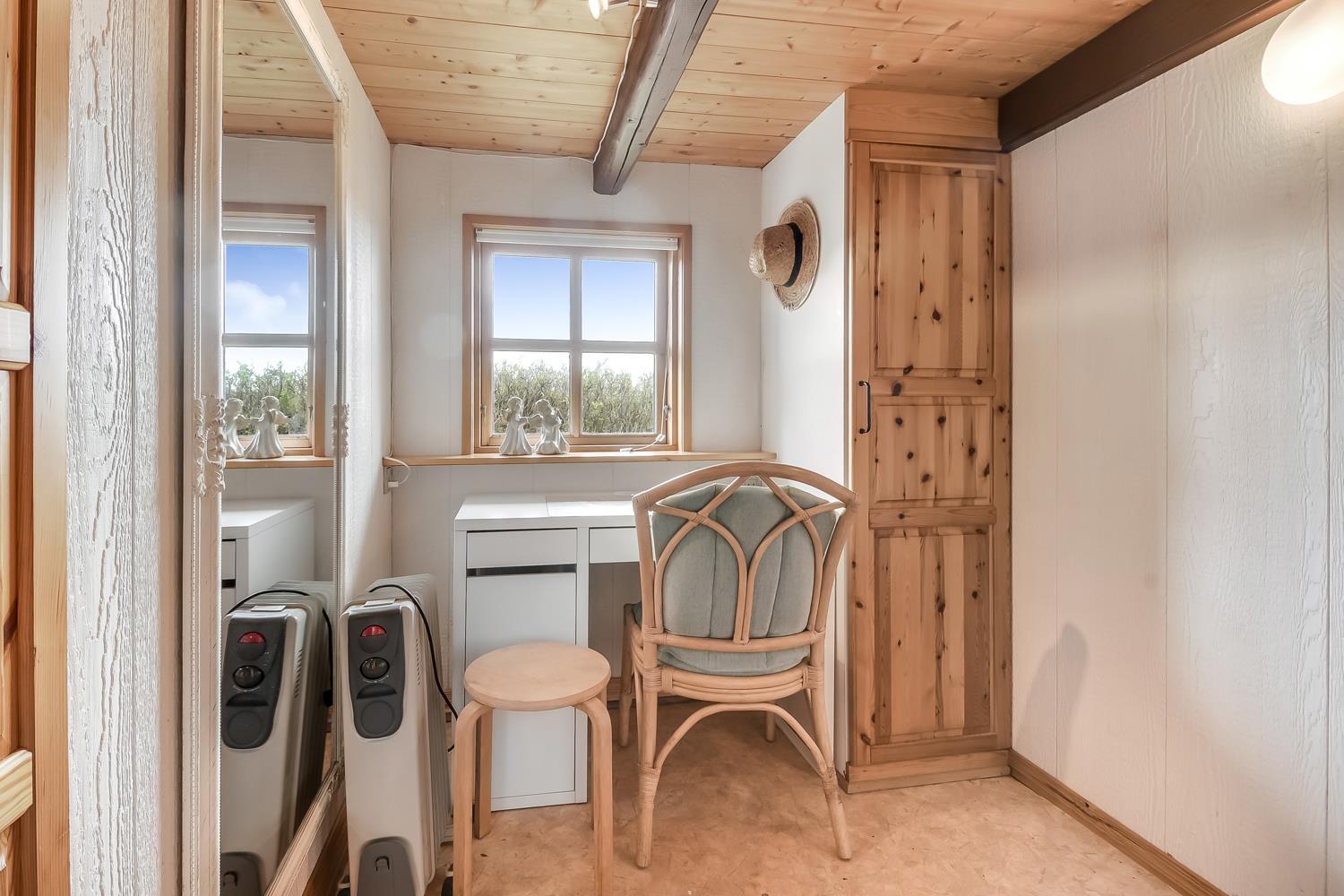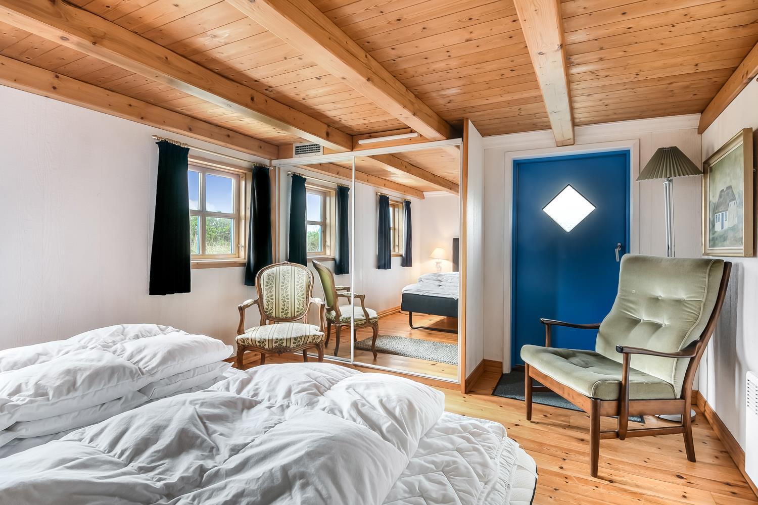 De sidste to sovepladser, findes for enden af huset i soveværelset. Her er der en stor dobbelt seng. Vær dog opmærksom på at loftshøjden i soveværelset er ca. 1,85 meter men kun 1,72 meter under bjælkerne.