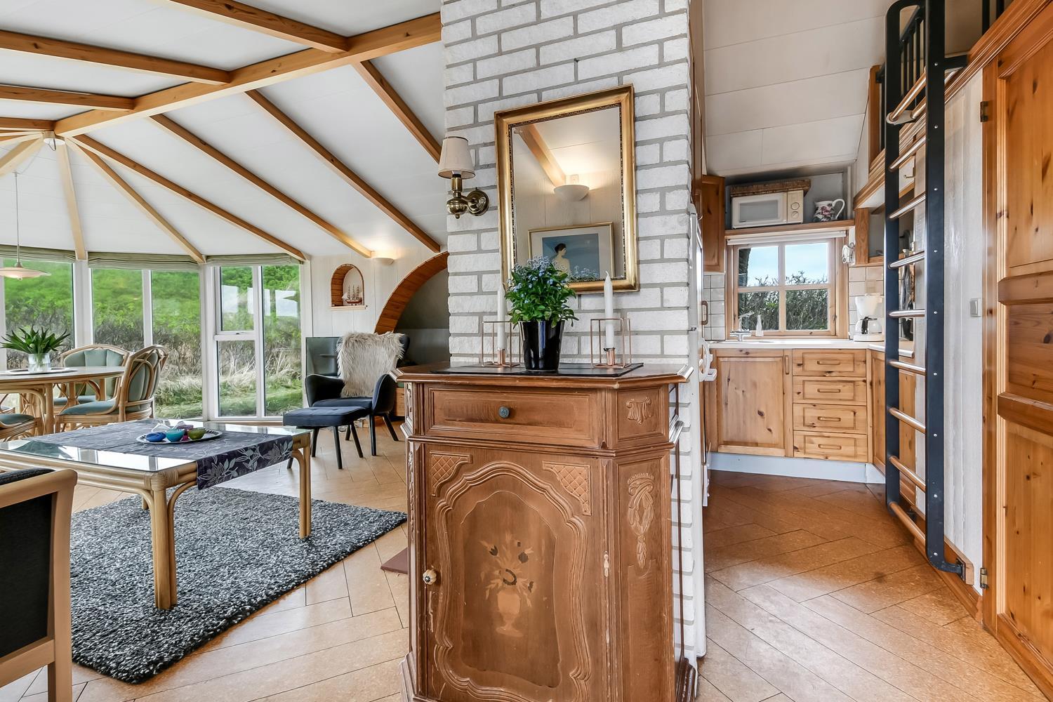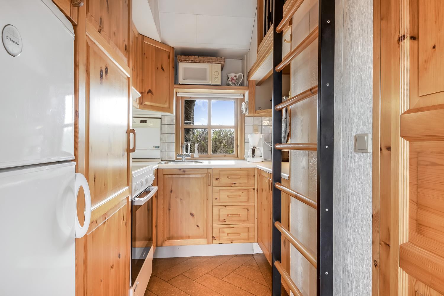 Når man træder ind ad husets hoveddør, står man allerede i husets kernerum, som består af køkken og stue. Køkkenet er smalt, men veludstyret med alt man skal bruge til at holde en afslappet ferie. Der er blandt andet et glaskeramisk komfur, emhætte, bord-opvaskemaskine, køle-/fryseskab og mikroovn. I køkkenet er der en stige op til hemsen, hvor der er tre sovepladser.