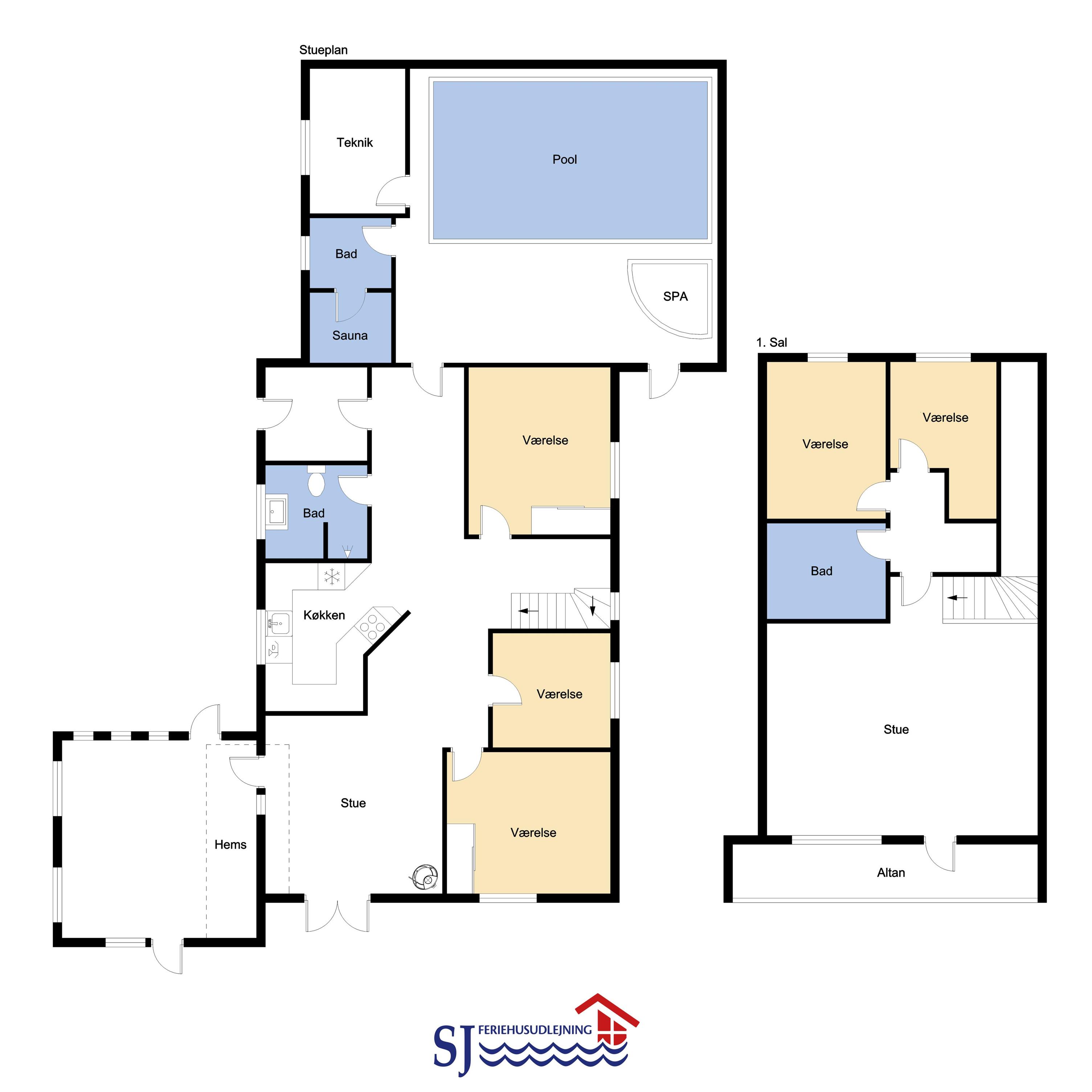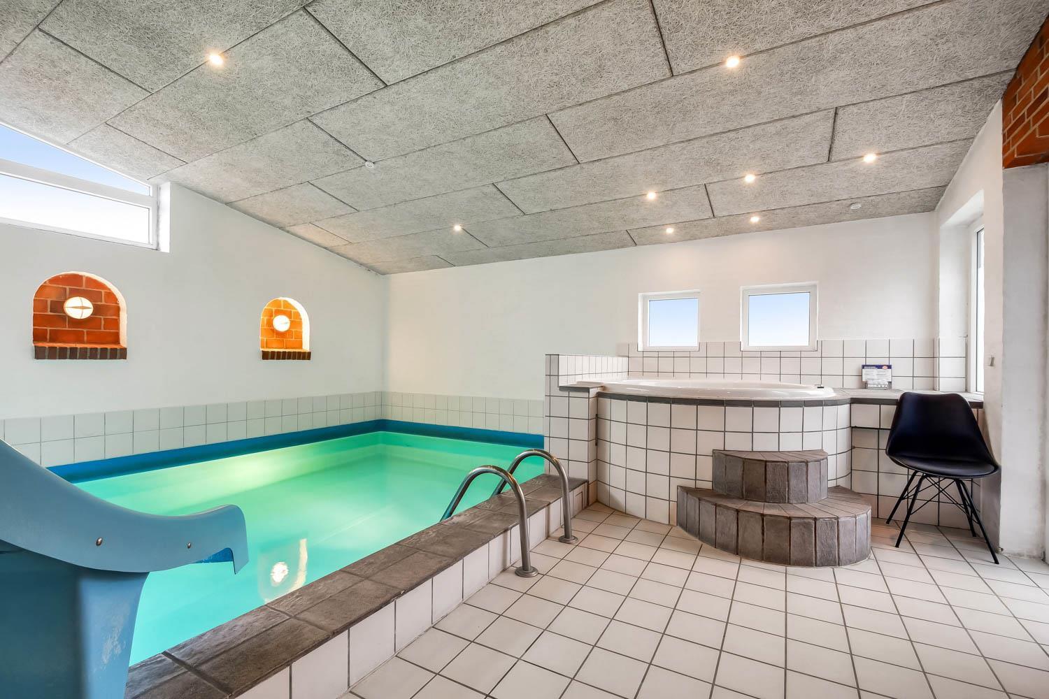 Huset er indrettet med 5 soverum, 3 med dobbeltsenge, 1 med 4 køjer, 1 med 3 enkeltsenge og 1 hems med 2 liggemuligheder. Desuden er der 3 badeværelser: toilet, håndvask og bruser. Stor poolafdeling med stor pool med svømmetræner, 4 pers. spa, sauna og toilet med brus. Der er installeret varmepumpe i huset.