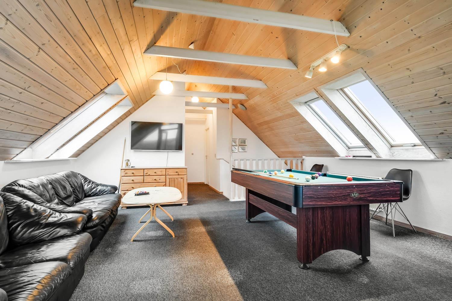 Velindrettet feriehus med dejlig stue som er kombineret med køkken/alrum. I stuen der der loft til kip og store vinduespartier, som giver et fantastisk lysindfald. På 1. sal er der 2 af husets værelser samt et badeværelse med toilet, håndvask og bruser og en skøn stue, hvorfra der er en dejlig udsigt over landskabet. Huset har ialt 4 stk farve-TV med parabol (kun tyske programmer), 2 steroanlæg med CD, den ene med højttalere til poolrummet.