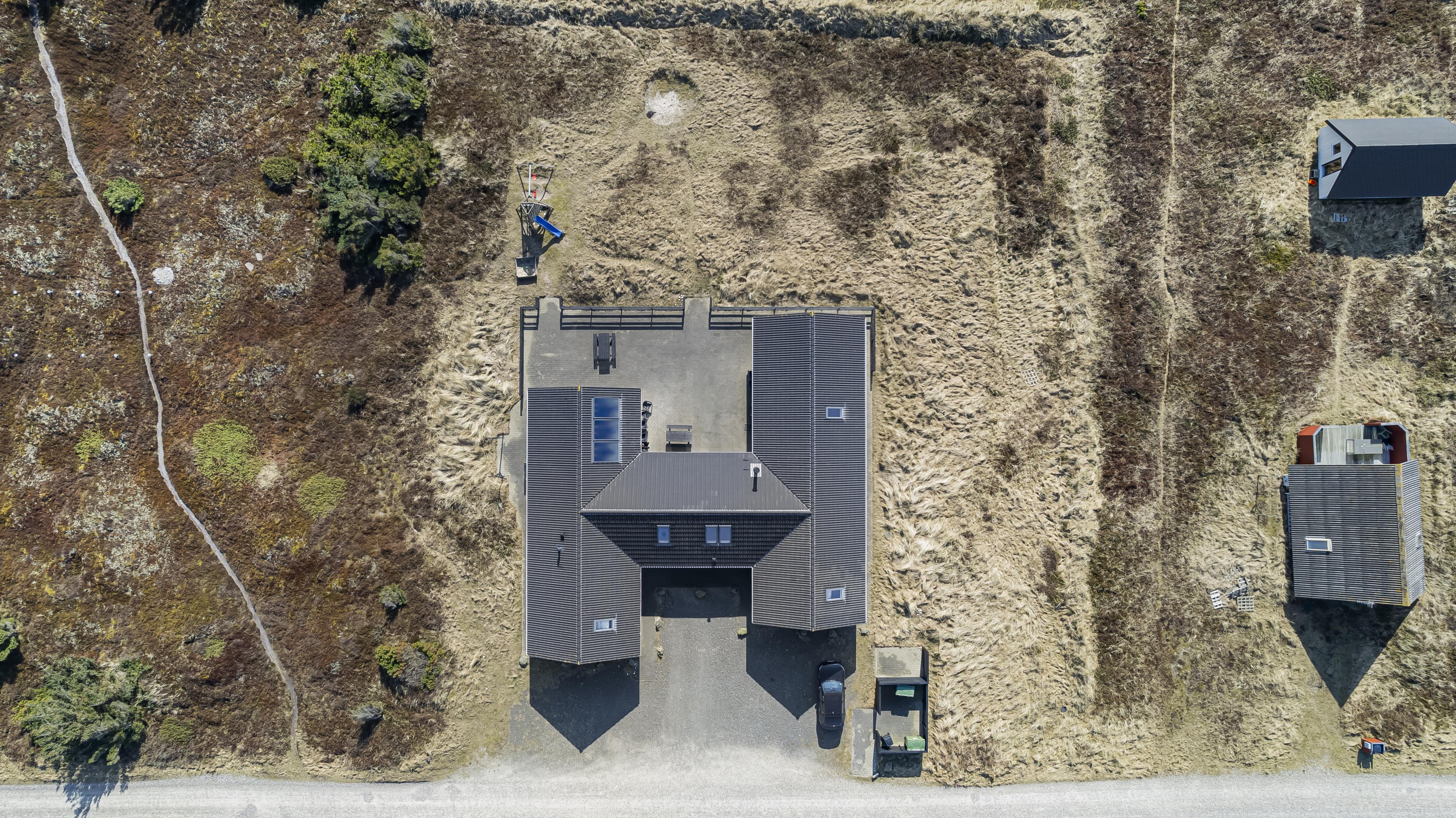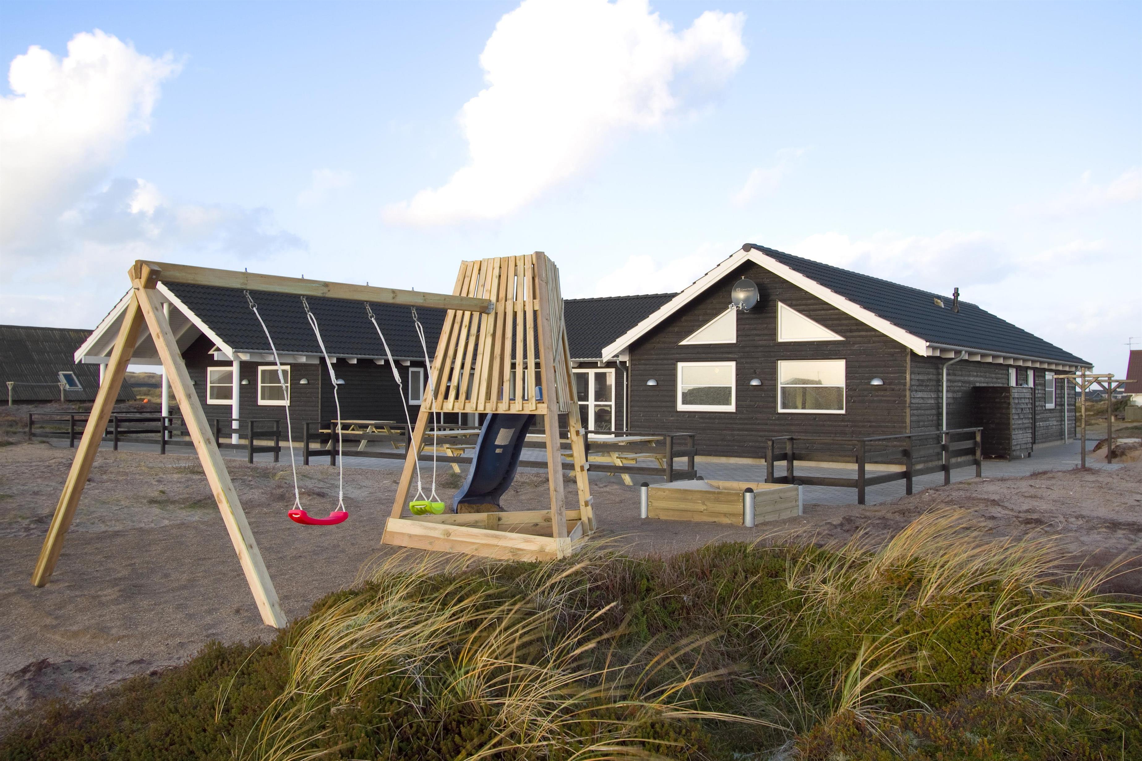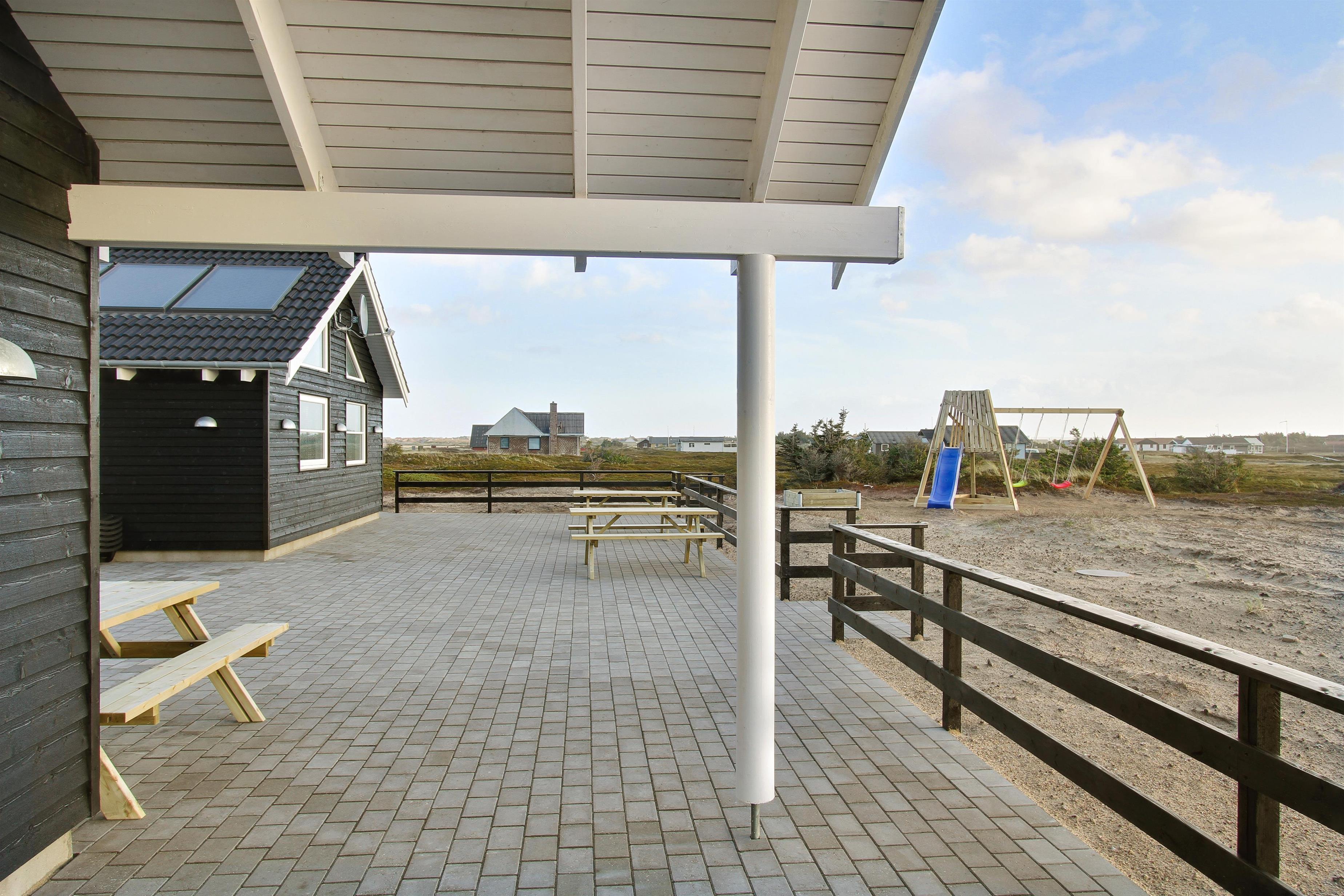 Huset er har en fantastisk, delvis overdækket terrasse, hvor man altid har mulighed for at finde læ på feriens solrige dage. Her finder man naturligvis bord/bækesæt i og fiskerenseplads og grill. Gyngestativ til børnene. Det er også tænkt på de 4-benede familiemedlemmer som har deres helt egen hundegård. Dette storslåede feriehus er beliggende på en ca. 2.500 m2 skøn klitgrund i Vrist og indbyder til leg og boldspil kun ca. 150 m fra stranden. Huset ligger 1000 meter fra dagligvarebutikker. Indenfor kort køreafstand nåes både den aktive handelsby i Lemvig med flere specialbutikker eller den unikke fiskerby Thyborøn, som udover den aktive fiskerihavn også byder på badestrand og op til flere aktivitetstilbud, som alle er et besøg værd.