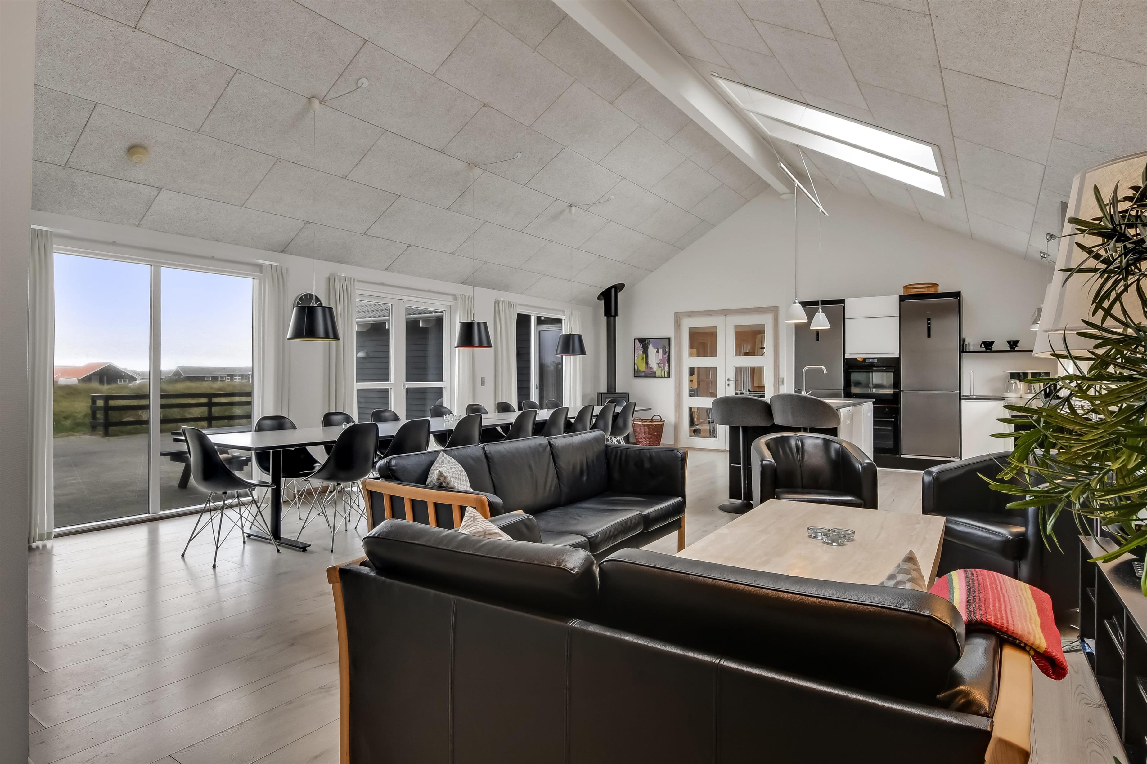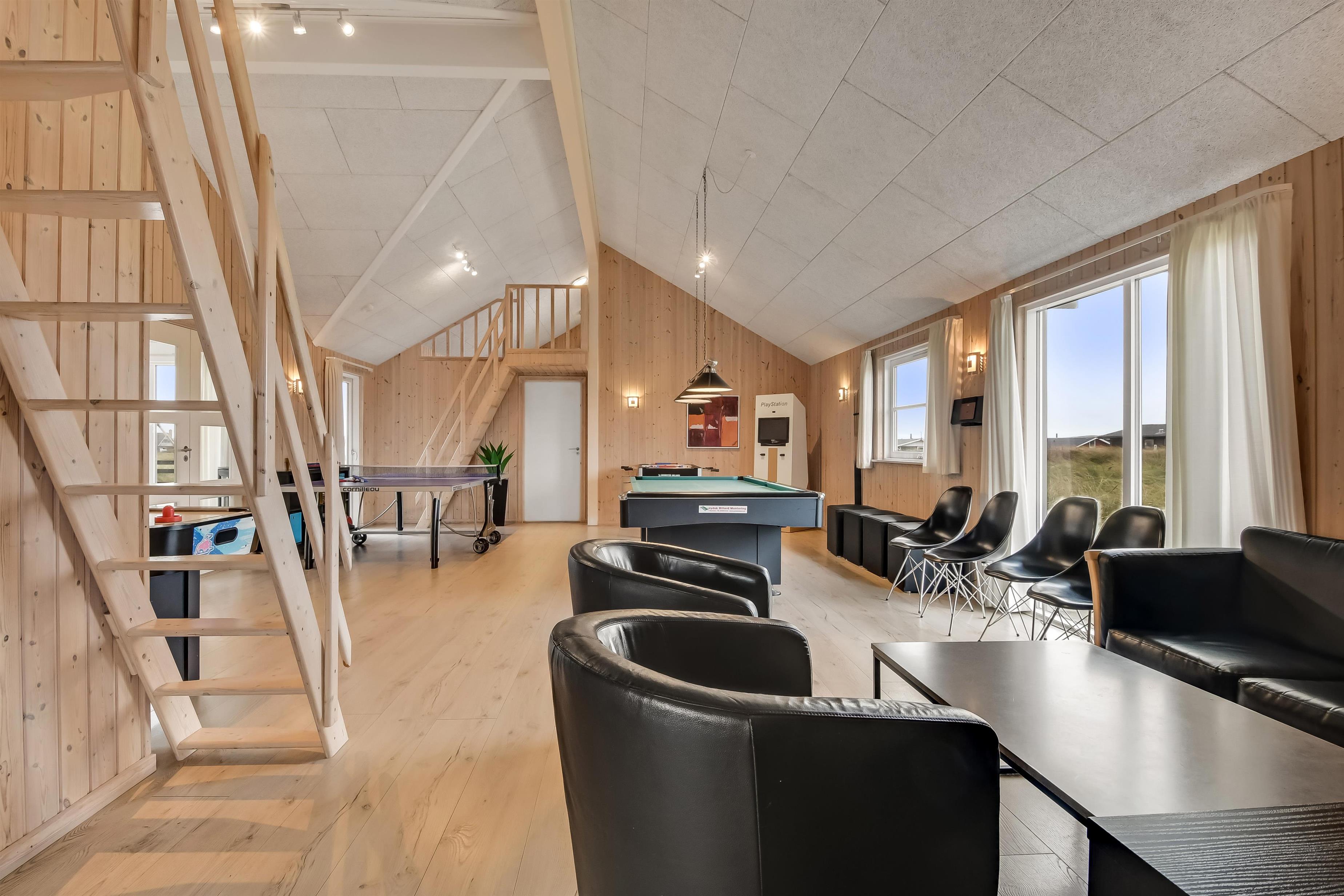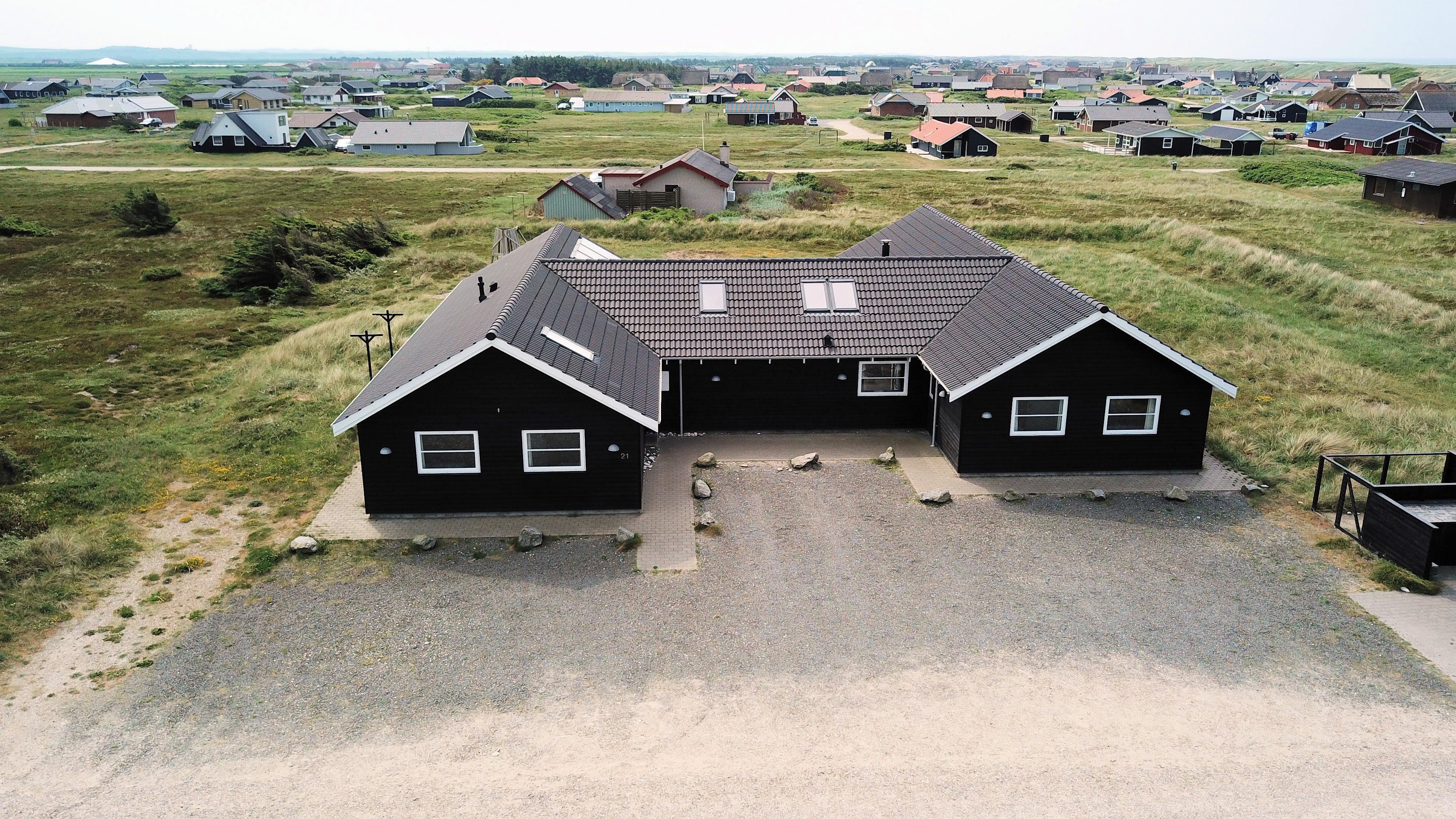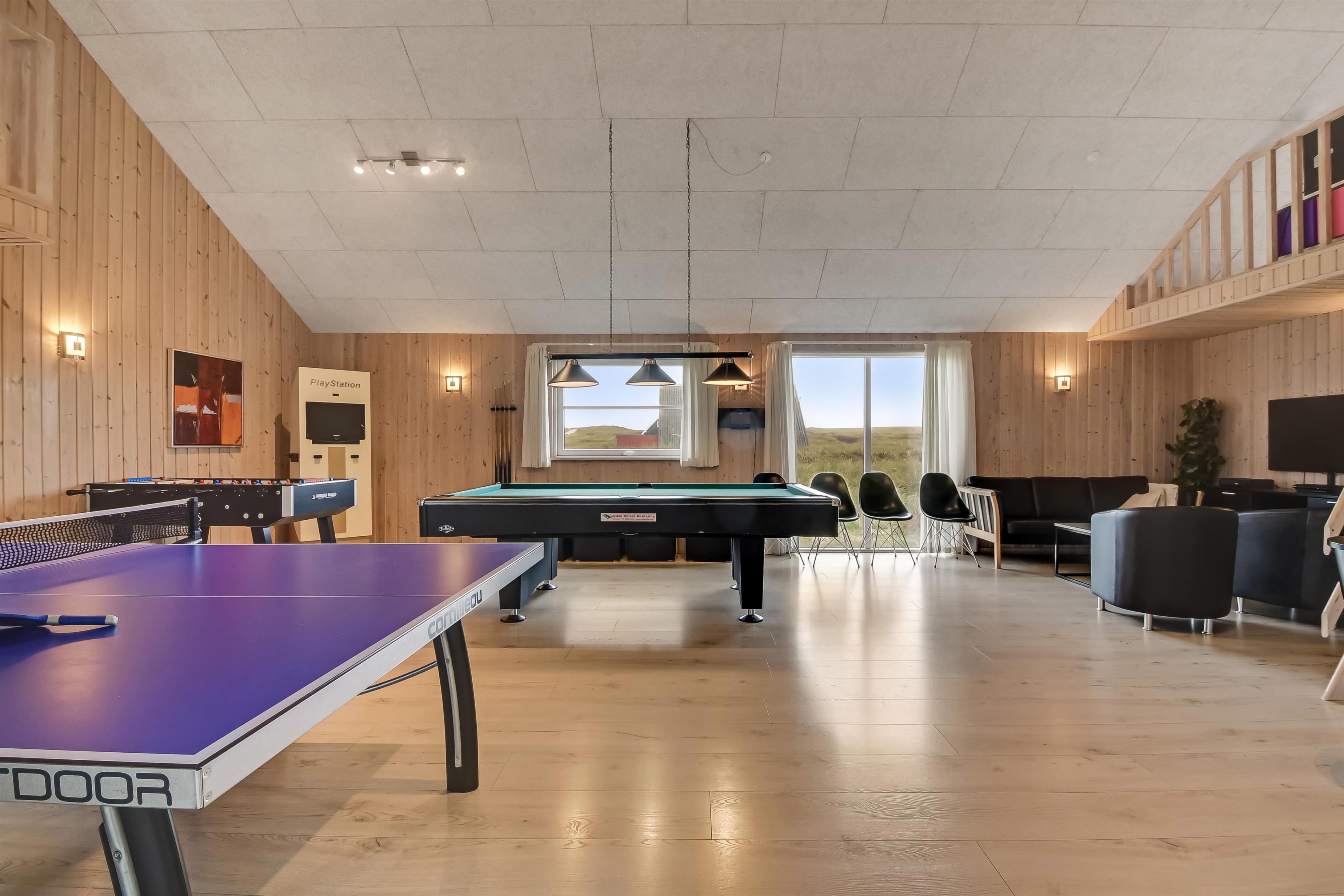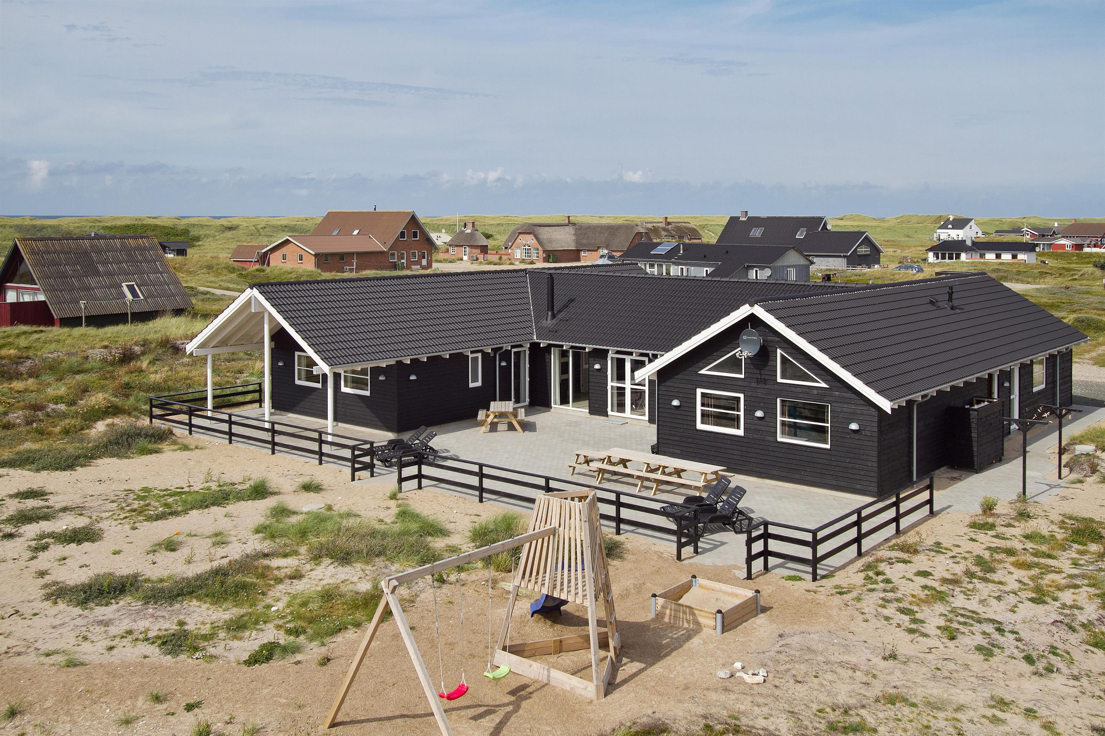 Velindrettet, nyere feriehus på 370 m2. 8 dejlige soverum (1DS, 1DS, 1DS, 1DS, 1DS, 1DS, 2 E, 2 E). Derudover forefindes 2 store hemse med hver 3 sovepladser samt en herlig legehems. Hemsene, kan ikke aflåses og voksne kan sagtens overnatte på hemsene. Huset er med et veludstyret køkken alrum med alt i hårde hvidevarer. 2 elektriske, keramiske kogeplader, 2 indbygningsovne, stor emhætte, 2 opvaskemaskiner, mikroovn, stort køleskab og separat, stor fryser (250 L). Alle 22 beboere kan samles om husets store spisebord som også er perfekt til spil og hyggesnak, og hvorfra man gennem et stor vindue har frit udsyn til husets poolafdeling. Kig til de store klitter bekræfter husets unikke beliggenhed. Slap af i de bløde kvalitetsmøbler. Se TV på dansk og tysk på et af husets 5 fjernsyn, hvor der også vil være mulighed for at afspille Blue-ray film på det ene TV. Der er klinker med gulvvarme i hele huset og trægulve i soveværelserne. Tænd op i brændeovnen som let hjælper med opvarmningen eller blot sørger for en hyggelig stemning.
