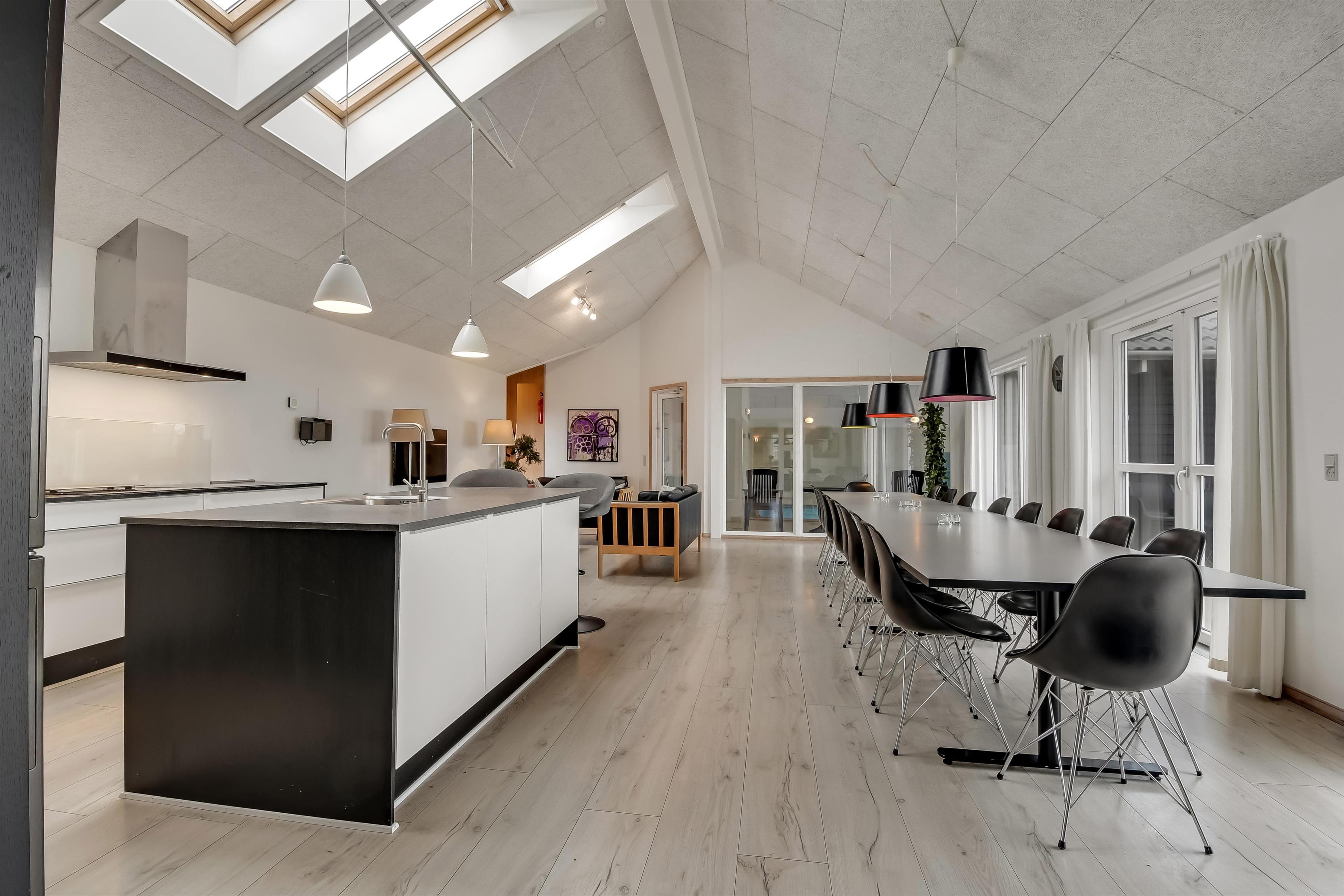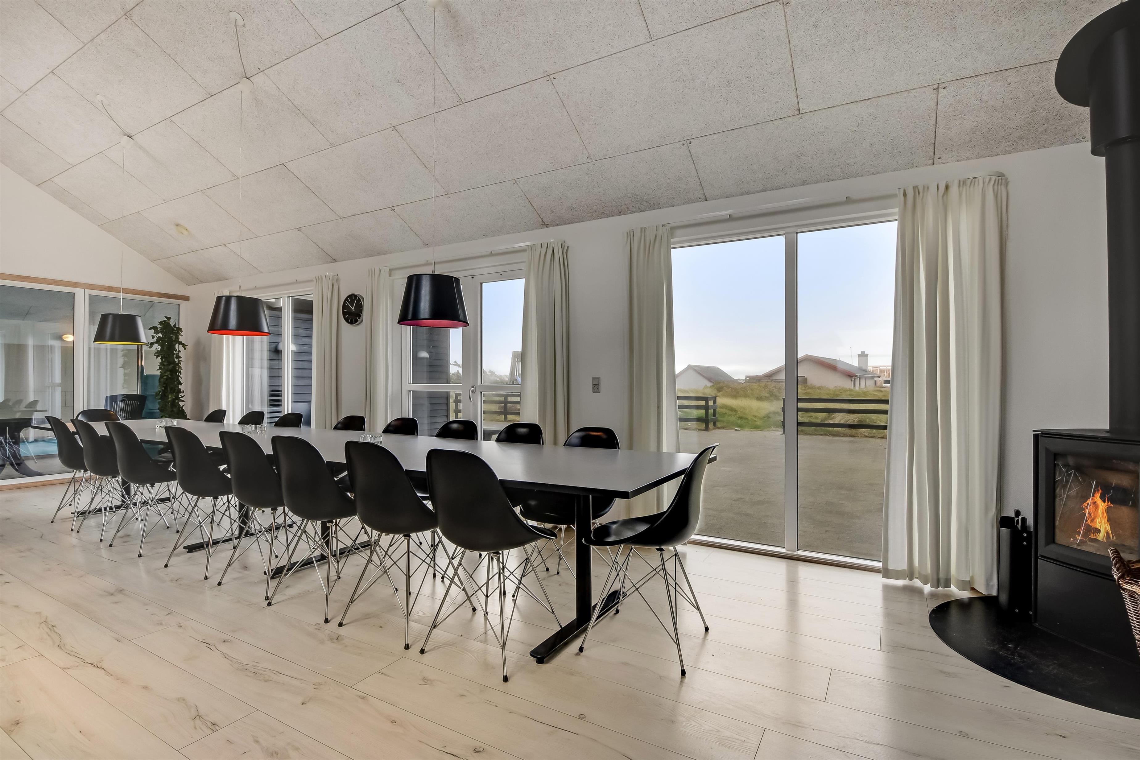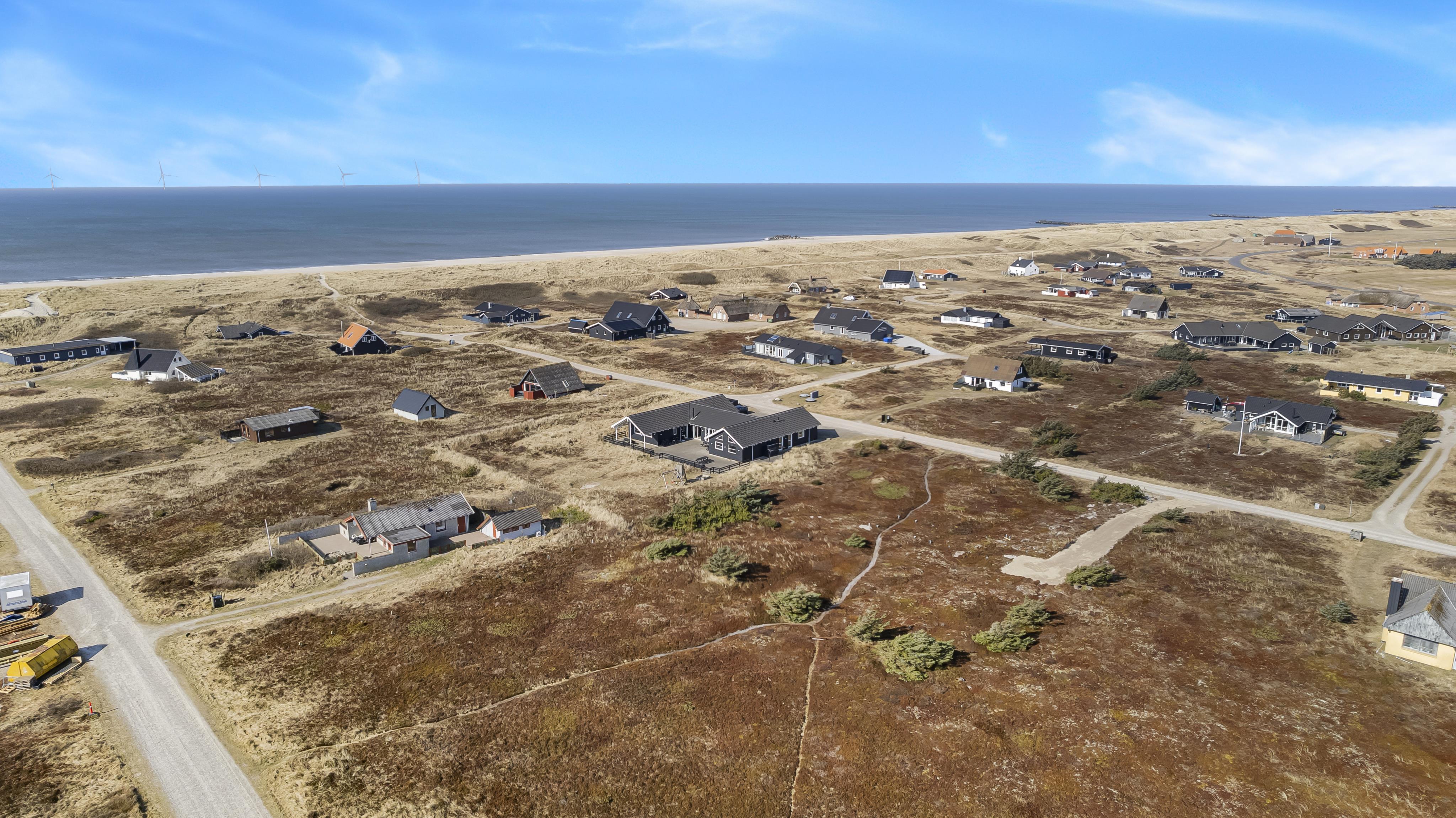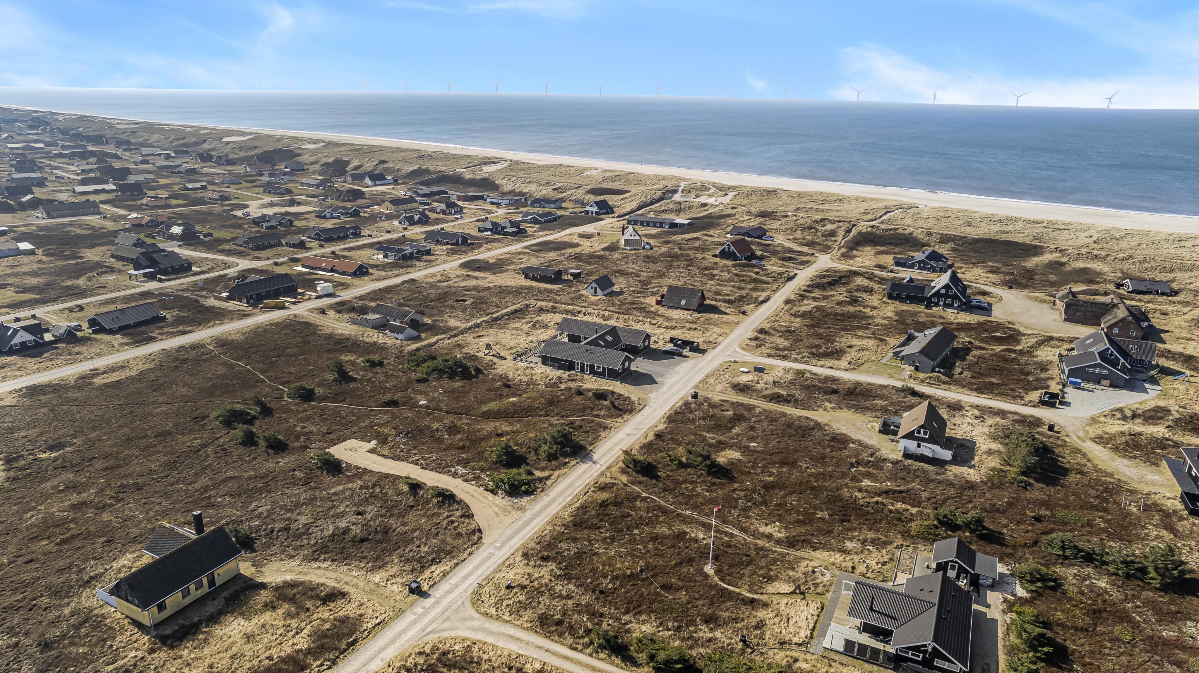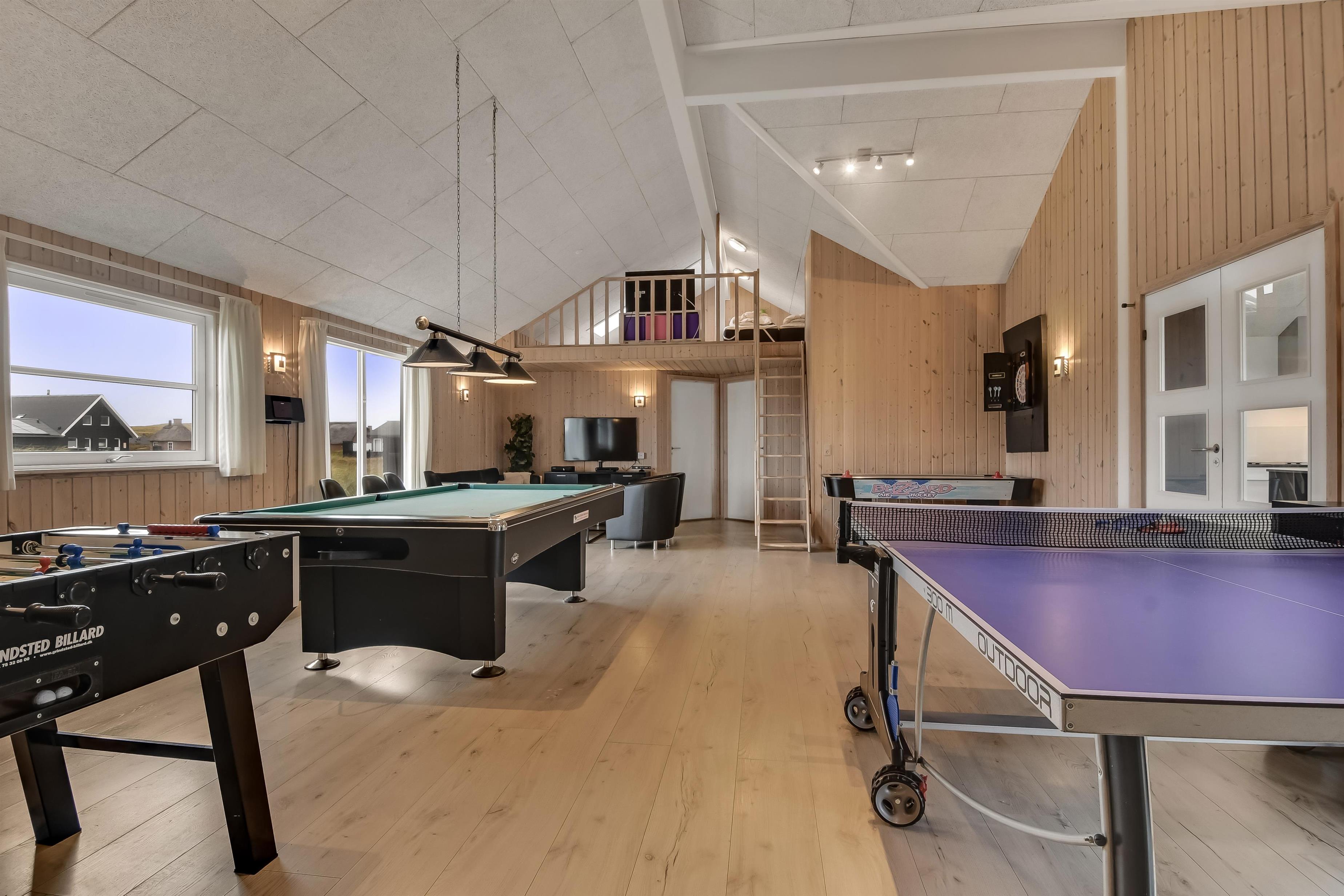 Velindrettet, nyere feriehus på 370 m2. 8 dejlige soverum (1DS, 1DS, 1DS, 1DS, 1DS, 1DS, 2 E, 2 E). Derudover forefindes 2 store hemse med hver 3 sovepladser samt en herlig legehems. Hemsene, kan ikke aflåses og voksne kan sagtens overnatte på hemsene. Huset er med et veludstyret køkken alrum med alt i hårde hvidevarer. 2 elektriske, keramiske kogeplader, 2 indbygningsovne, stor emhætte, 2 opvaskemaskiner, mikroovn, stort køleskab og separat, stor fryser (250 L). Alle 22 beboere kan samles om husets store spisebord som også er perfekt til spil og hyggesnak, og hvorfra man gennem et stor vindue har frit udsyn til husets poolafdeling. Kig til de store klitter bekræfter husets unikke beliggenhed. Slap af i de bløde kvalitetsmøbler. Se TV på dansk og tysk på et af husets 5 fjernsyn, hvor der også vil være mulighed for at afspille Blue-ray film på det ene TV. Der er klinker med gulvvarme i hele huset og trægulve i soveværelserne. Tænd op i brændeovnen som let hjælper med opvarmningen eller blot sørger for en hyggelig stemning.
